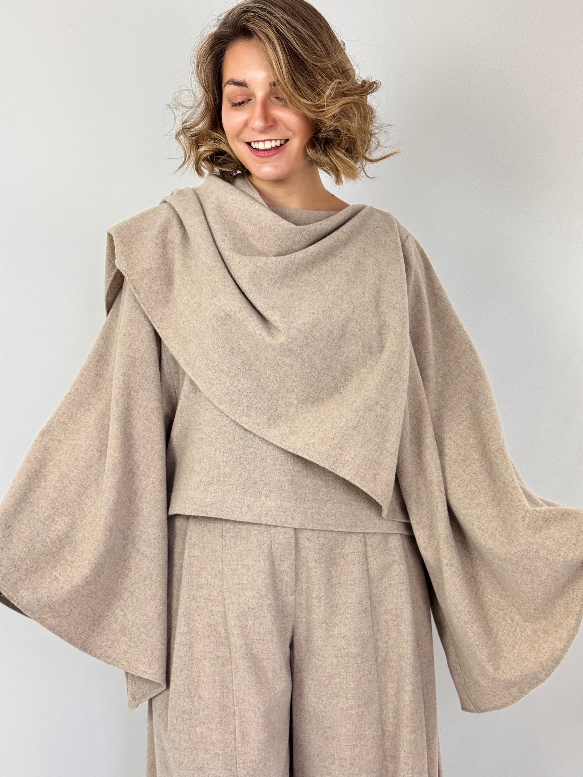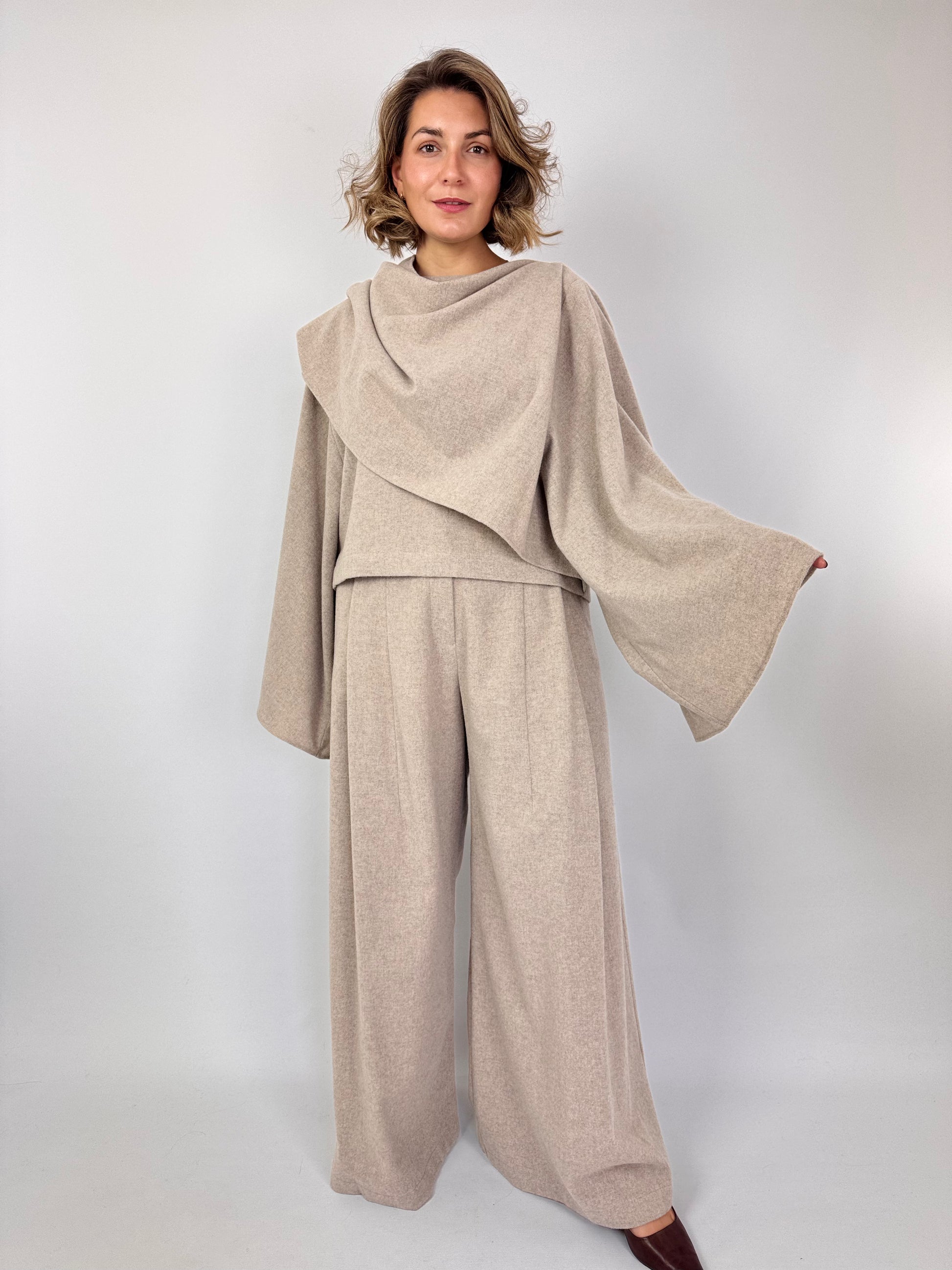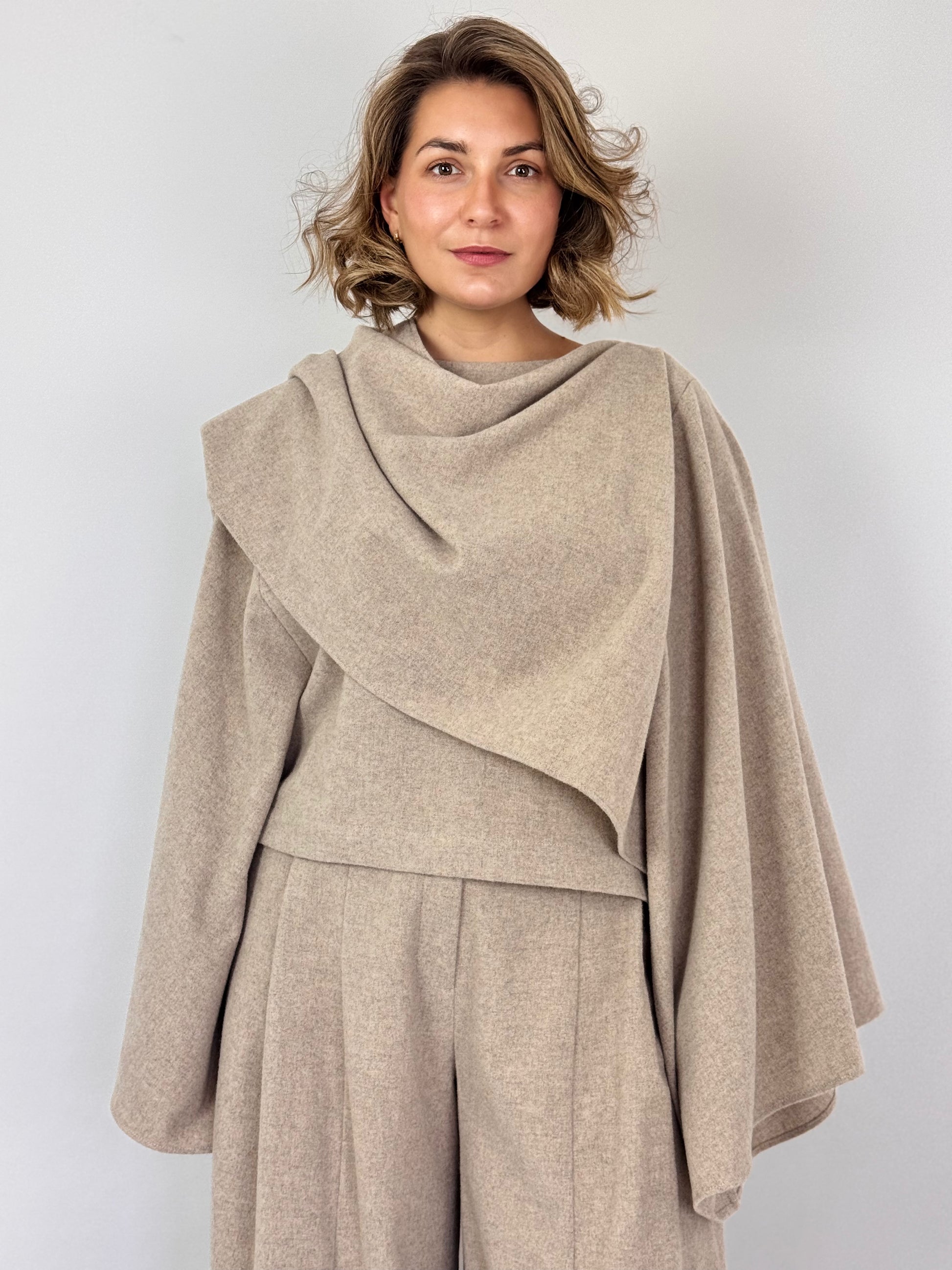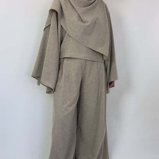 This smart and elegant top features a refined boat neckline and dramatic wide sleeves, enhanced by a distinctive attached shawl draped from one shoulder to the other. Its unique design offers a sophisticated silhouette, perfect for elevating your autumn wardrobe. Pair it seamlessly with the matching trousers for a polished and cohesive ensemble.