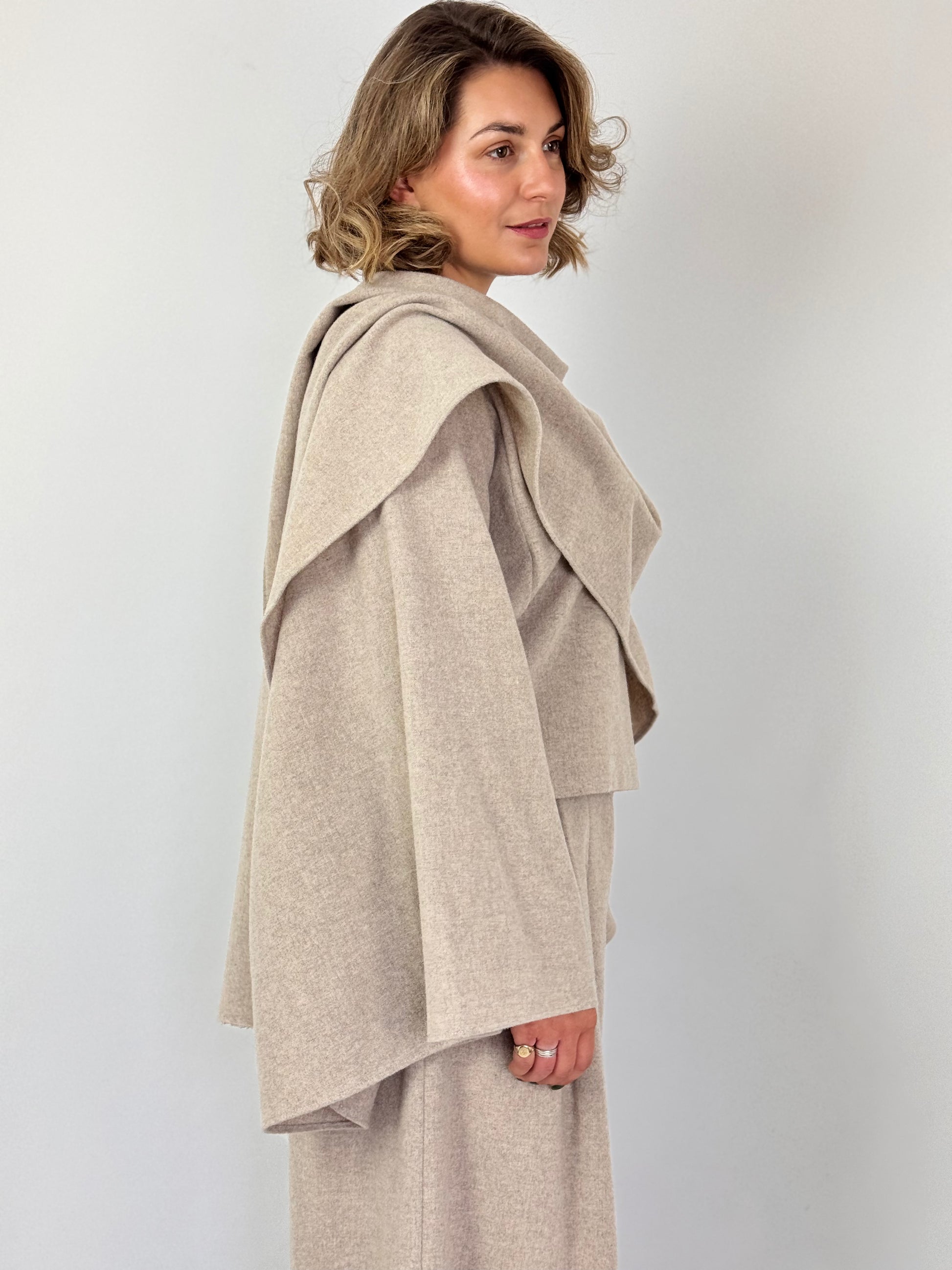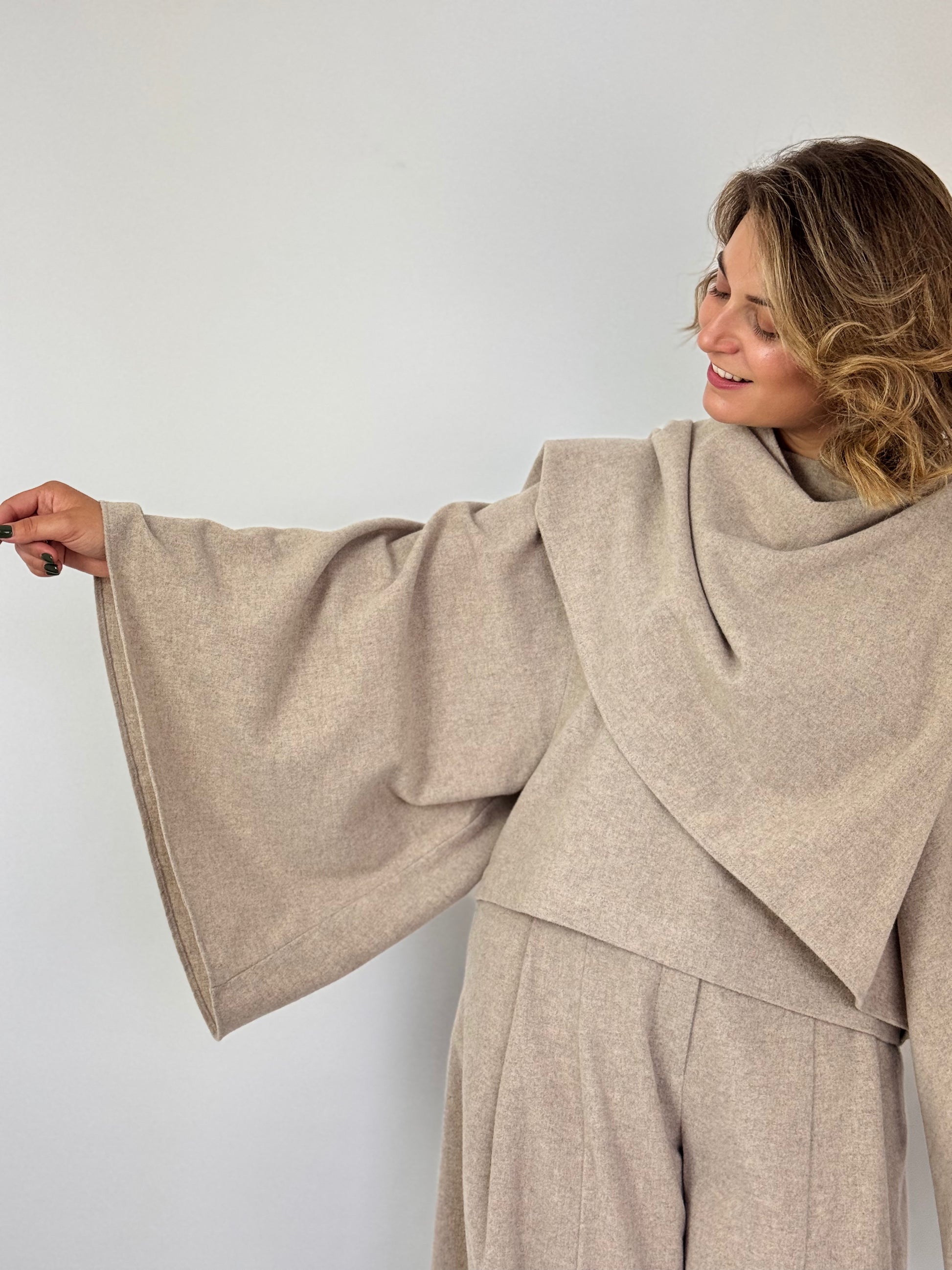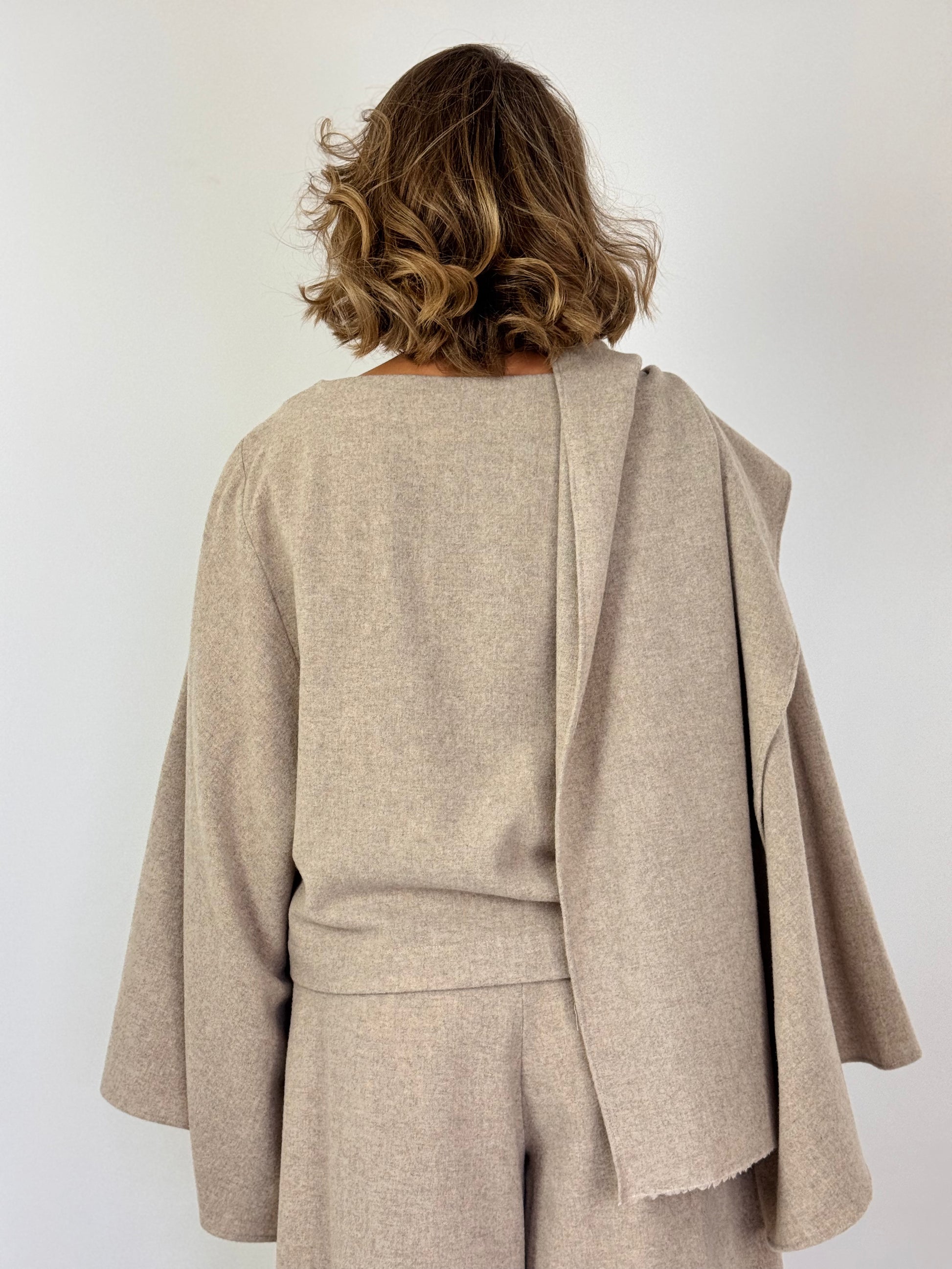 This smart and elegant top features a refined boat neckline and dramatic wide sleeves, enhanced by a distinctive attached shawl draped from one shoulder to the other. Its unique design offers a sophisticated silhouette, perfect for elevating your autumn wardrobe. Pair it seamlessly with the matching trousers for a polished and cohesive ensemble.