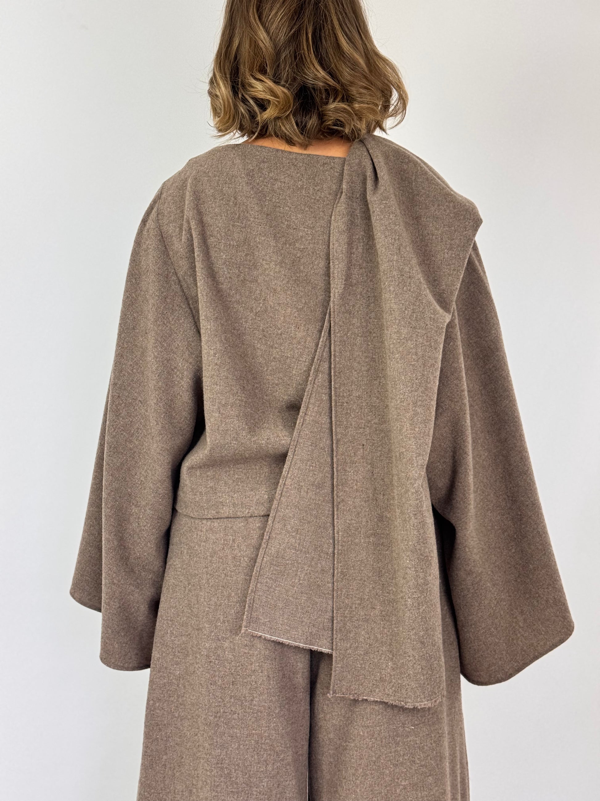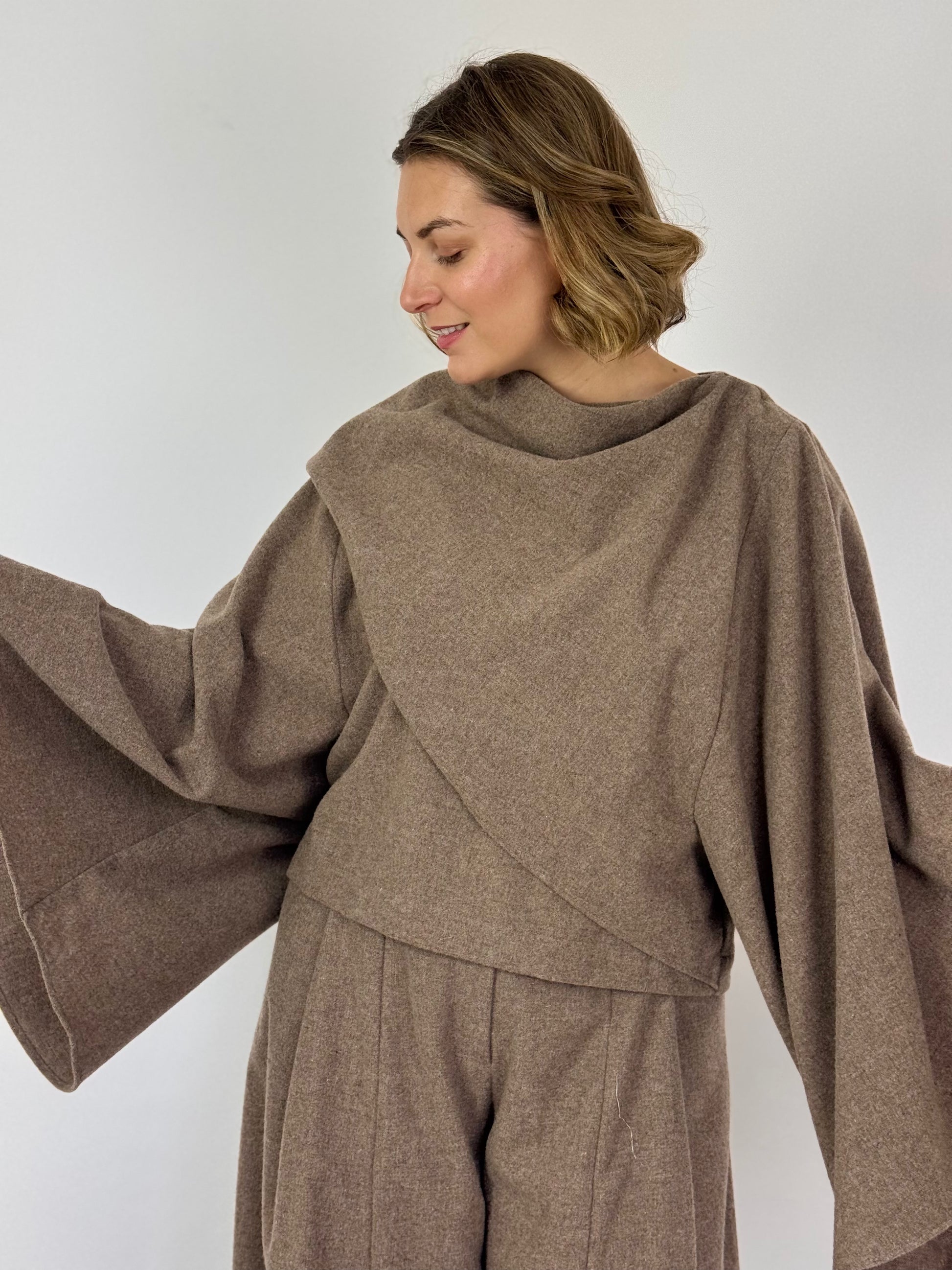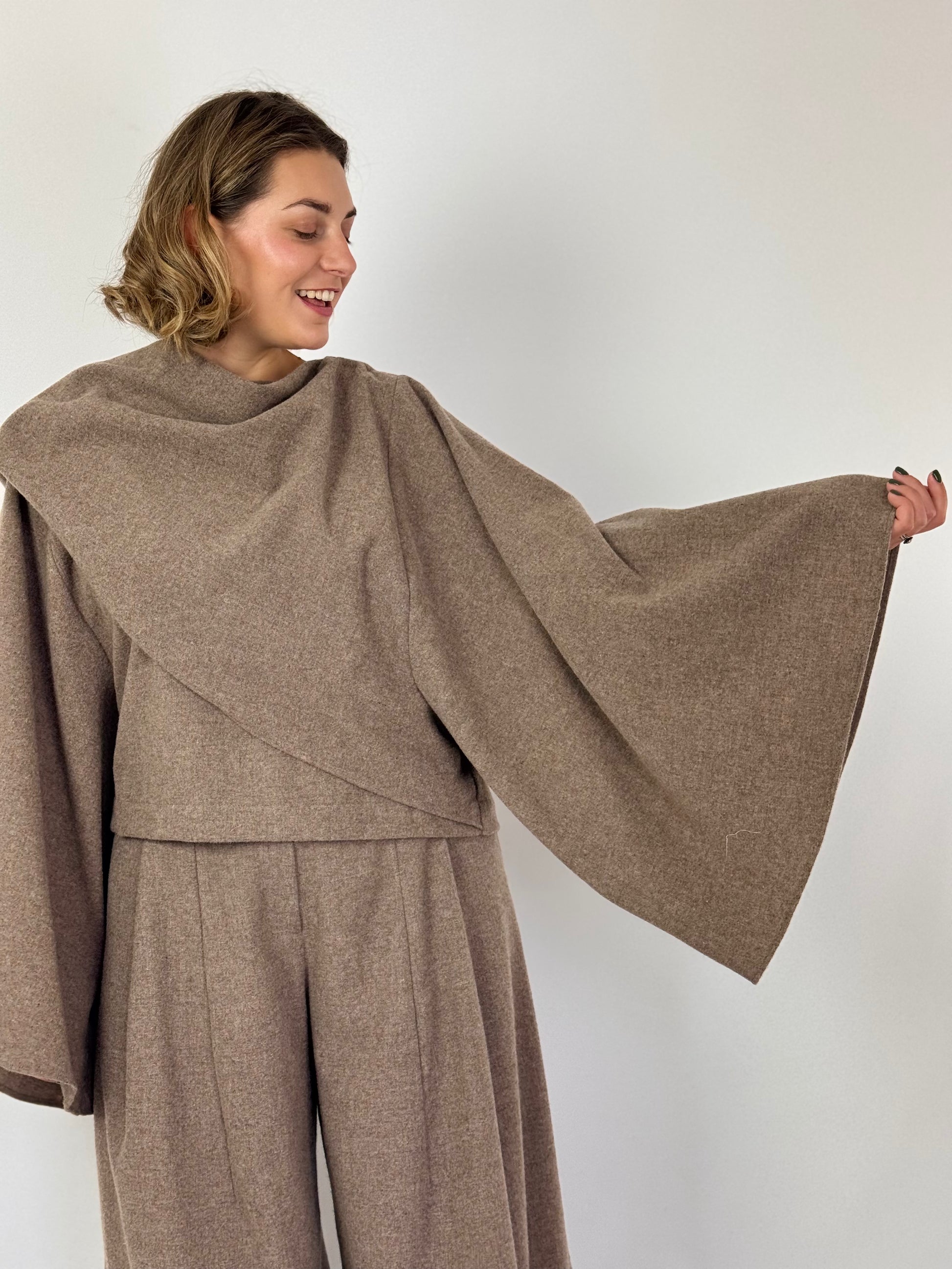 This smart and elegant top features a refined boat neckline and dramatic wide sleeves, enhanced by a distinctive attached shawl draped from one shoulder to the other. Its unique design offers a sophisticated silhouette, perfect for elevating your autumn wardrobe. Pair it seamlessly with the matching trousers for a polished and cohesive ensemble.