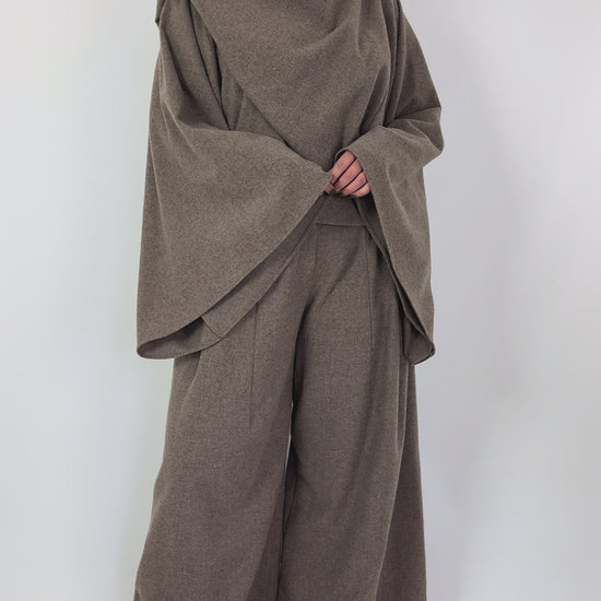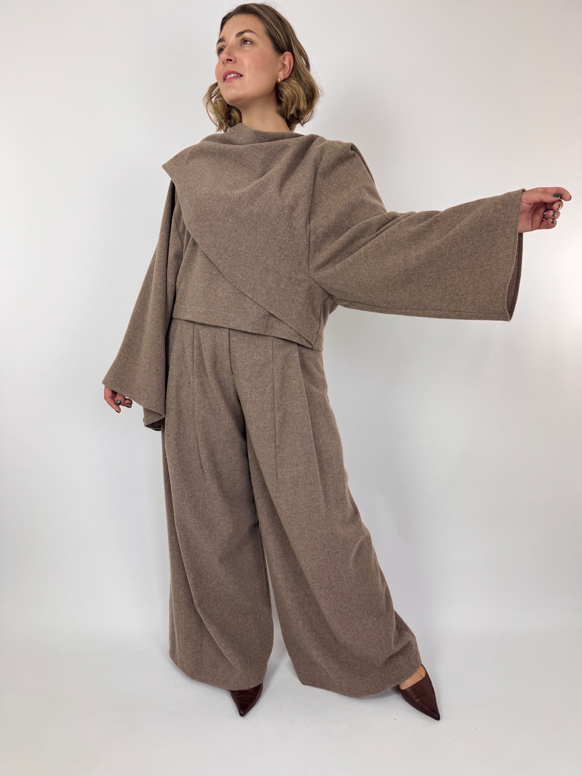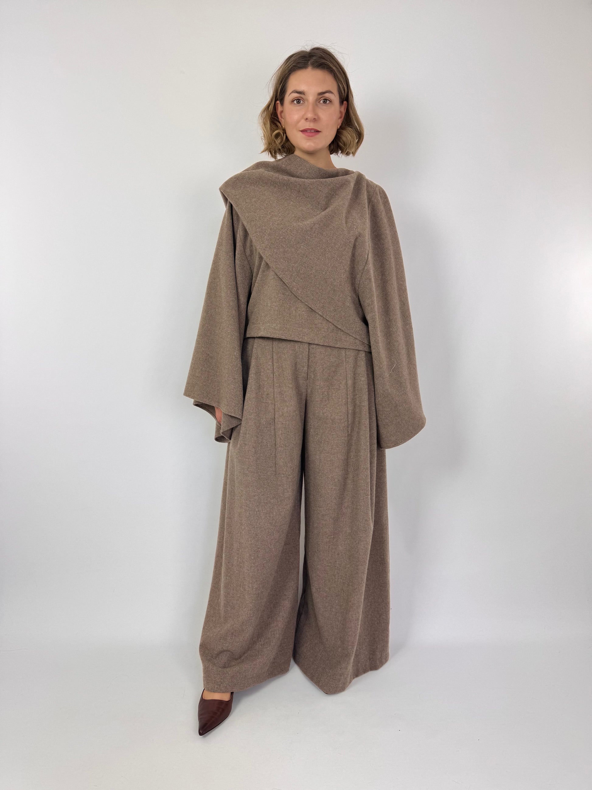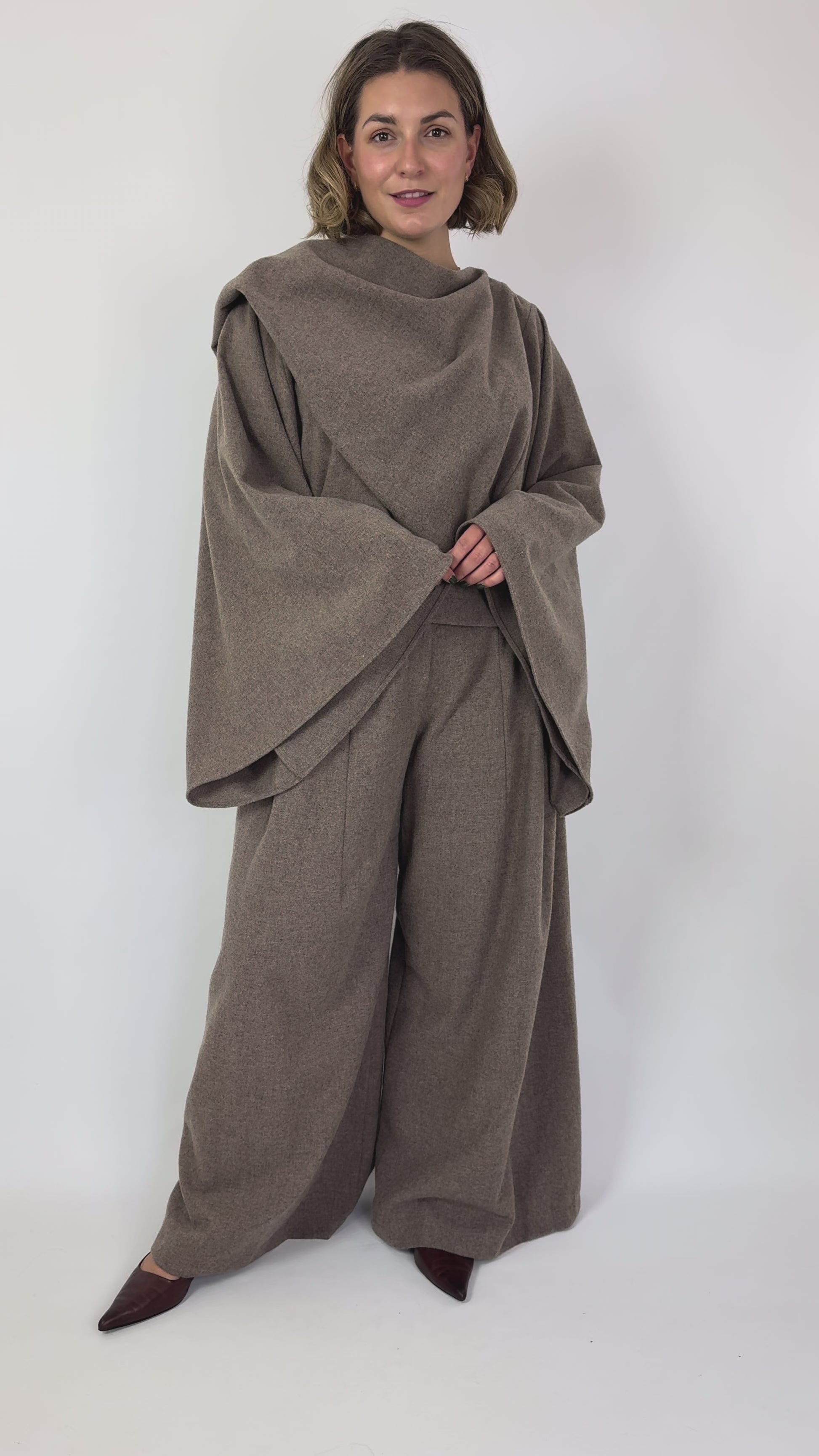 This smart and elegant top features a refined boat neckline and dramatic wide sleeves, enhanced by a distinctive attached shawl draped from one shoulder to the other. Its unique design offers a sophisticated silhouette, perfect for elevating your autumn wardrobe. Pair it seamlessly with the matching trousers for a polished and cohesive ensemble.