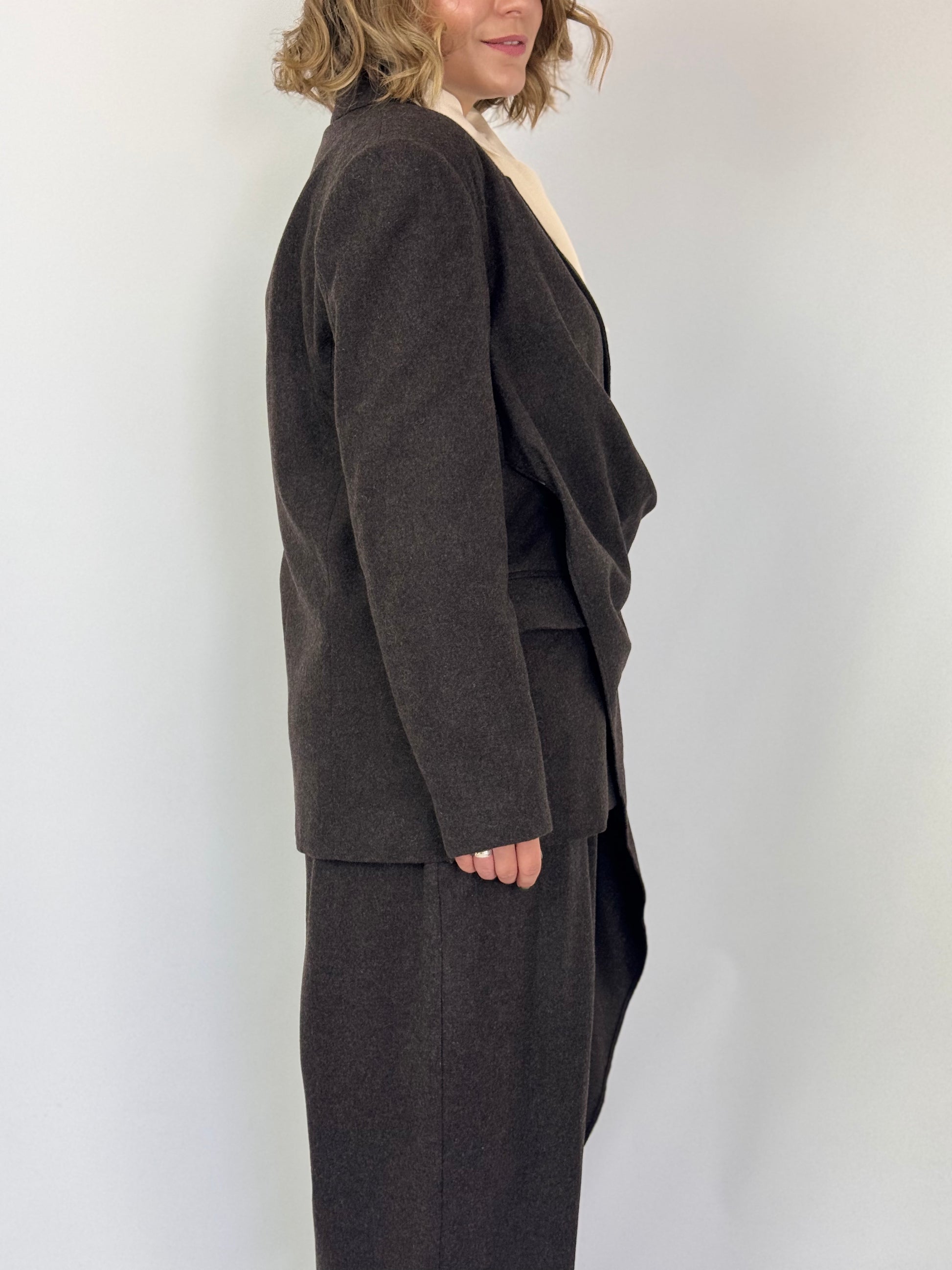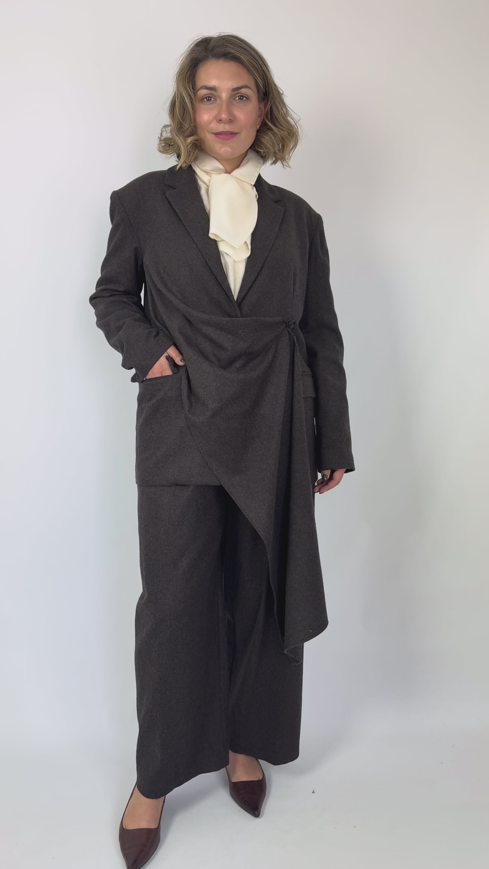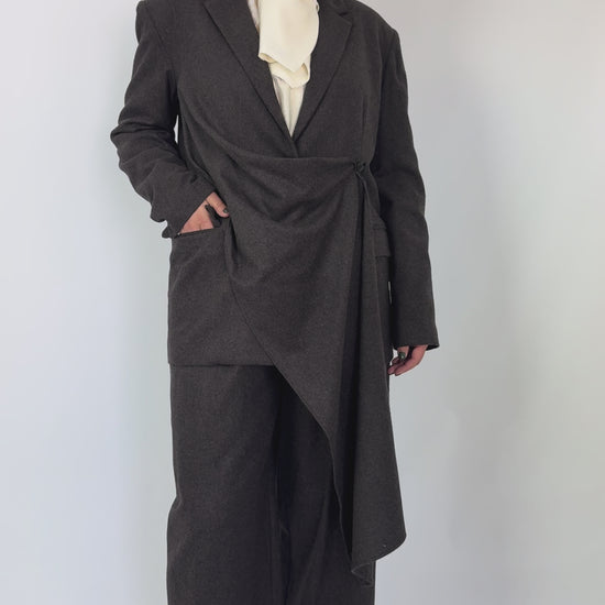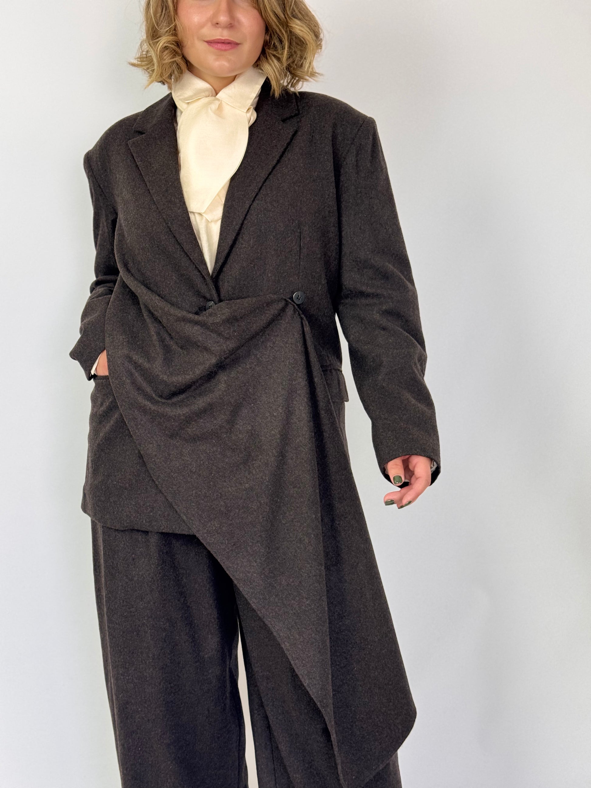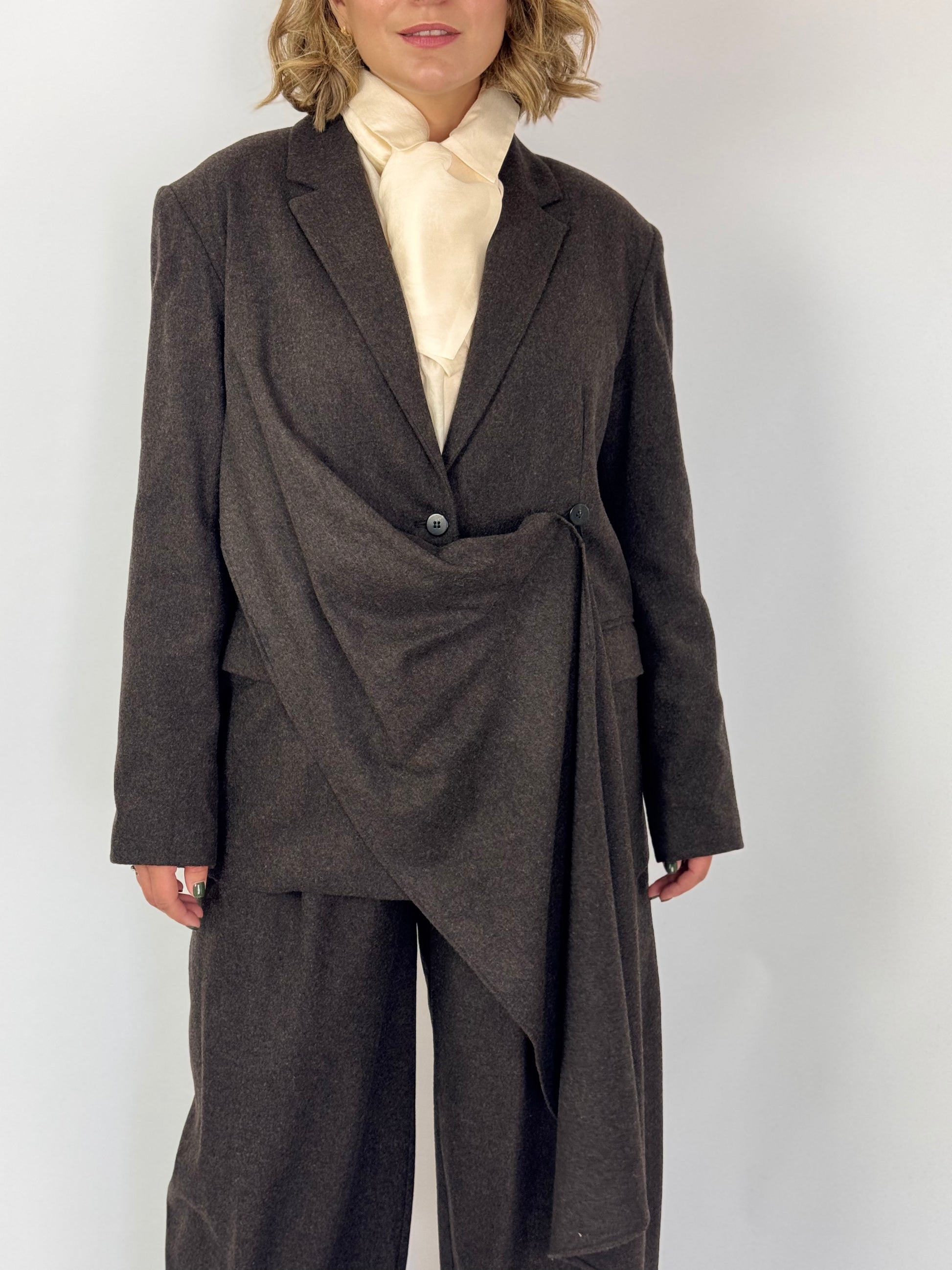 Crafted from a refined wool blend, the Opificio 39MI Jacket Fondente features a classic button fastening and a tailored collar, complemented by a soft lining for comfort. Its distinctive element—a shawl elegantly attached to one side—can be draped and button in place to create a striking yet sophisticated silhouette, perfect for elevating any outfit with subtle drama and expert craftsmanship.