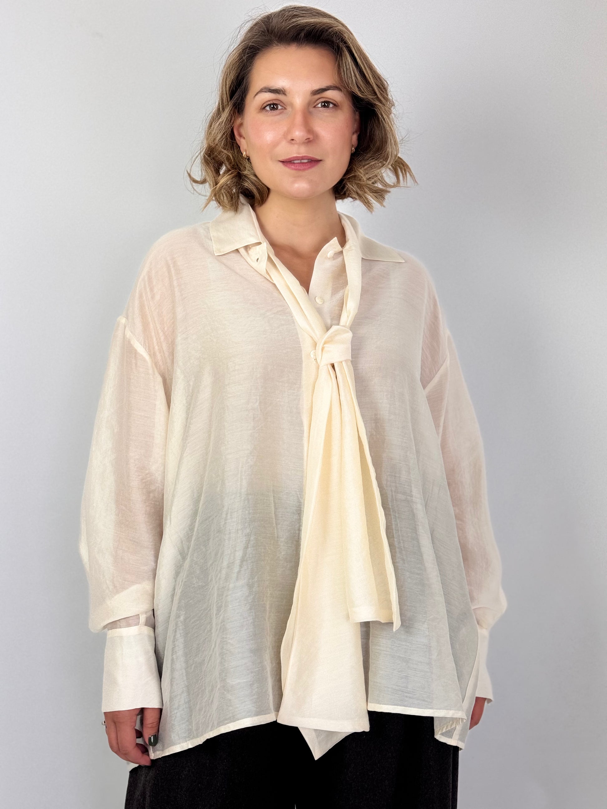 Crafted from a luxurious lyocell blend, the Opificio 39SH Shirt Milk combines effortless elegance with modern sophistication. Its sleek, loose silhouette gracefully complements long balloon sleeves, while the versatile collar features a neck tie that can be styled in multiple ways. The button-front closure and rounded hemline add subtle refinement, making this shirt a perfect choice for those seeking a polished yet relaxed look.