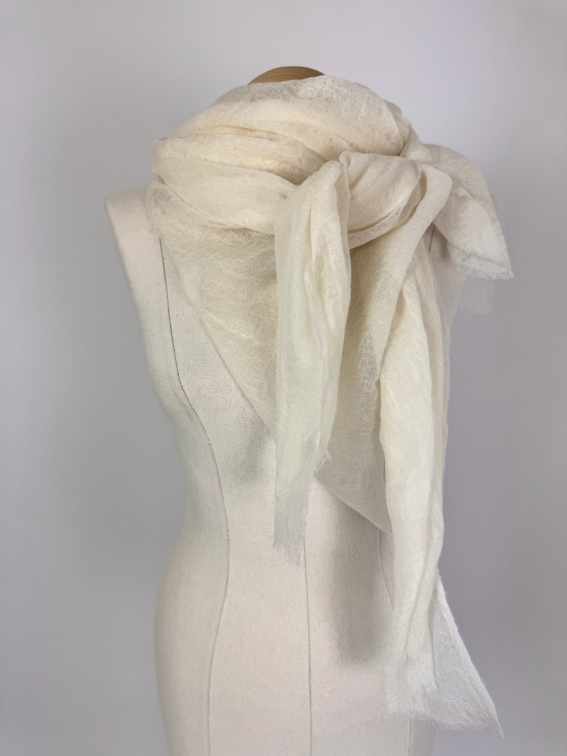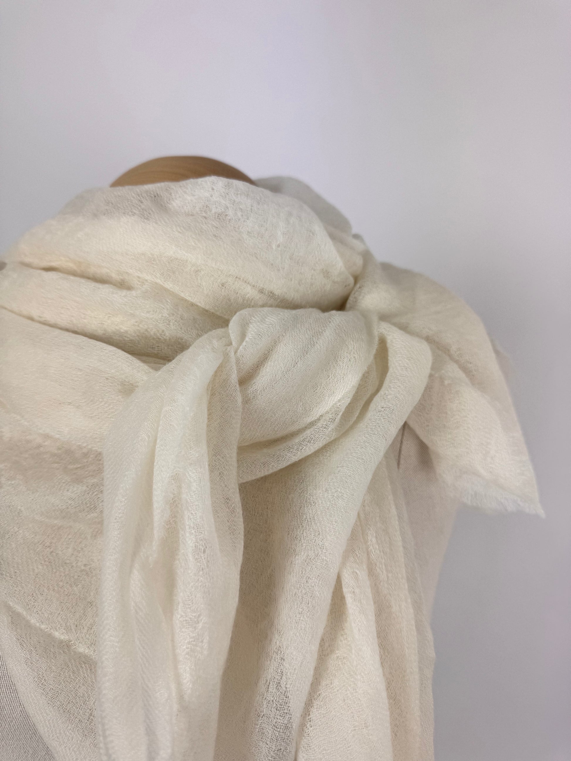 Crafted from lightweight woven cashmere, this large rectangular scarf exemplifies understated sophistication. The loose knit construction creates an effortlessly elegant drape, while delicate frayed edges add textural interest without compromising refinement. Perfect for layering or wearing as a statement piece, its airy composition ensures comfort across seasons. An investment in timeless style that transcends fleeting trends.