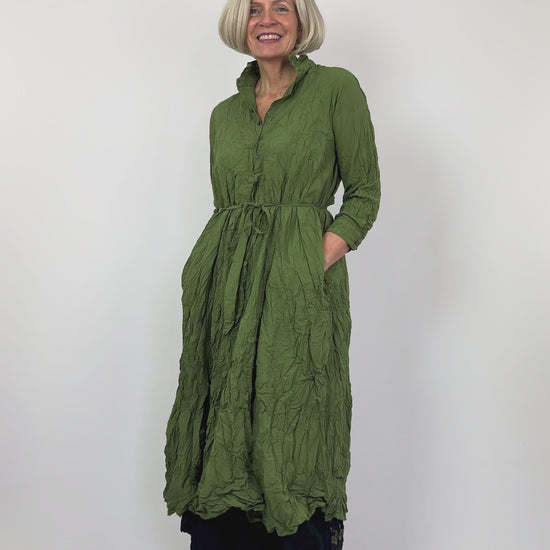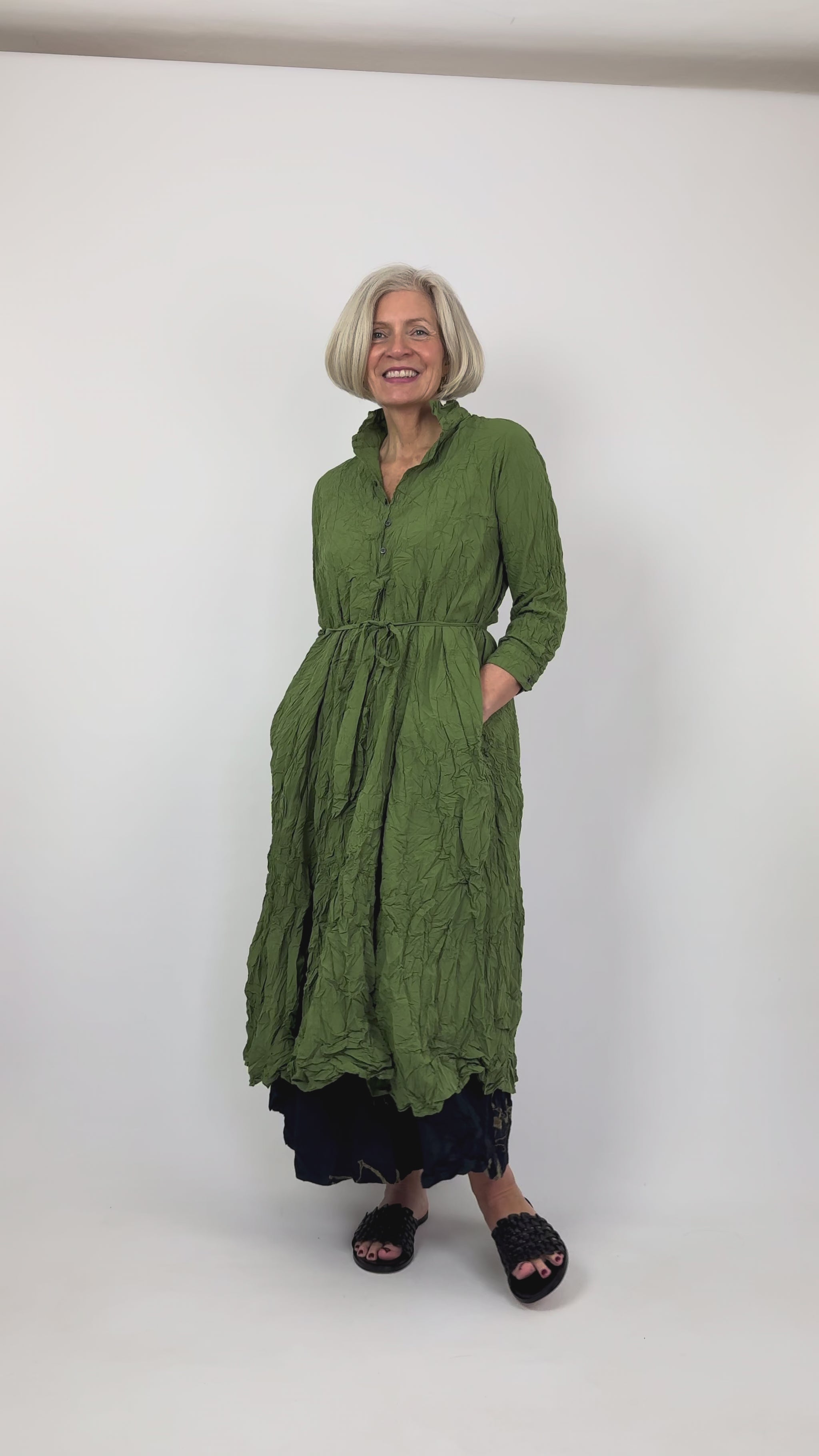 This classic crinkle dress combines timeless design with practical summer styling. The lightweight fabric features a crisp, textured finish that resists wrinkles whilst maintaining breathability. A structured shirt collar and compact silhouette provide a polished foundation, whilst strategically placed gussets toward the hem create an elegant flare for movement and comfort. Bold thread stitching along the front placket delivers a distinctive design detail, and dual side pockets offer functional convenience. Complete with a coordinating fabric waist belt, this versatile piece transitions effortlessly from casual daywear to refined occasions.