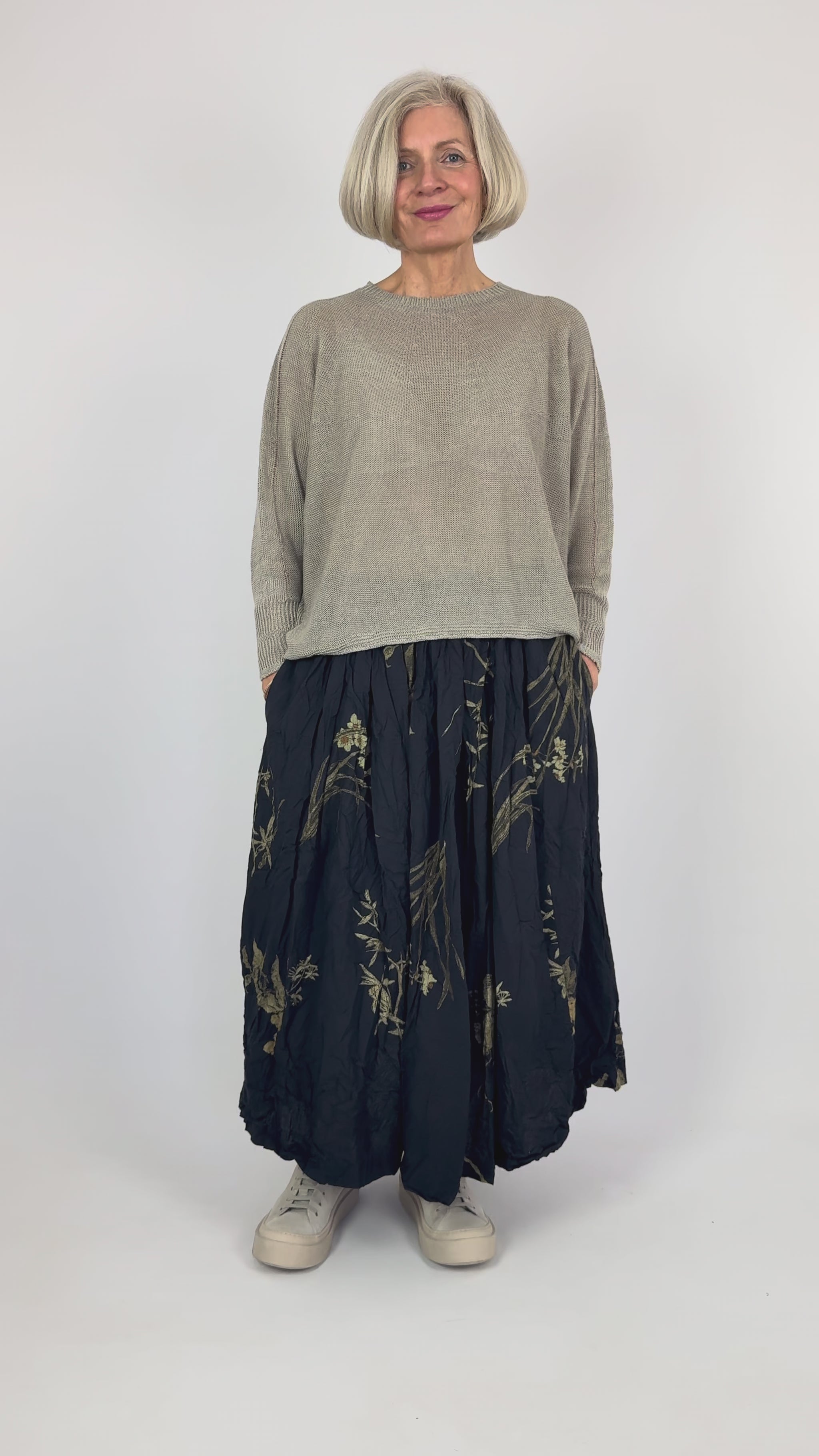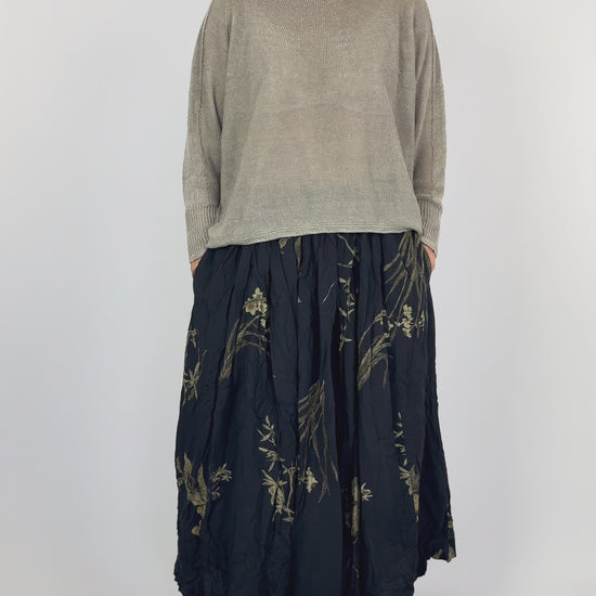 Celebrate the artistry of Japanese florals with this elegant skirt, featuring a refined Japonism print that captures the serene beauty of traditional blooms. Crafted from soft cotton lawn fabric, the material develops a distinctive crinkled texture through hand-finishing in Kyoto—a characteristic that gracefully evolves with each wash, creating a unique patina over time. The thoughtfully designed silhouette combines a sleek front with tucked gathers and practical side pockets, while the adjustable waist belt transitions seamlessly from elastic sides to tape backing for a flattering, comfortable fit. An investment piece that honours Japanese textile heritage whilst offering everyday versatility.
