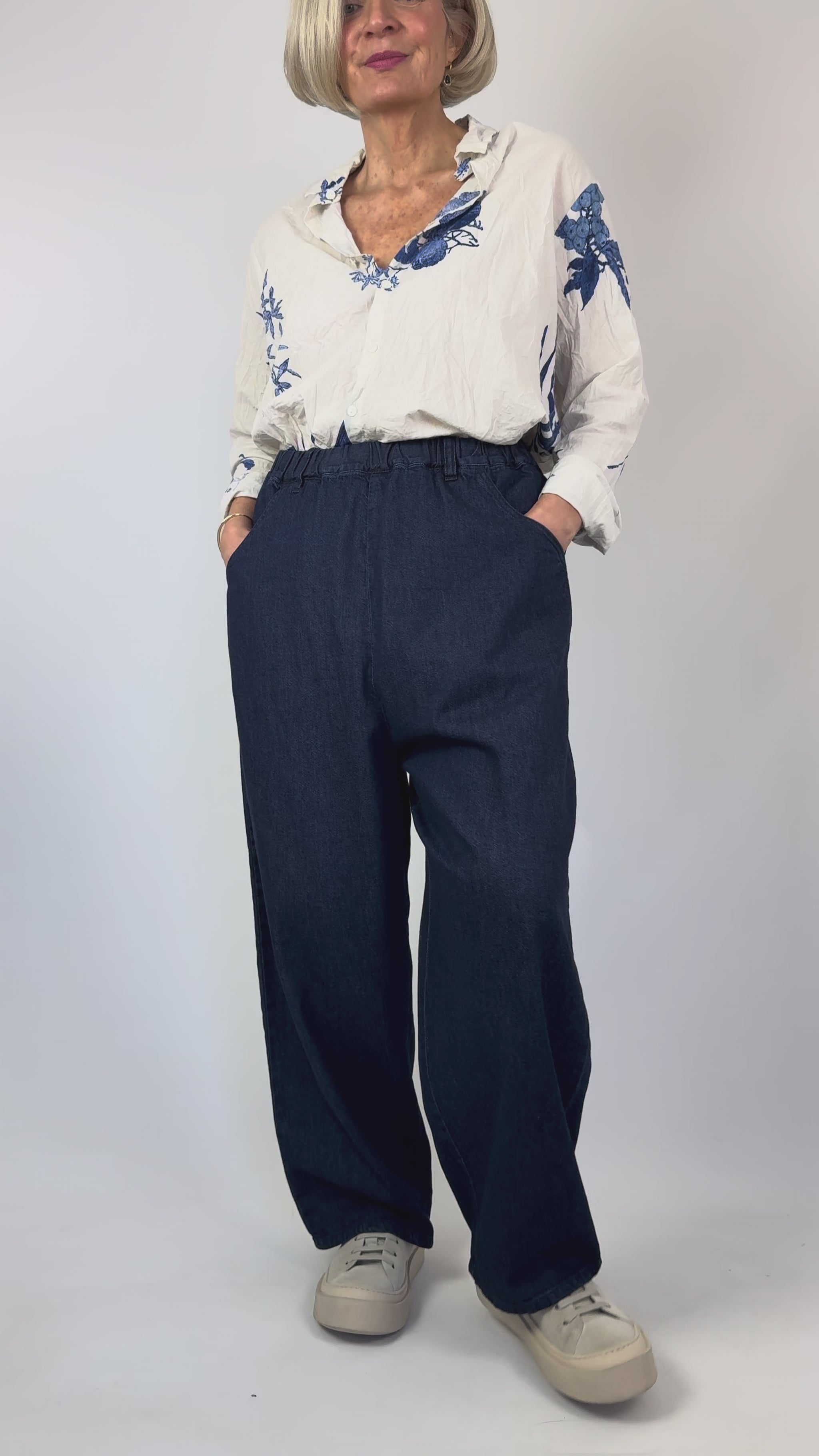 Relaxed fit easy pants with belt loops. Elastic and a drawstring on waist belt.