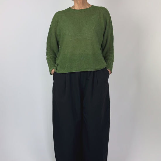 Crafted from a cotton-linen blend, these trousers showcase a high-density plain weave finished with Omi-sarashi—a traditional Japanese technique that creates natural texture and subtle crinkling through wood ash treatment. The unmercerized fabric retains a characteristically dry hand, while sulfur-dyeing imparts vintage-inspired tonal variation and a gently worn aesthetic. Designed with a voluminous cropped silhouette and slightly elevated rise, the style features an elasticated waistband with drawstring and faux fly detail. Prominent topstitching in thick thread emphasises the garment-dyed finish, resulting in a piece that balances contemporary proportion with artisanal craftsmanship.