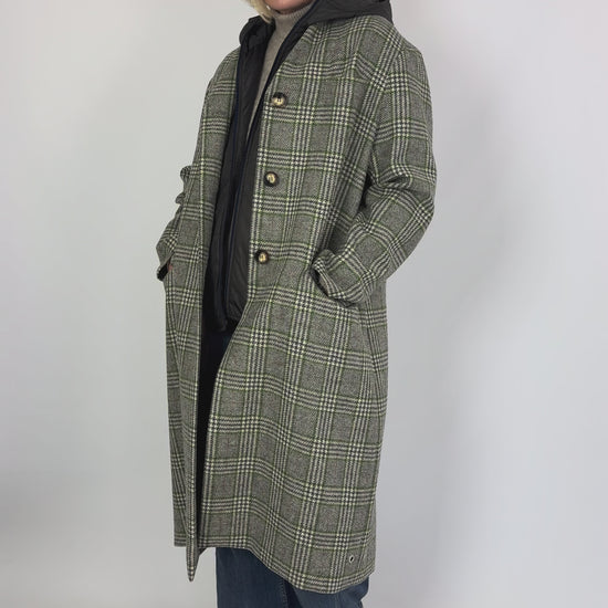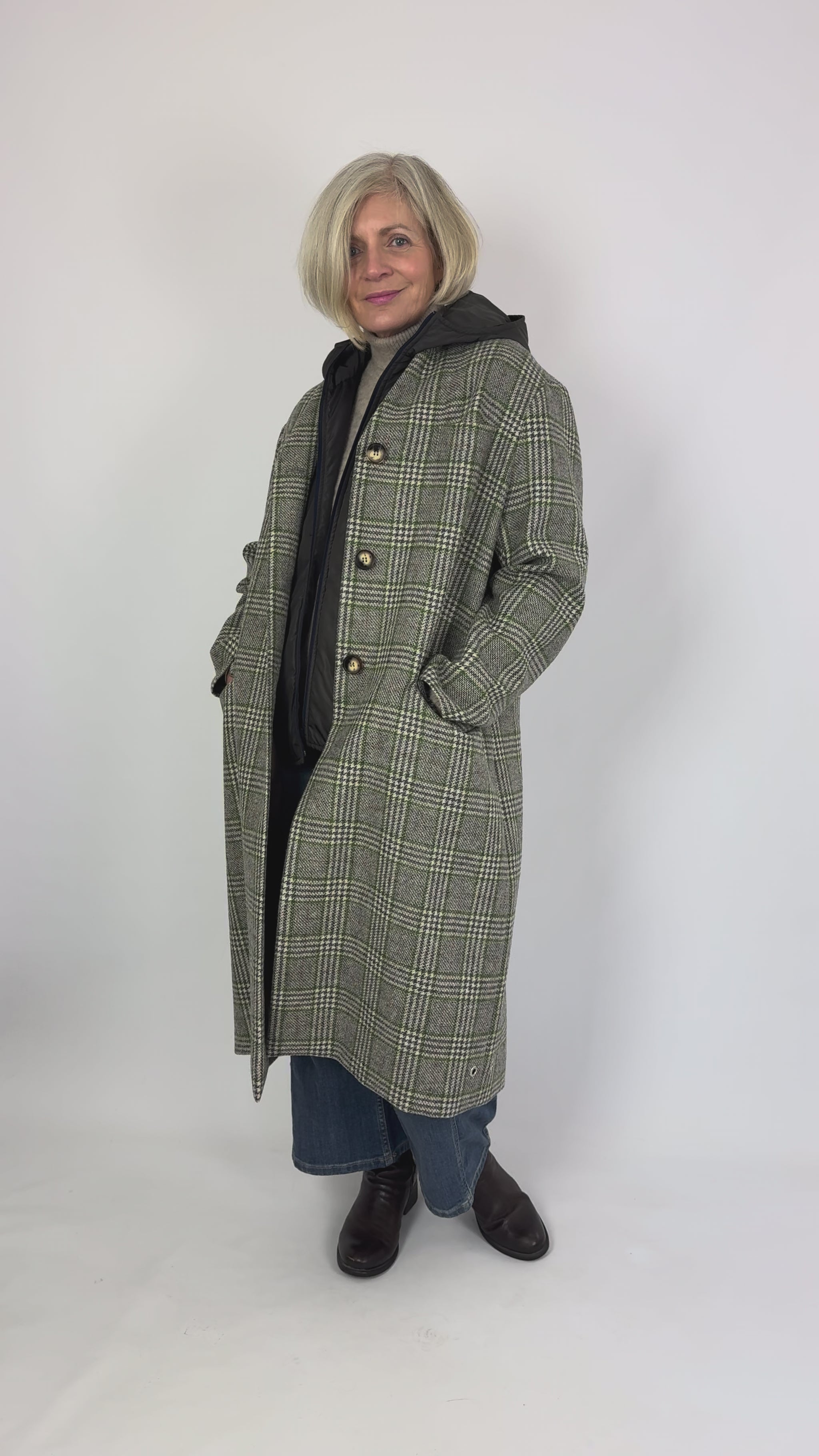 Crafted in Paris, this distinguished wool tweed check coat exemplifies refined tailoring with its button fastening and elegantly dropped shoulders. The piece gains remarkable versatility through its accompanying padded hooded gilet, secured via three poppers at the back. Wear the coat alone for timeless sophistication, layer both pieces together for enhanced warmth and dimension, or style the gilet independently for casual versatility. A thoughtfully designed investment that adapts to your wardrobe needs.