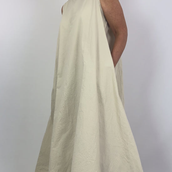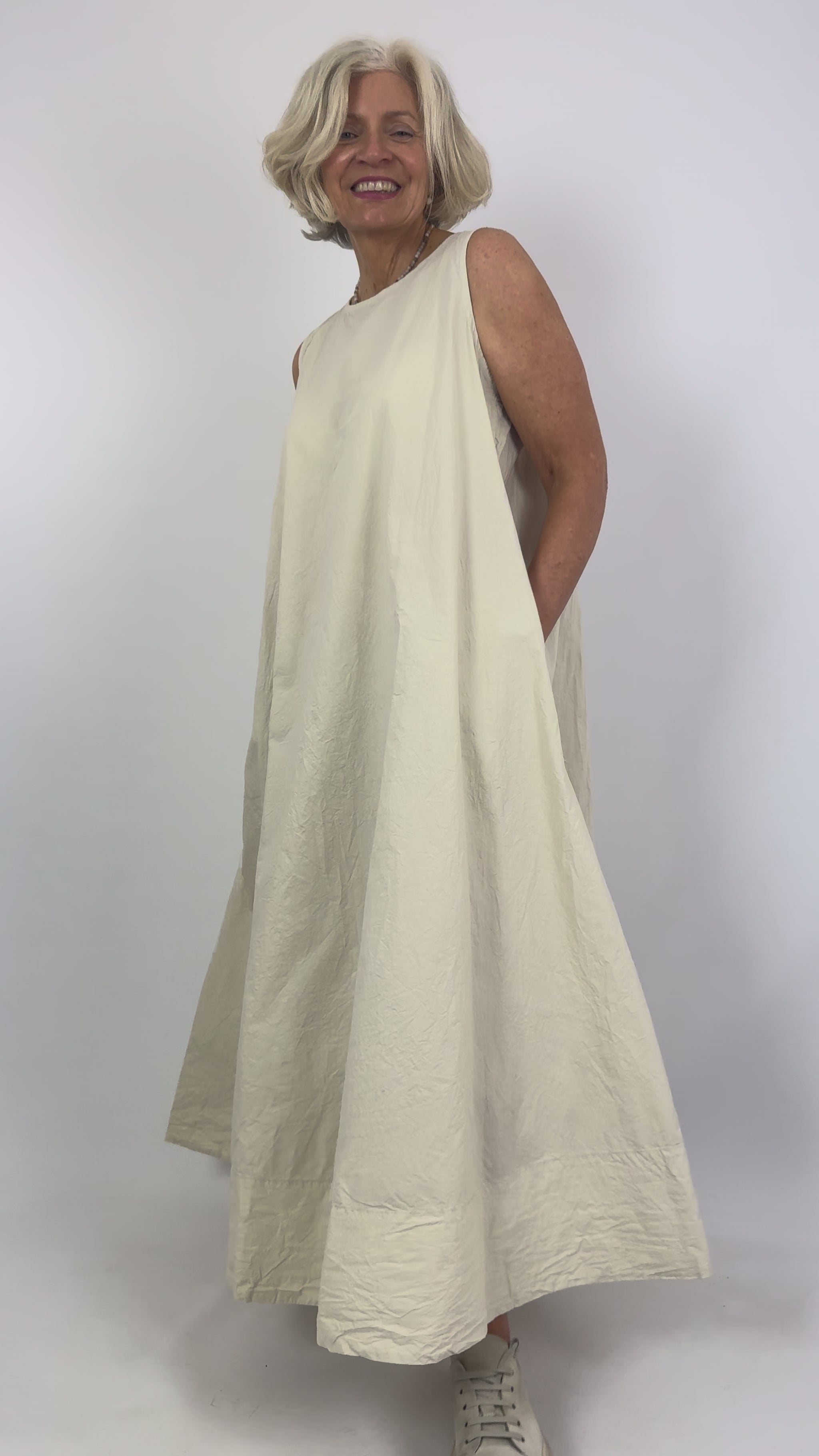 Effortless elegance in pure cotton. This full-length, sleeveless A-line dress features a flattering silhouette that moves with you, while practical side seam pockets add everyday functionality. The crisp cotton fabric offers breathability and durability, making it an ideal choice for warm weather wear or layering across seasons. A versatile wardrobe essential that transitions seamlessly from casual to refined occasions.