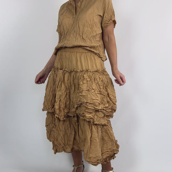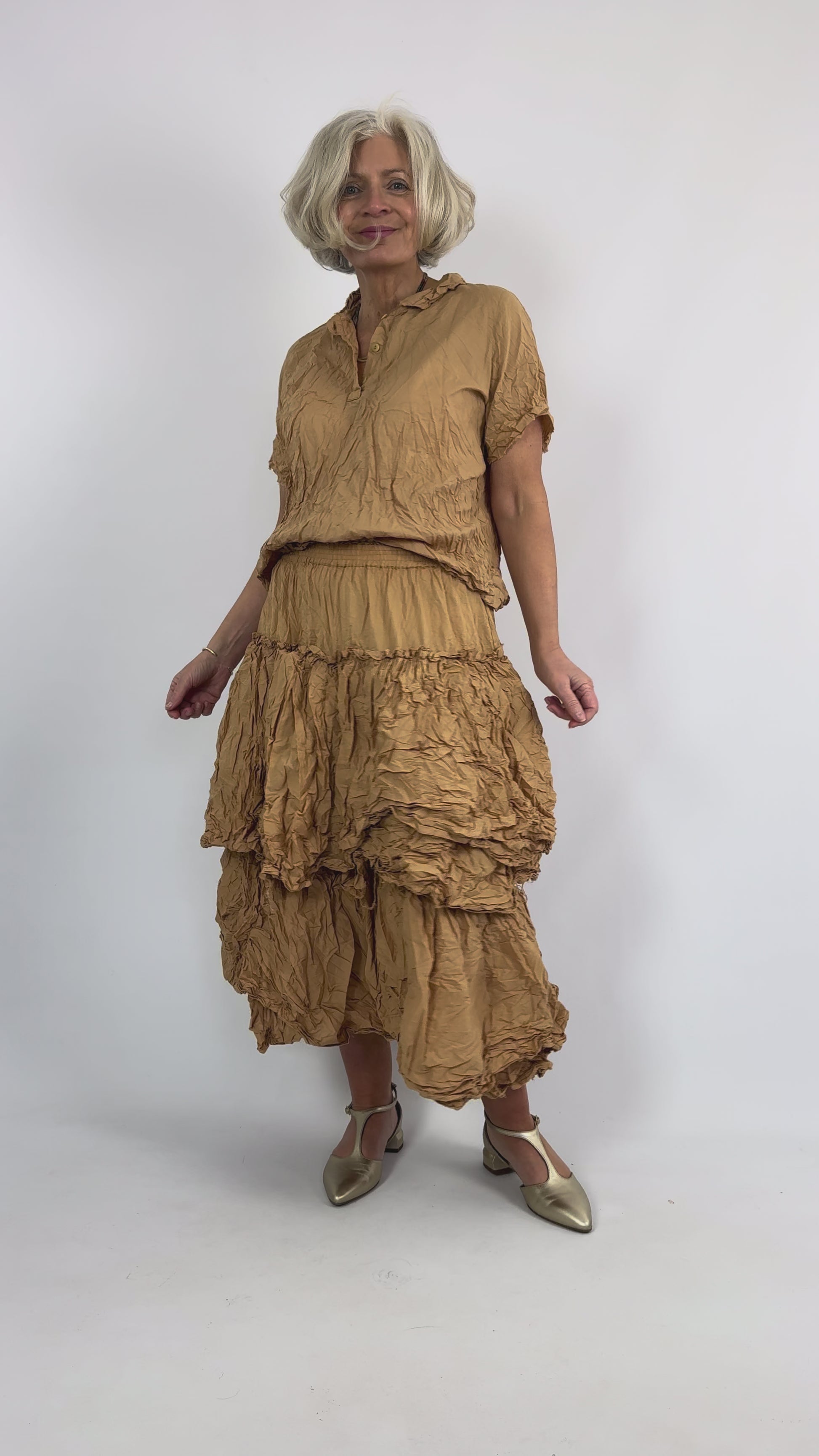 Crafted from soft crinkled cotton, this layered skirt delivers effortless elegance with its textured fabric and dynamic silhouette. The elasticated waistline ensures a comfortable, adjustable fit that moves with you throughout the day. Perfect for those seeking understated sophistication with practical wearability.