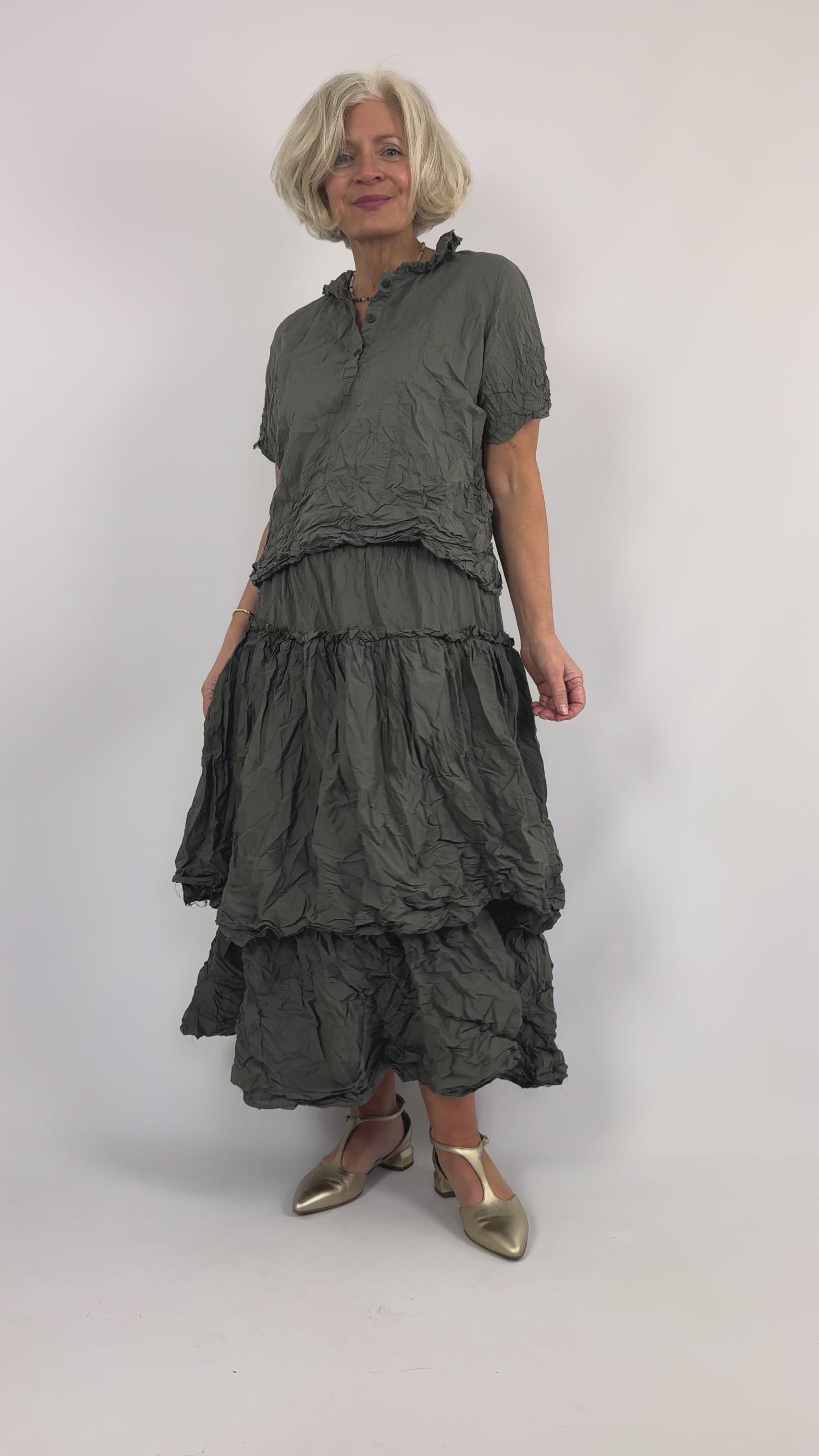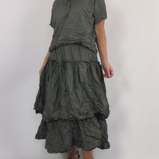 Crafted from soft crinkled cotton, this layered skirt delivers effortless elegance with its textured fabric and dynamic silhouette. The elasticated waistline ensures a comfortable, adjustable fit that moves with you throughout the day. Perfect for those seeking understated sophistication with practical wearability.