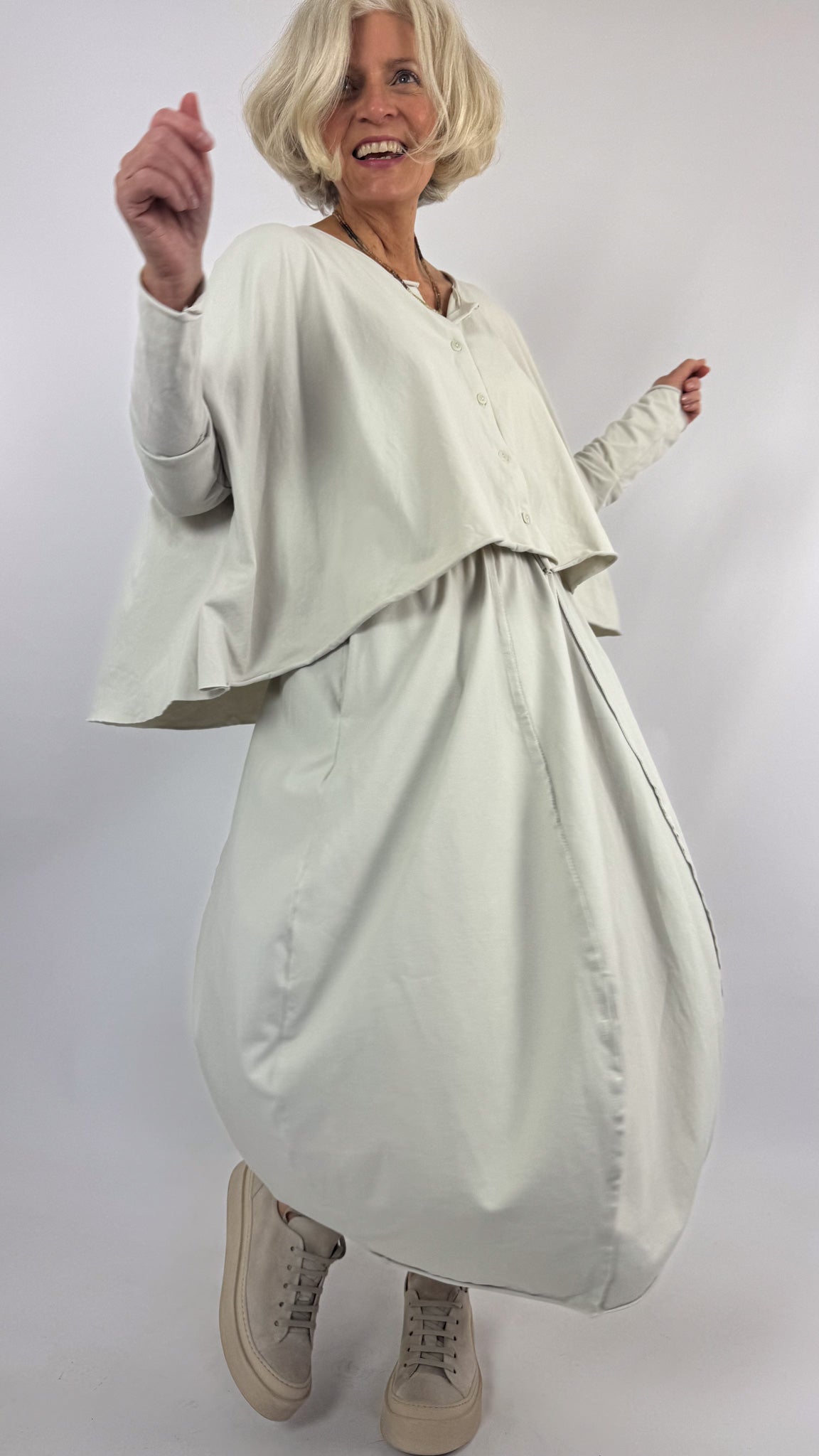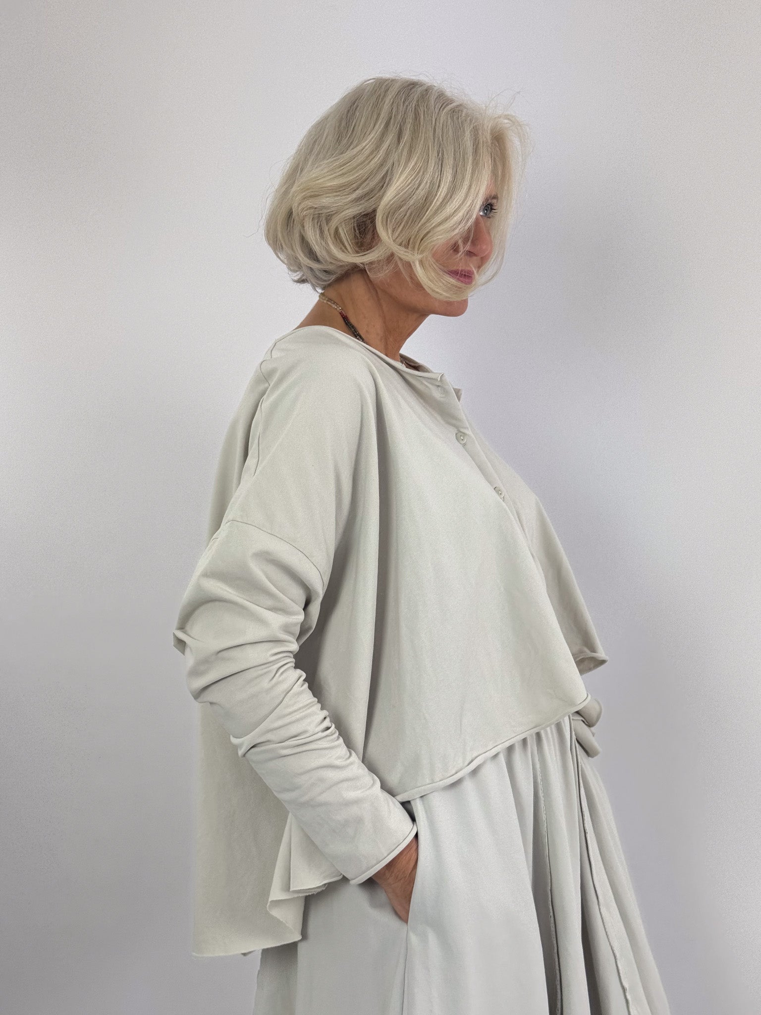 Crafted from soft jersey cotton with subtle stretch, this cardigan delivers effortless comfort and movement. Its generous, swing silhouette skims the body without clinging, while the button front allows for versatile layering and styling. Long sleeves and a classic round neckline complete a piece that transitions seamlessly from casual to refined occasions. Perfect for those seeking relaxed elegance with practical wearability.