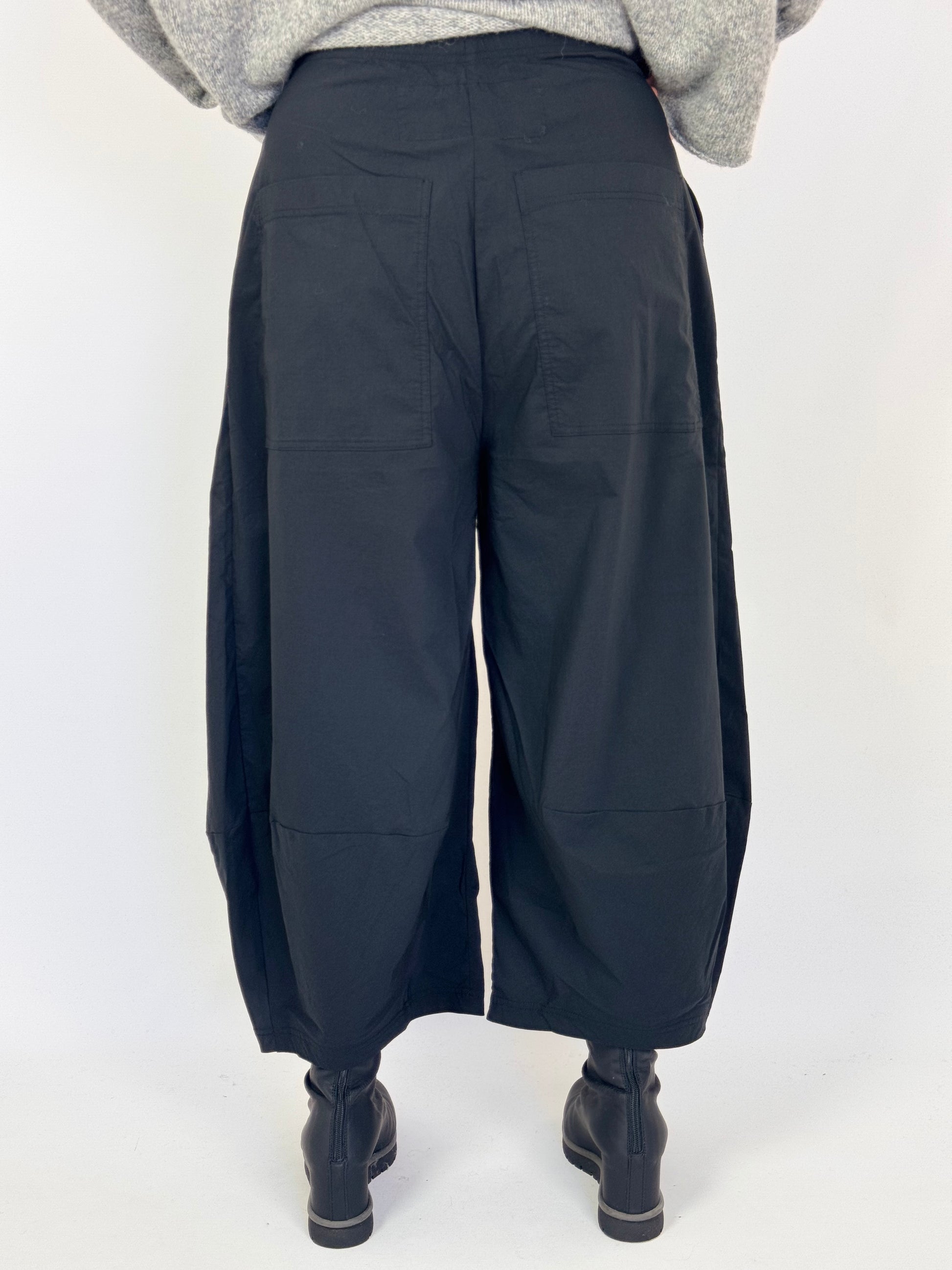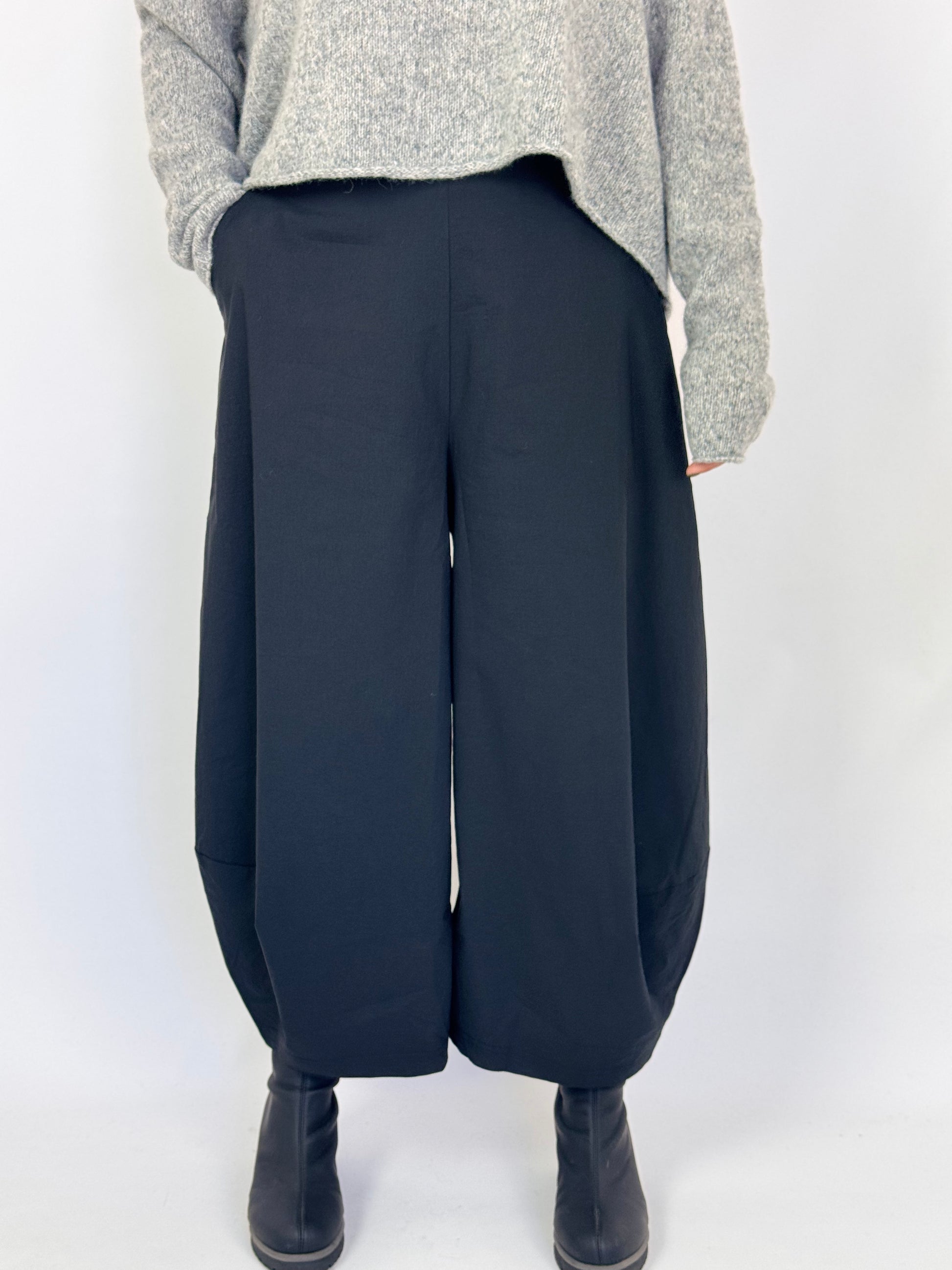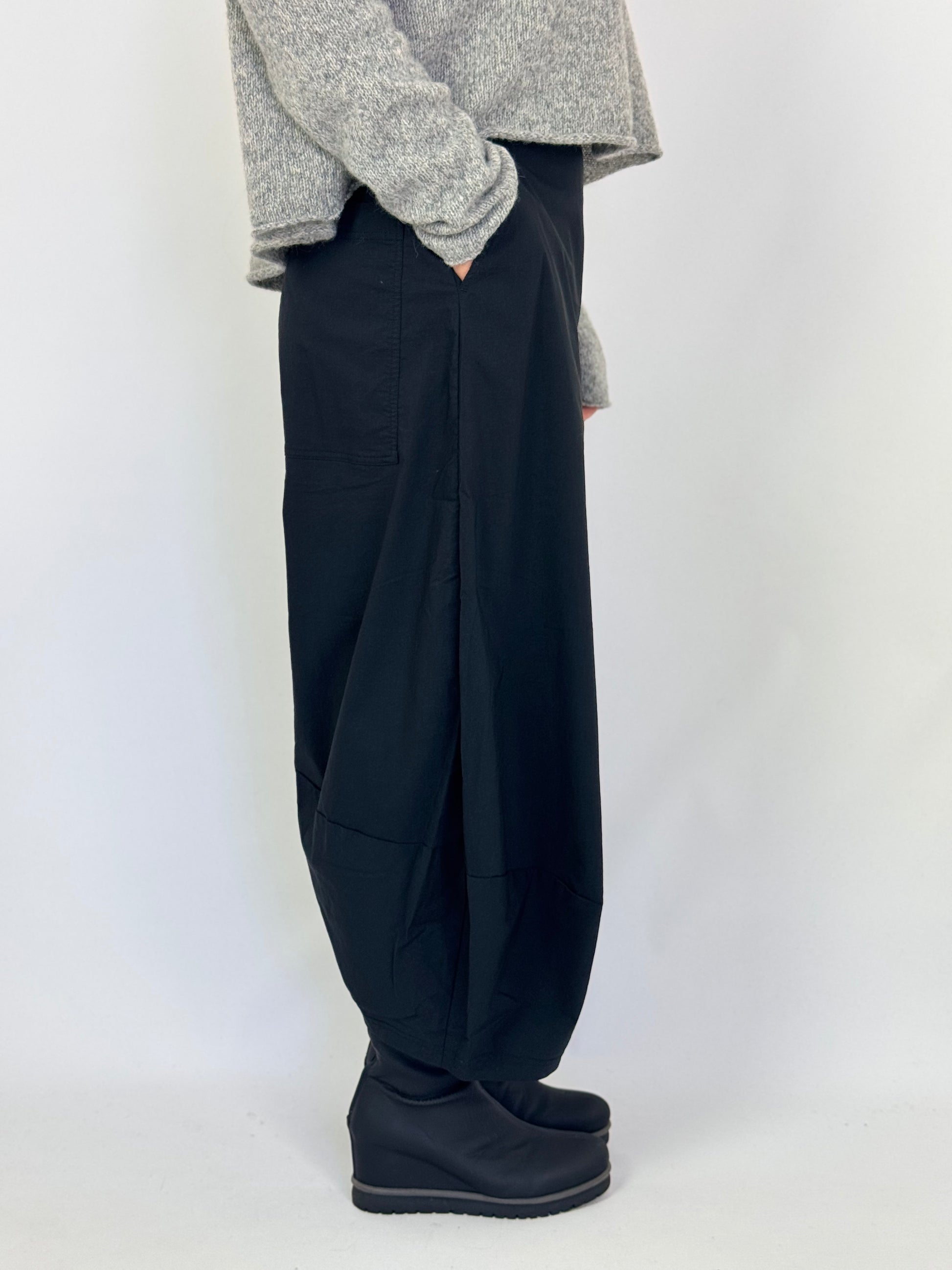 These Rundholz Black Label 0104 trousers feature a distinctive balloon shape that combines fashion with comfort. Crafted from a stretchy technical fabric, they ensure ease of movement and a flattering fit. Designed as a pull-on style for convenience, they also include practical side pockets, blending functionality with sophisticated style. Ideal for those seeking modern, versatile trousers with a technical edge.