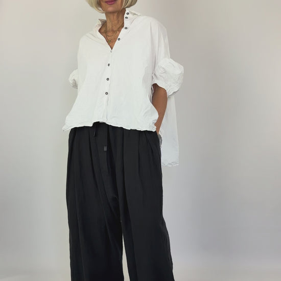 Crafted from pure linen, these oversized trousers deliver effortless sophistication with their distinctive drop-crotch silhouette. The elasticated waistline and drawstring provide adjustable comfort, while strategic pleating amplifies the relaxed volume throughout. A statement piece that balances architectural tailoring with contemporary ease, perfect for those who appreciate refined, unconventional proportions.