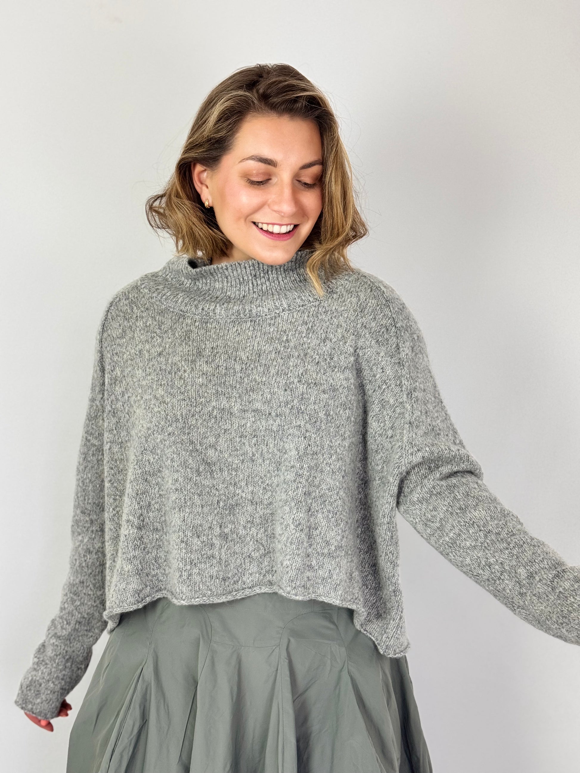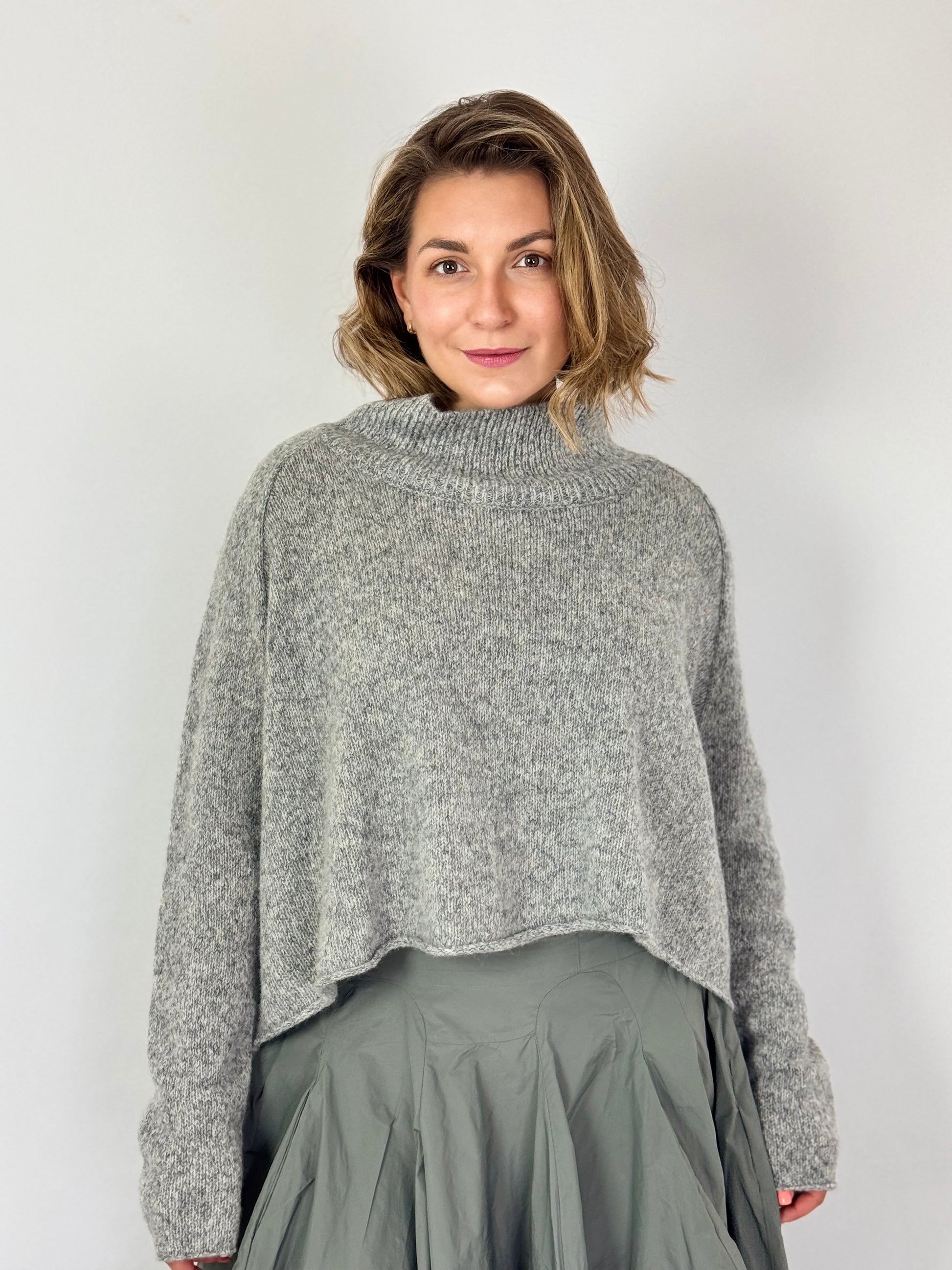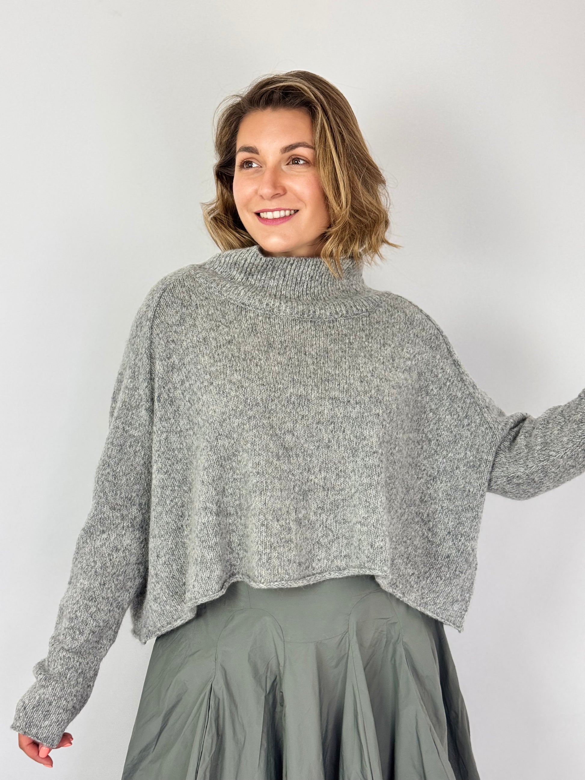This Rundholz Black Label jumper features a short, boxy silhouette crafted from a light grey melange knit. Its turtle neckline delivers a refined, contemporary look while providing comfortable coverage, making it a versatile layering piece for a sophisticated wardrobe.