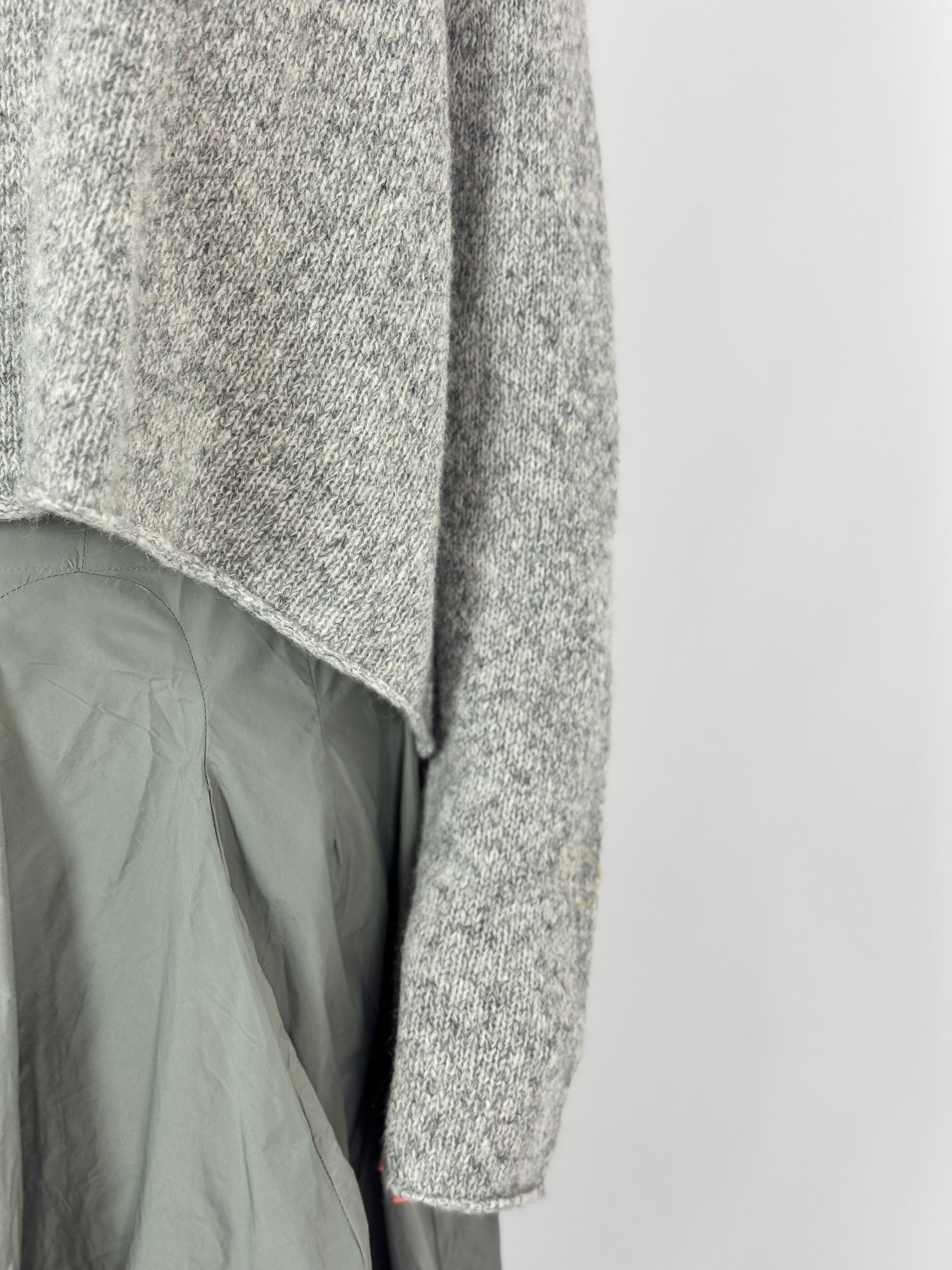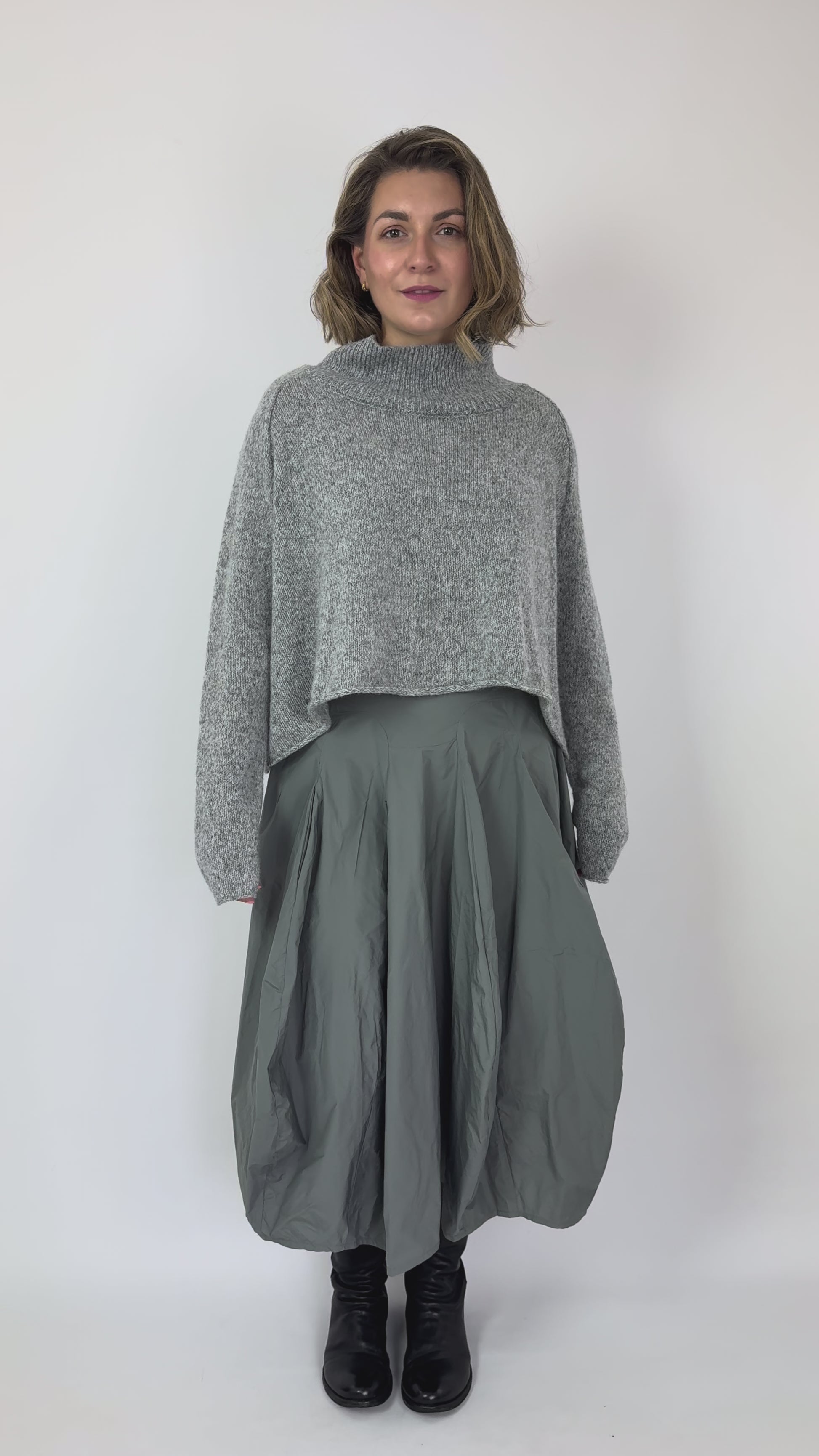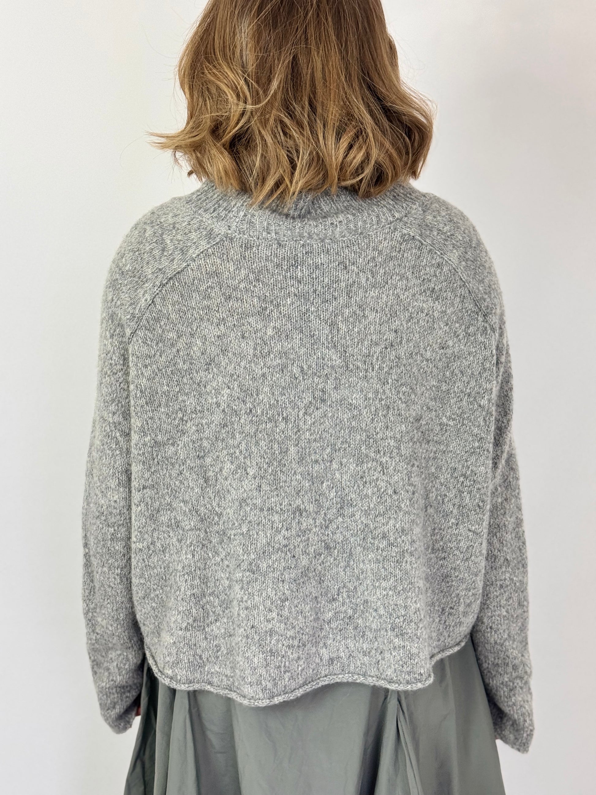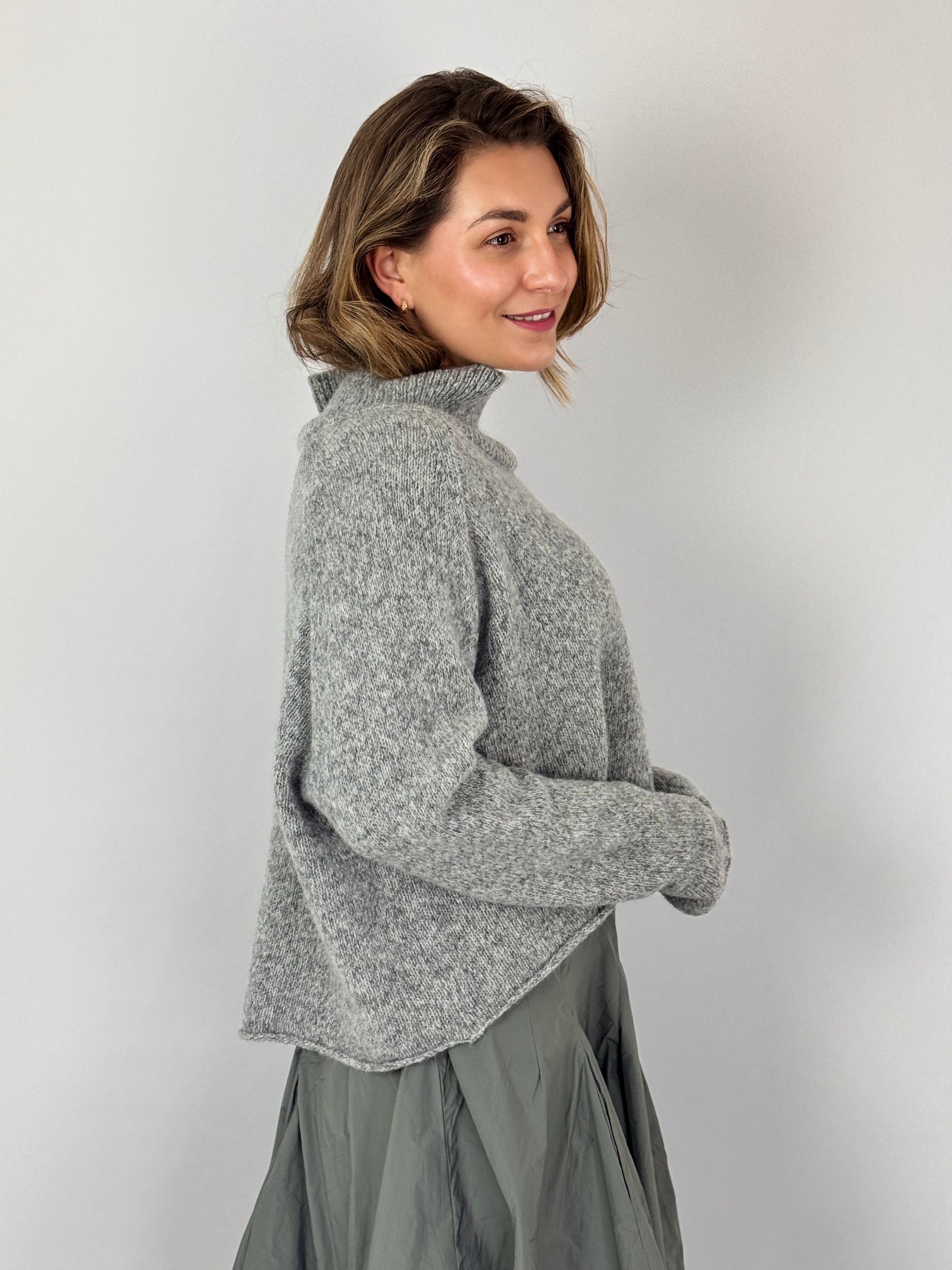 This Rundholz Black Label jumper features a short, boxy silhouette crafted from a light grey melange knit. Its turtle neckline delivers a refined, contemporary look while providing comfortable coverage, making it a versatile layering piece for a sophisticated wardrobe.