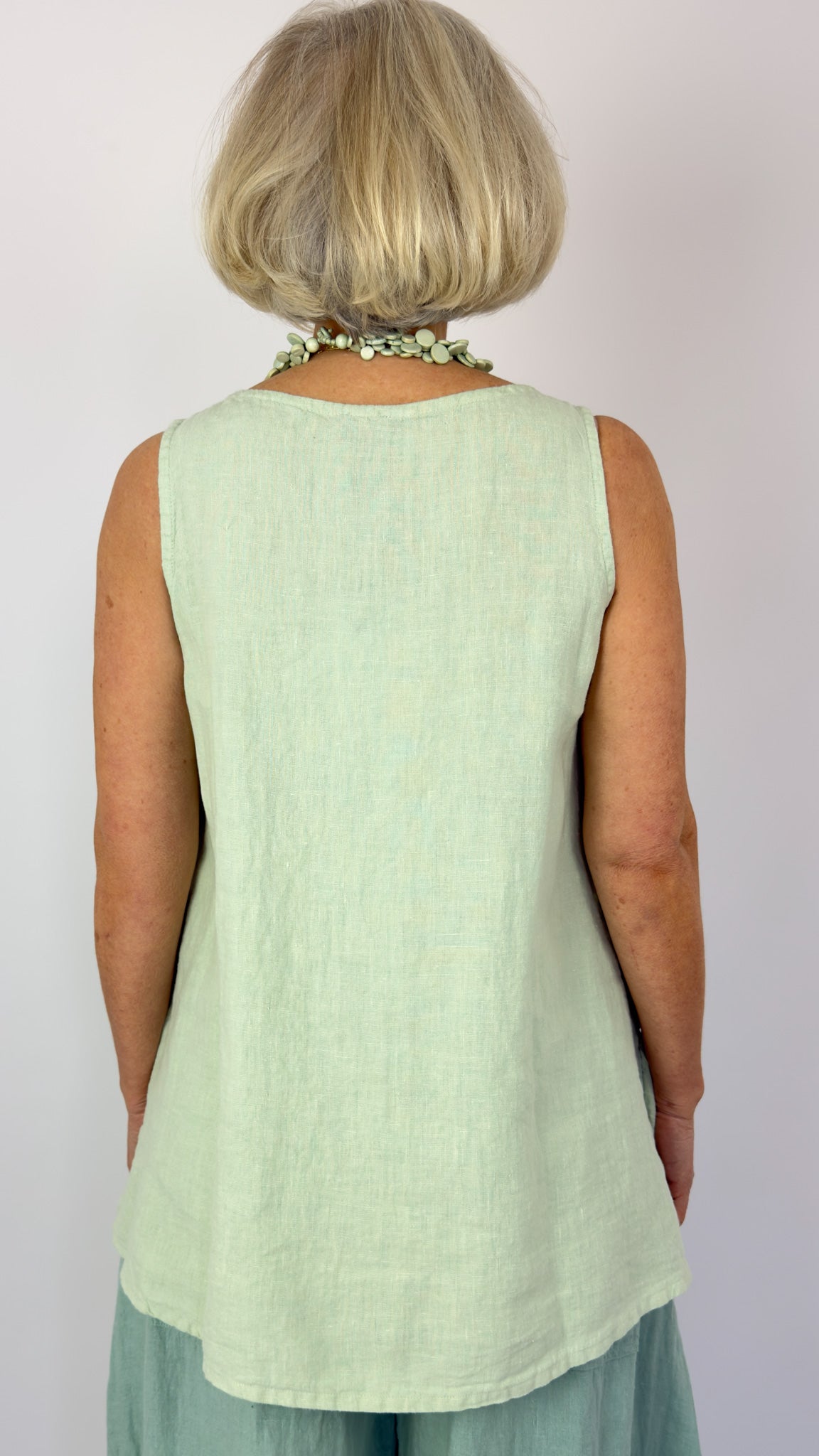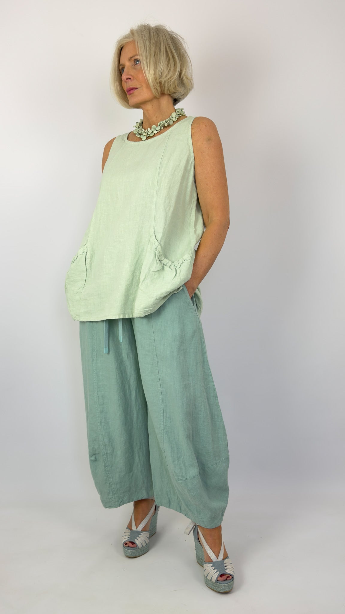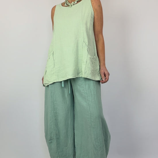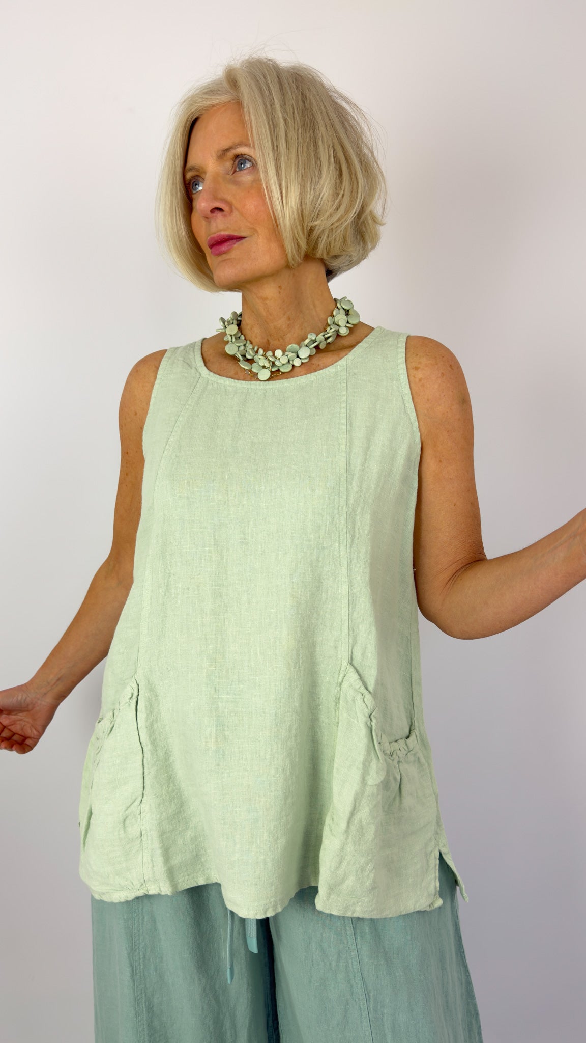 Effortlessly elegant, this sleeveless summer blouse features a refined round neckline and expertly crafted seam detailing that sculpts a flattering silhouette. Two front pockets combine practicality with design—their gathered detailing adds sophisticated visual dimension. Perfect for warm-weather dressing, this piece transitions seamlessly from casual daytime wear to evening occasions with minimal styling effort.