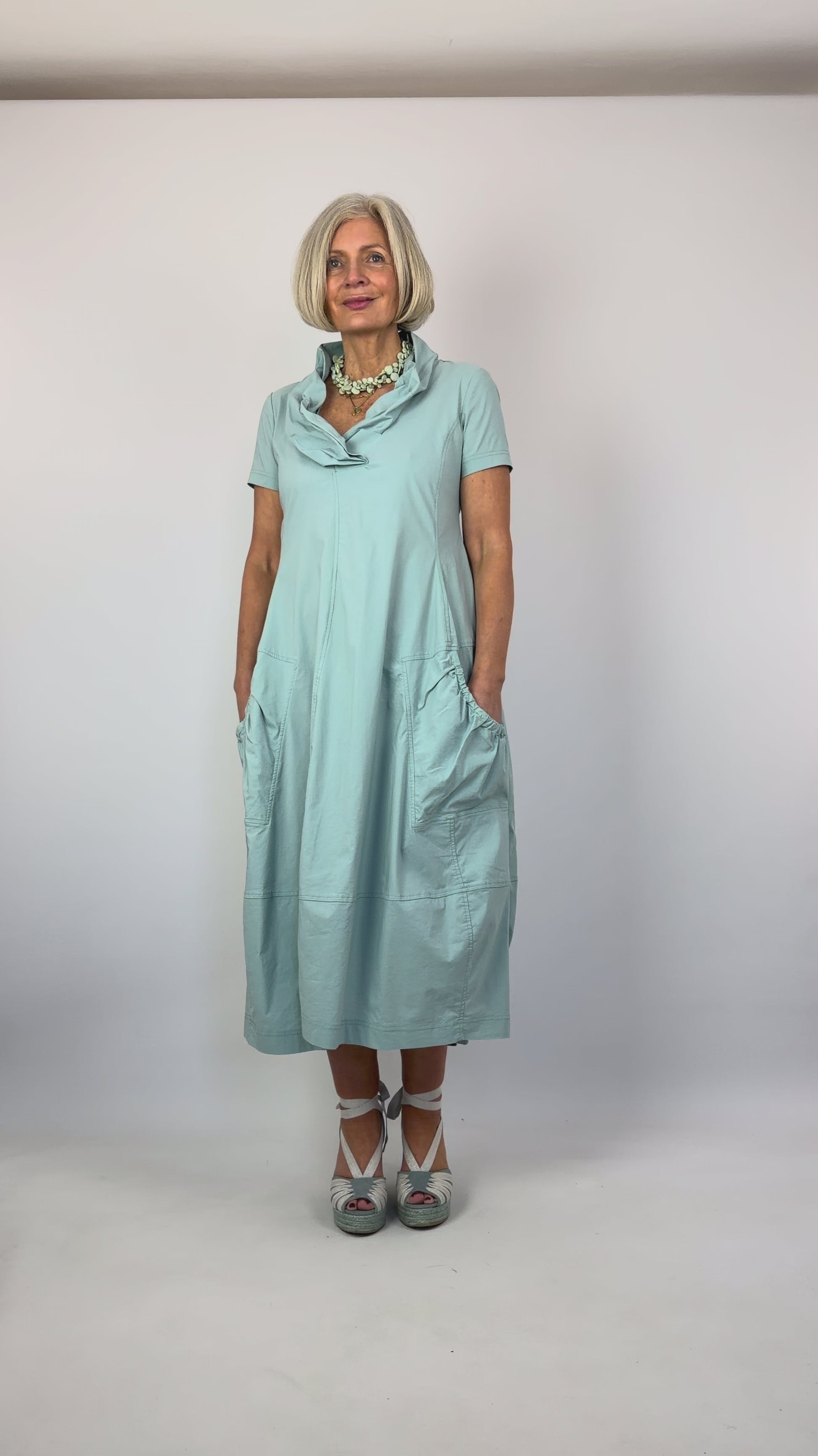 This Rundholz Black Label dress showcases the label's signature technical stretch fabric, engineered for both comfort and refined silhouette. The fitted bodice contrasts beautifully with a voluminous balloon skirt, while layered fabric at the V-neckline adds sculptural dimension. Gathered pockets punctuate the design with architectural detail, and short sleeves complete the contemporary aesthetic. A statement piece for those who appreciate innovative construction and understated luxury.
