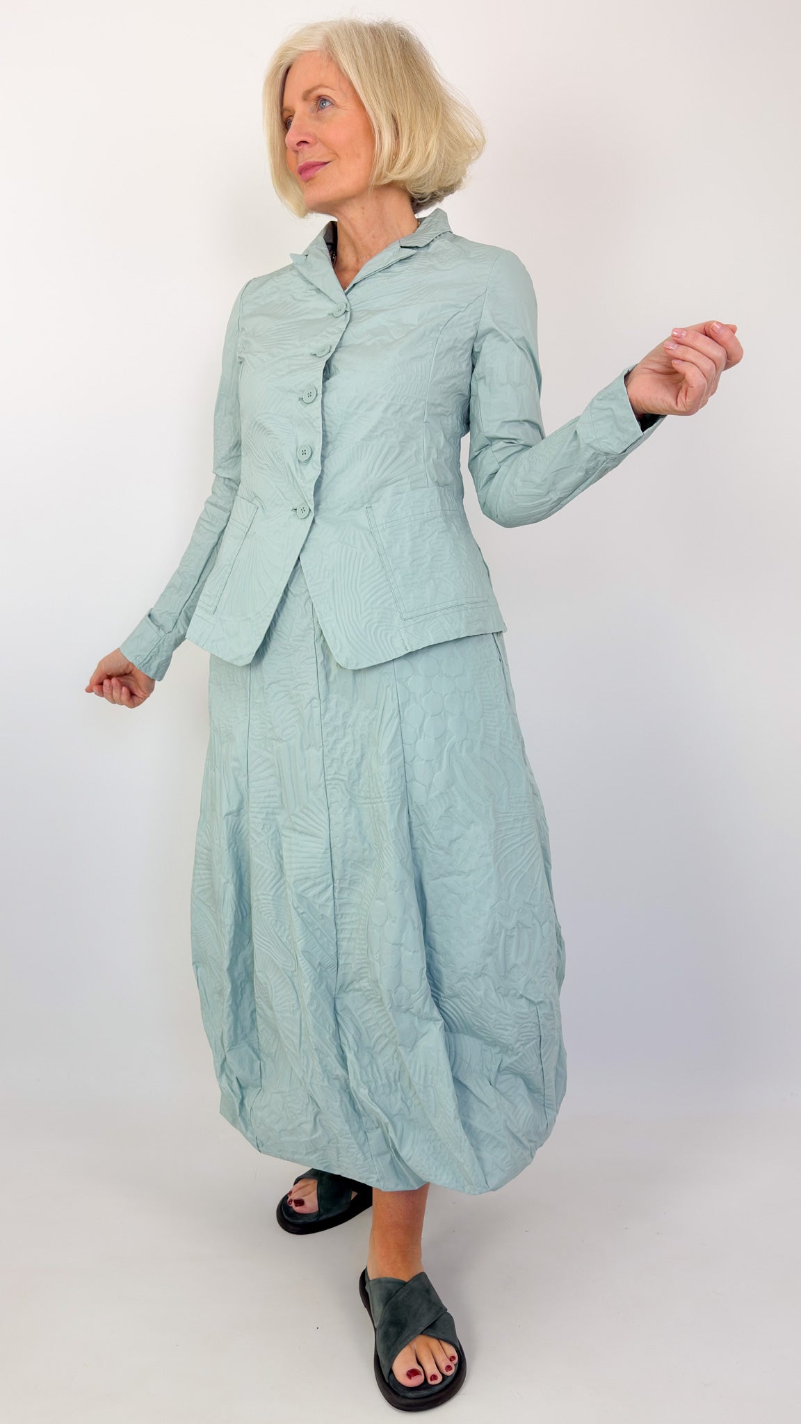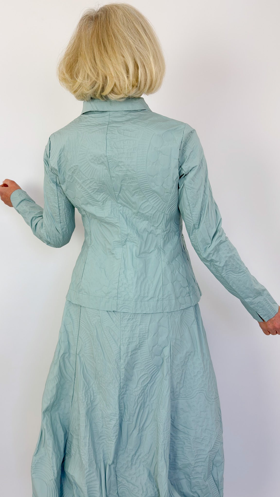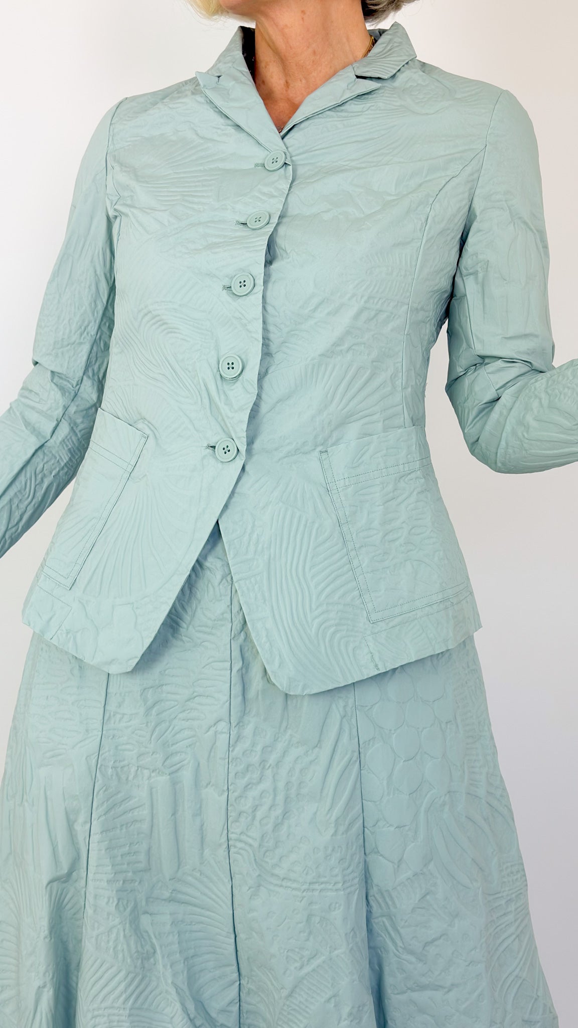 A beautifully cut jacket crafted from textured stretch fabric that moves with you. Features a classic button front, fitted silhouette, and structured collar for polished elegance. Two front pockets add practical style. The mint pop print brings contemporary flair to any wardrobe. Pair with the matching skirt to create a sophisticated summer suit, or wear solo over dresses and trousers for versatile layering.