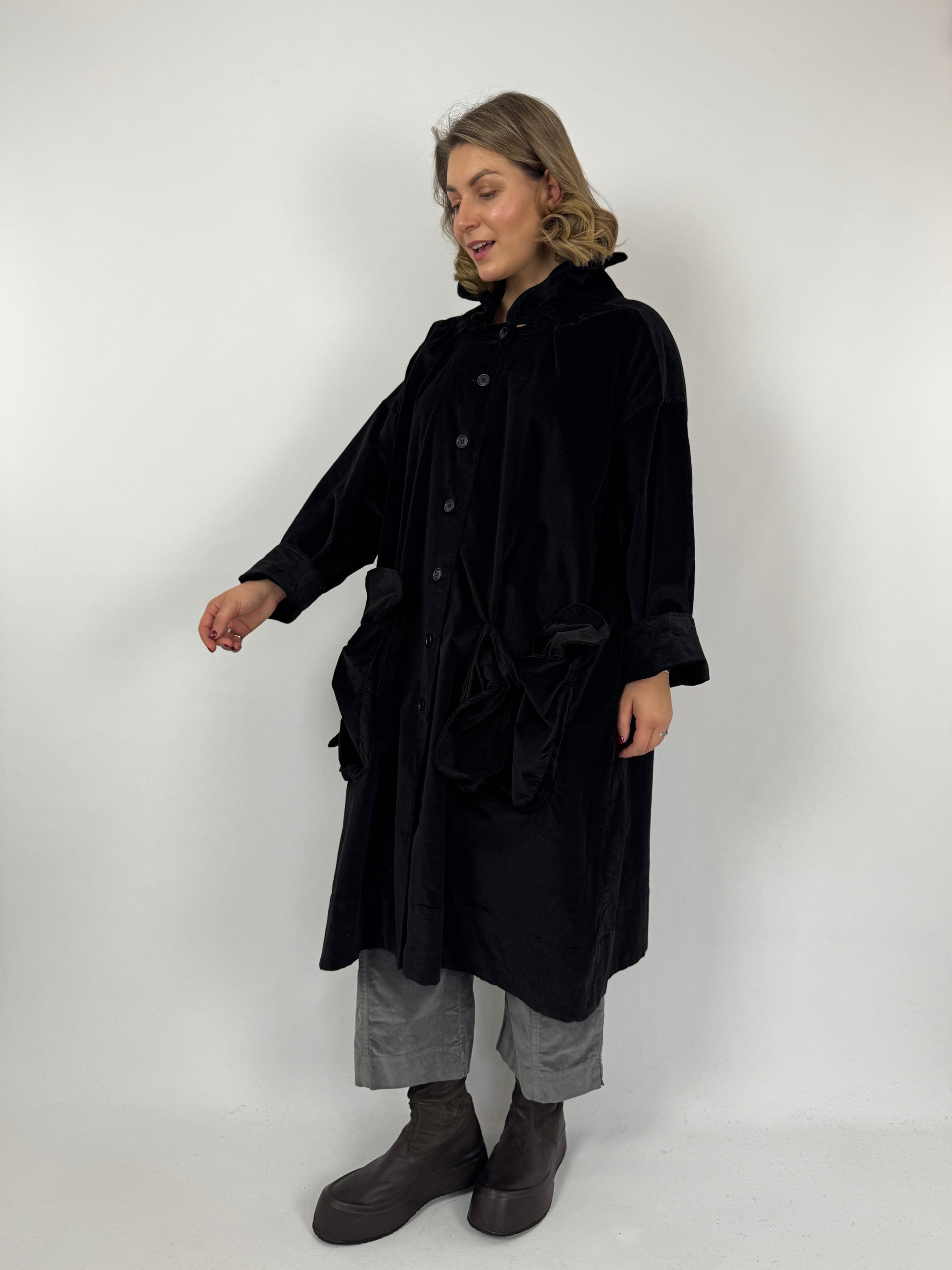 This Rundholz Black Label 1203 coat combines drama with distinctive style. Crafted from velvet cotton, its heavy, oversized silhouette offers comfortable layering. The frill neckline adds a refined touch, while the large front pockets feature elegant tie details that enhance both function and design. Secured with button fastening, this piece exemplifies expert craftsmanship and unique, wearable fashion.