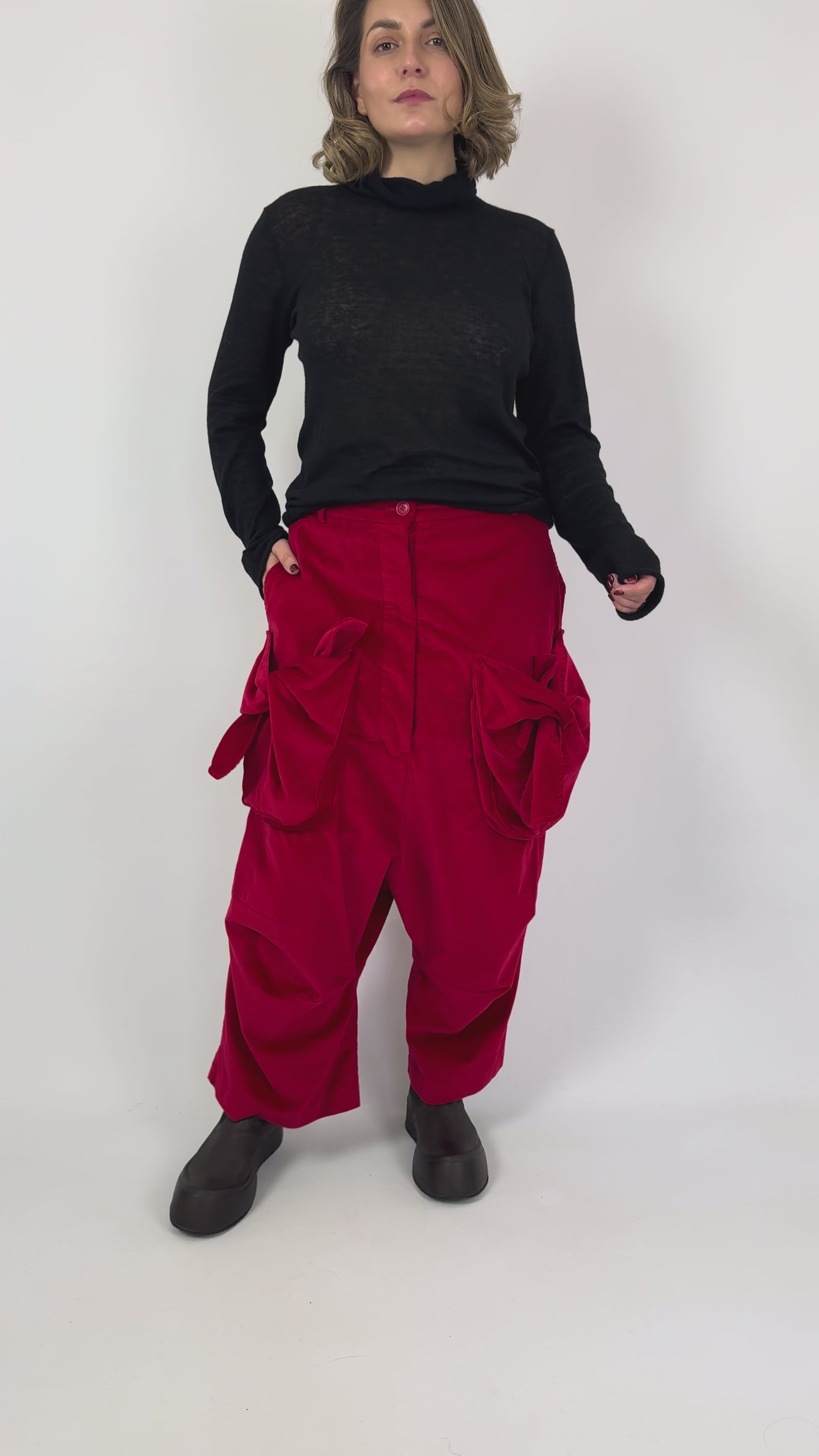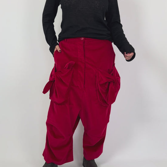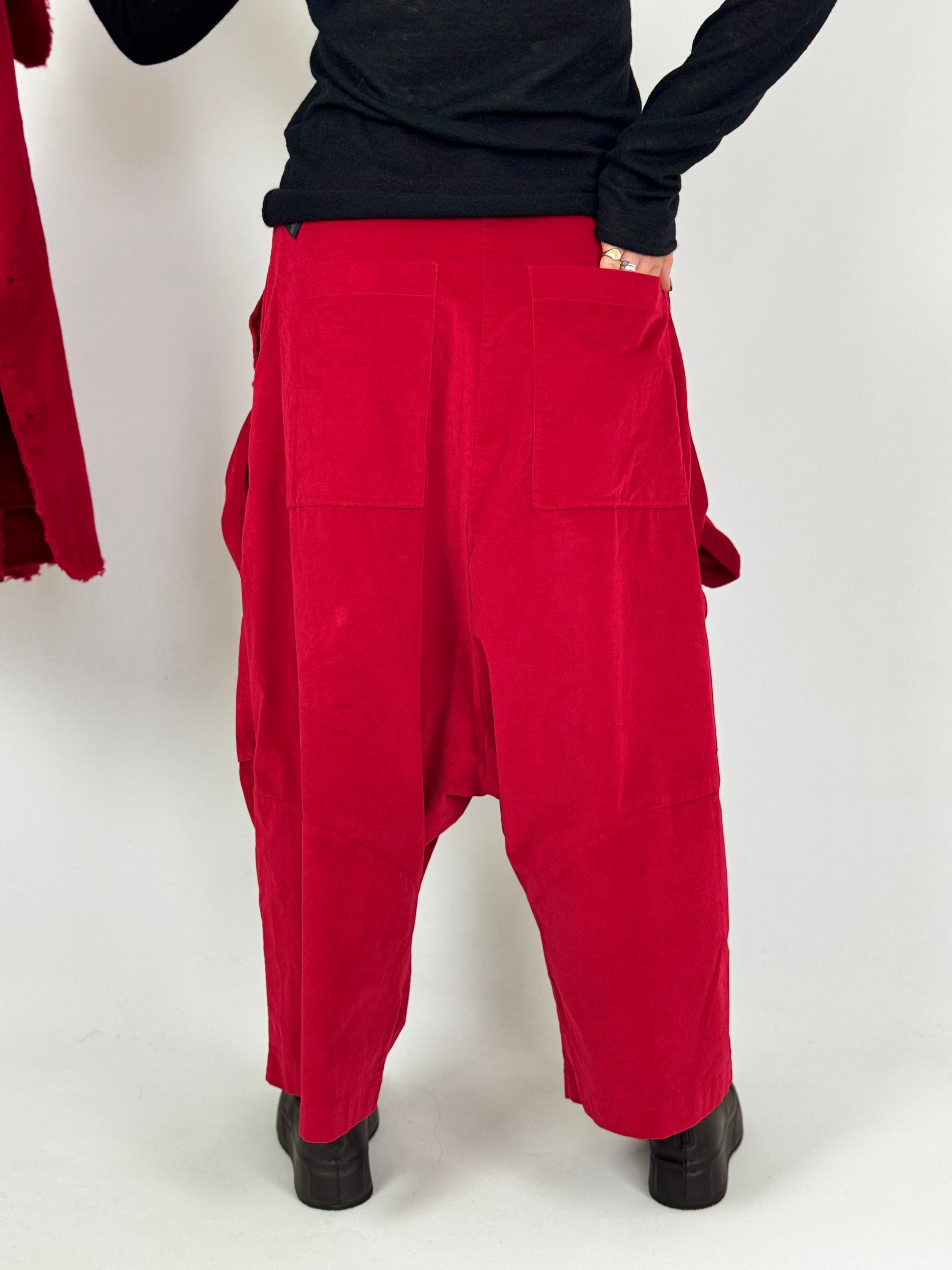 These Rundholz Black Label trousers in dark grey combine cotton velvet stretch fabric with an oversized silhouette for comfort and style. Featuring two large front pockets highlighted by elegant tie details, they offer practical storage with a refined touch. A button fastening completes the look while the drop crotch design adds a modern, relaxed fit, making these trousers a sophisticated yet comfortable wardrobe staple.