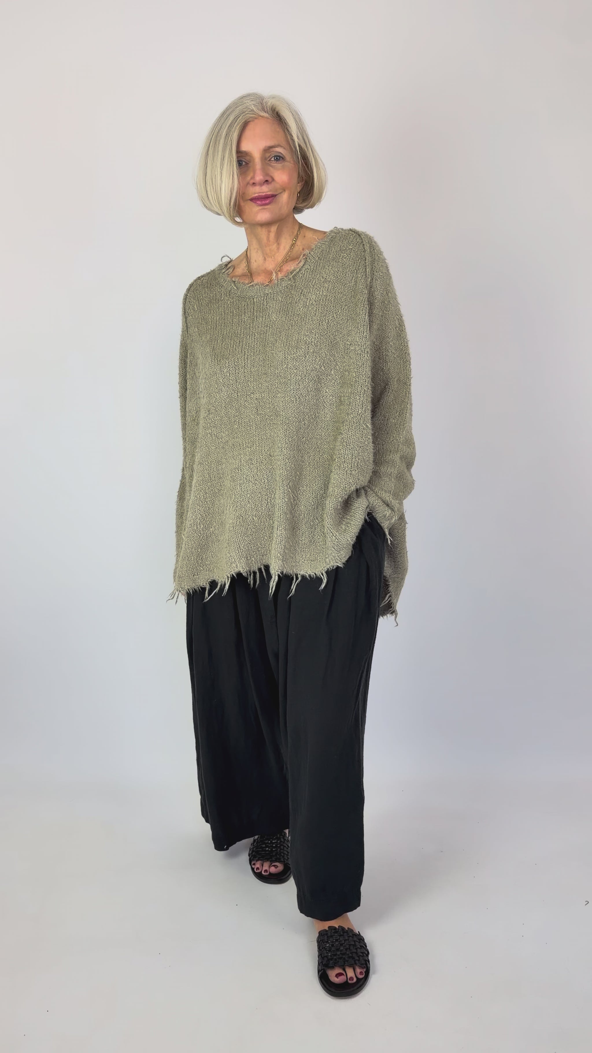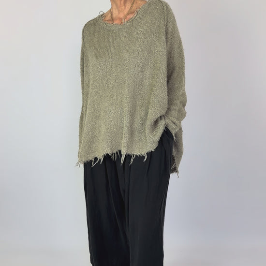 Crafted from luxurious silk, this oversized jumper showcases a distinctive shaggy knit texture that adds depth and visual interest. The relaxed round neckline and raglan sleeves create an effortlessly sophisticated silhouette, while intentional frayed edges enhance its contemporary aesthetic. Perfect for layering or wearing as a statement piece, this jumper balances comfort with refined style.