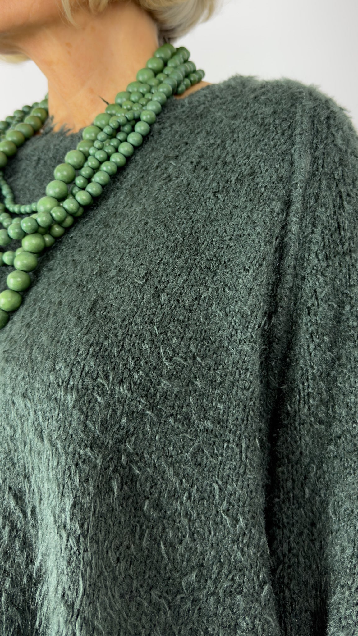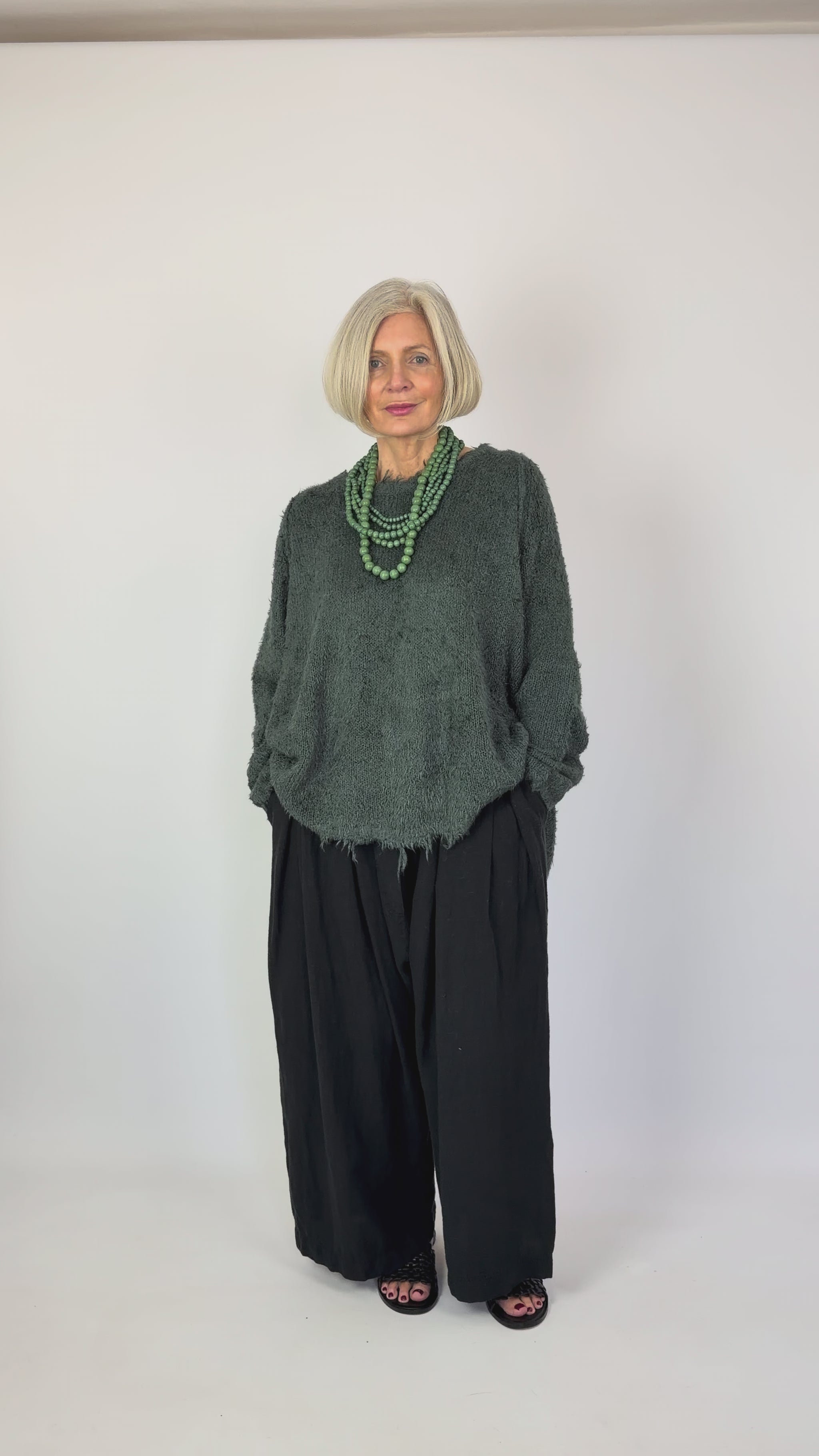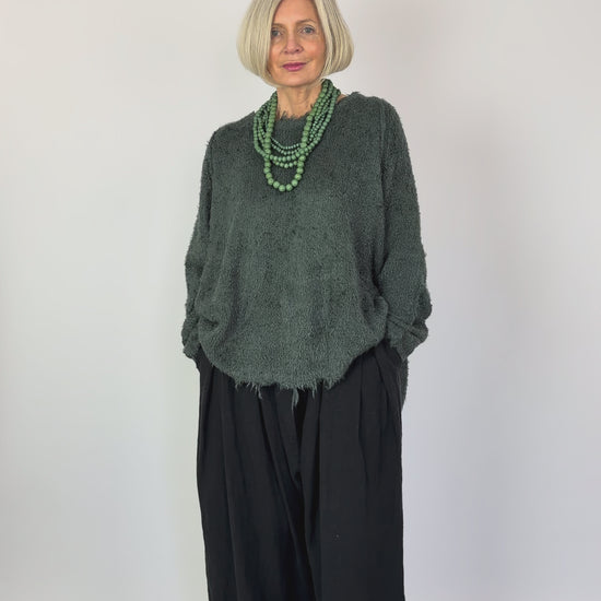 Crafted from luxurious silk, this oversized jumper showcases a distinctive shaggy knit texture that adds depth and visual interest. The relaxed round neckline and raglan sleeves create an effortlessly sophisticated silhouette, while intentional frayed edges enhance its contemporary aesthetic. Perfect for layering or wearing as a statement piece, this jumper balances comfort with refined style.