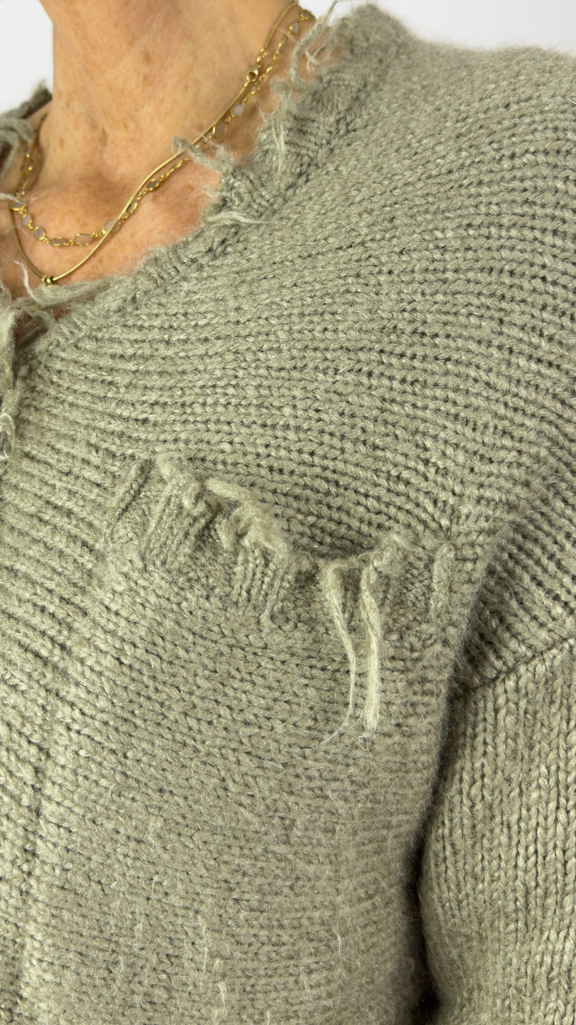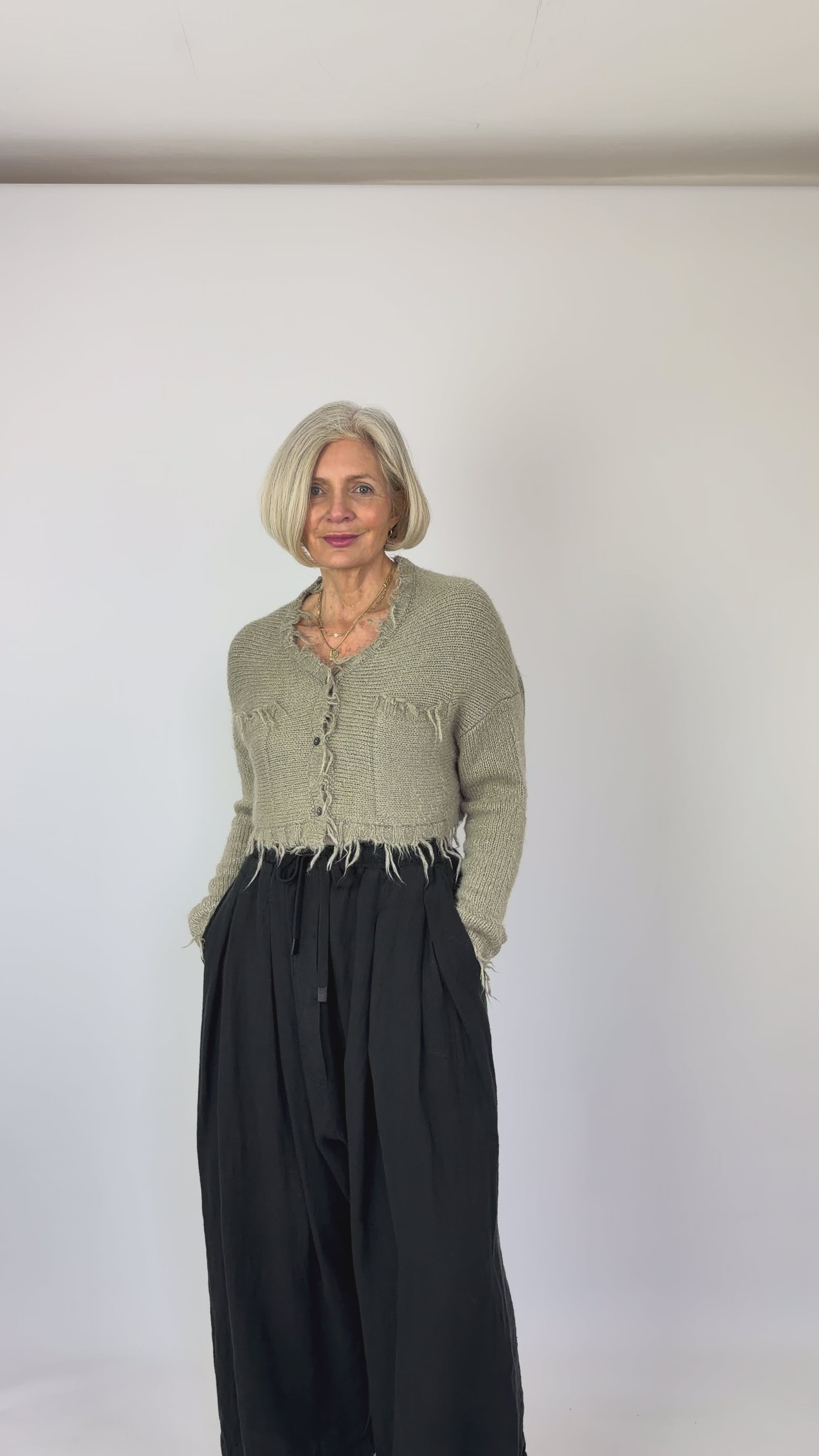 Rundholz Dip's signature boxy cardigan delivers effortless layering in a loose, shaggy knit that captures contemporary ease. The cropped silhouette pairs seamlessly with high-waisted pieces, while intentional frayed edges add textural depth and movement. Long front pockets provide visual dimension, secured with button fastening for refined simplicity. A versatile seaweed tone grounds any wardrobe, making this piece an essential transitional layer for considered dressing.