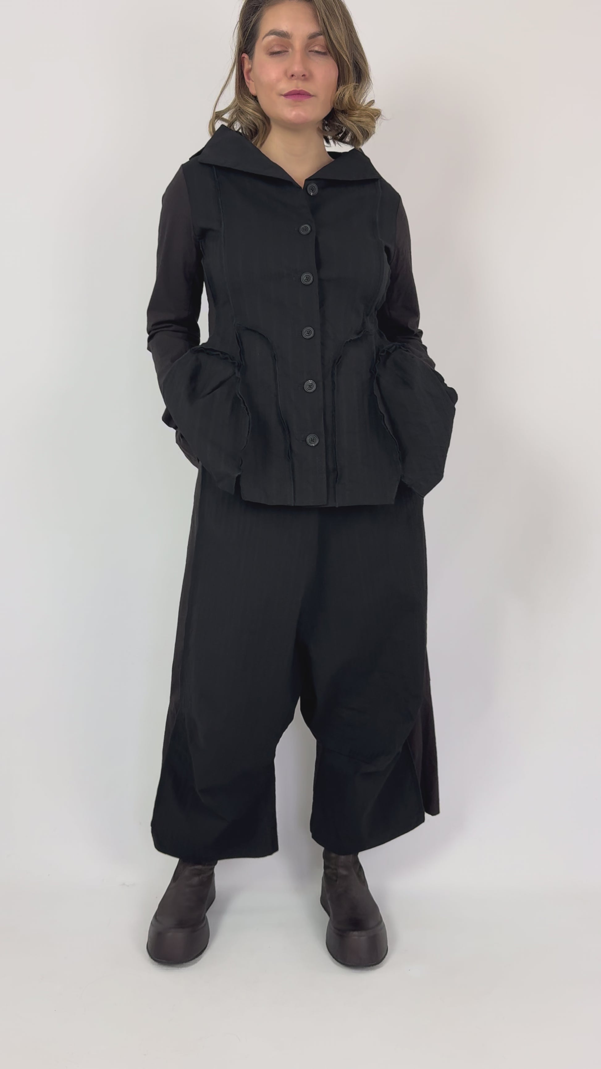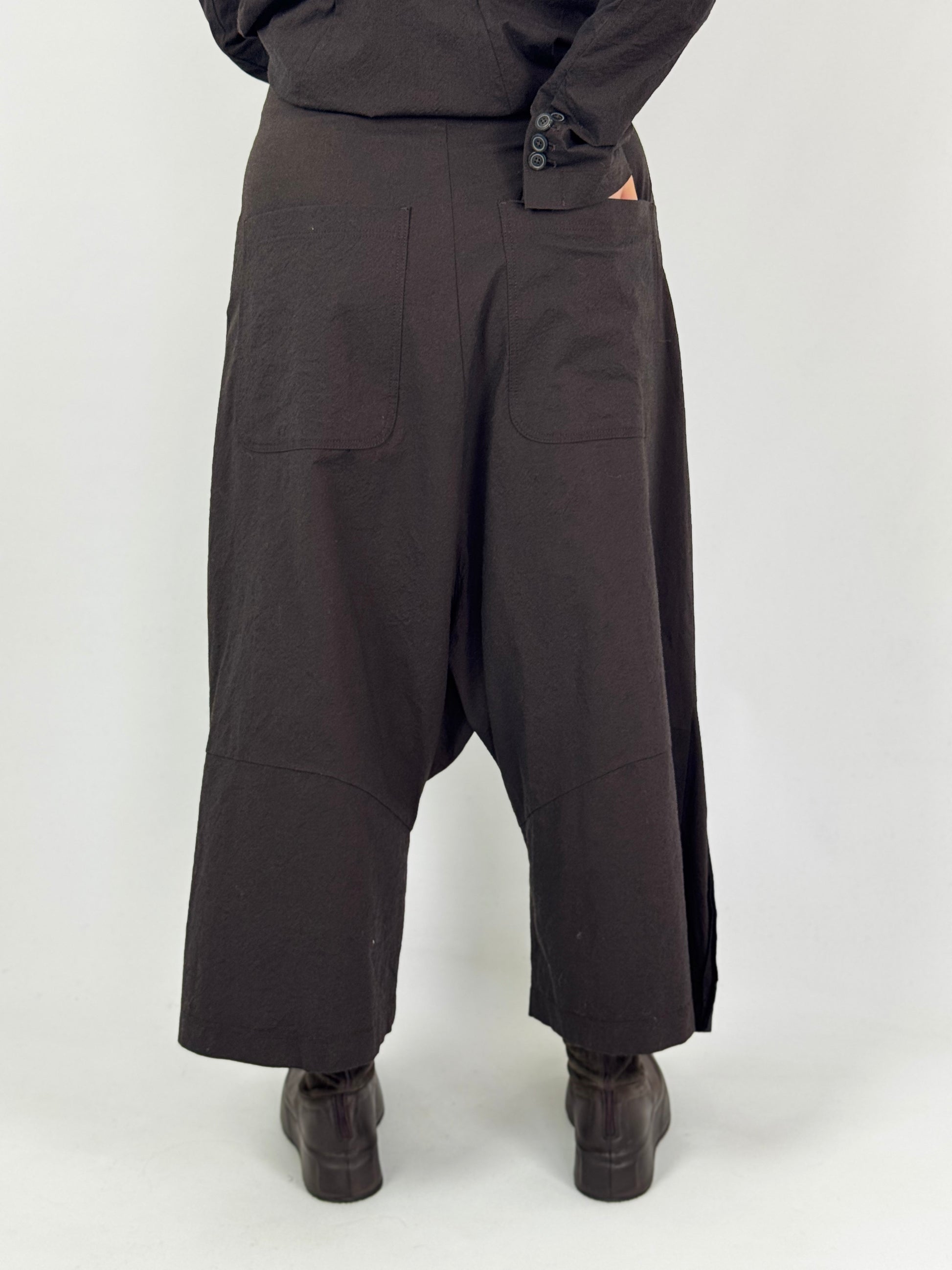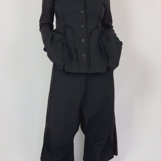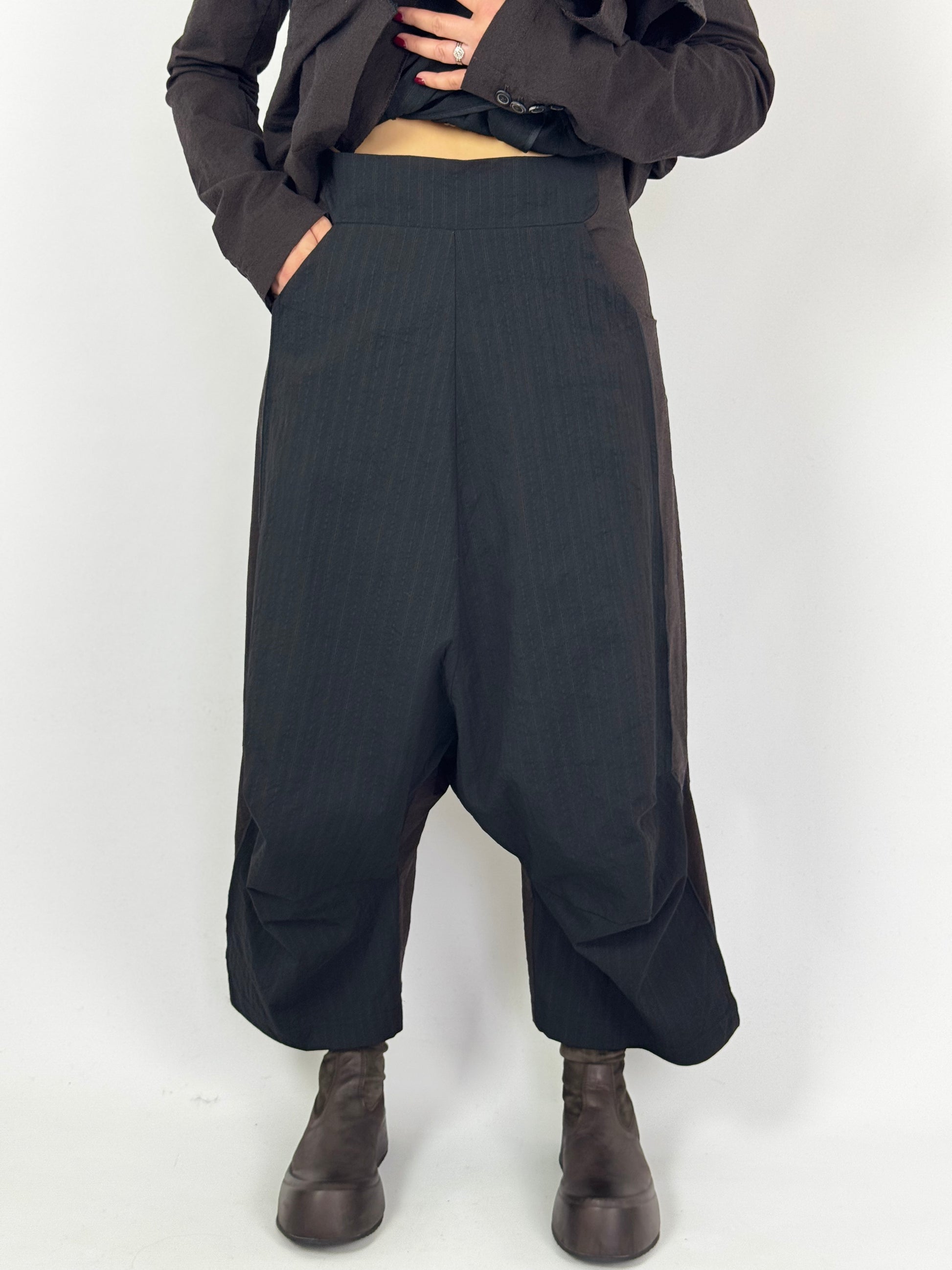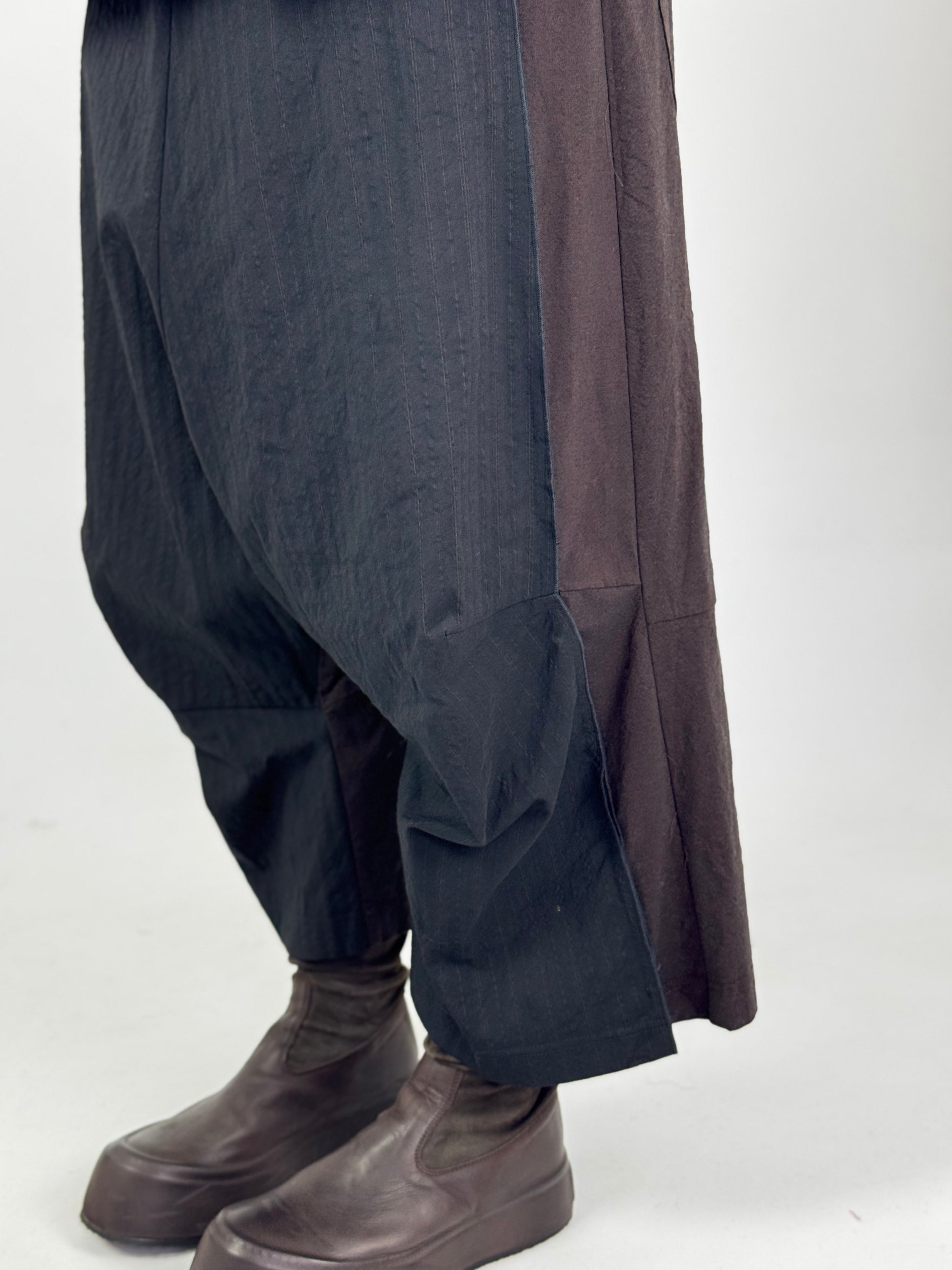 These Rundholz Mainline 0106 trousers combine artisanal patchwork with modern tailoring. Crafted from a wool mix, the front features sleek black striped fabric, while the sides and back contrast in deep purple stretch for a comfortable fit. The dropped crotch silhouette adds a contemporary edge, complemented by raw-edge detailing and practical pockets. Designed for those who appreciate unique textures and sophisticated construction, these trousers offer both style and ease of movement.
