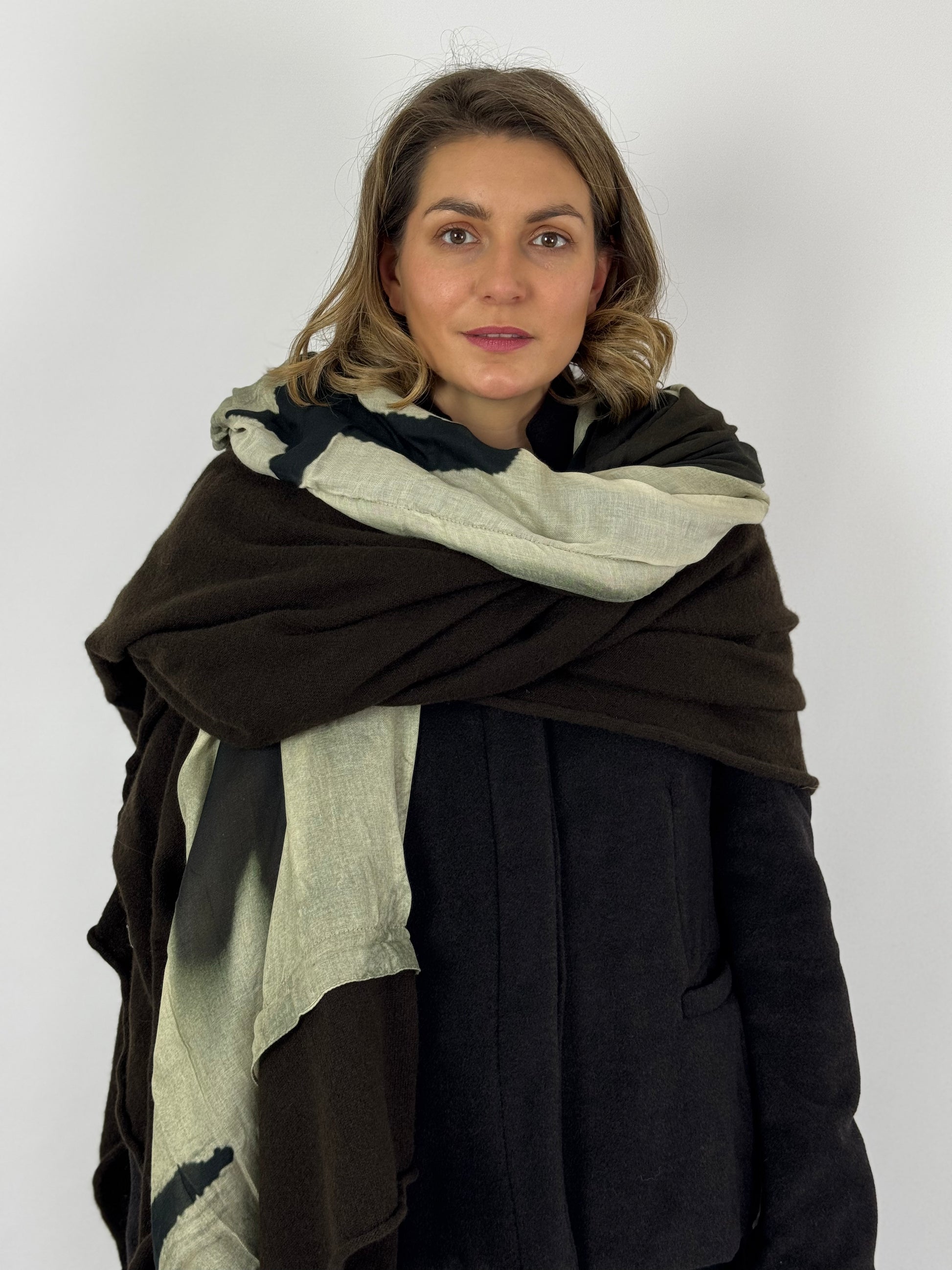 Elevate your layering with the Rundholz Mainline 7702 Scarf Turf, a large blanket scarf crafted from a premium wool blend with soft modal. This piece features a distinctive attached print scarf, creating a unique, versatile design that blends warmth with sophisticated style. Ideal for adding depth to any outfit, it delivers both comfort and a striking visual statement for those seeking refined, expert-crafted outerwear accessories.
