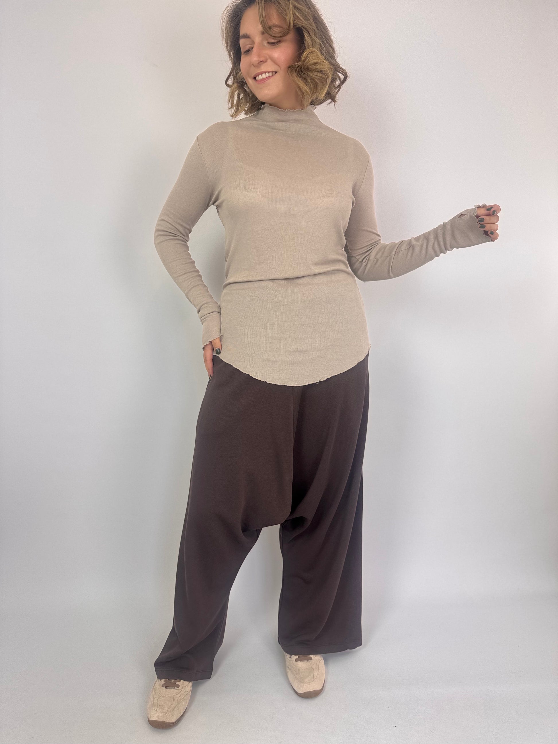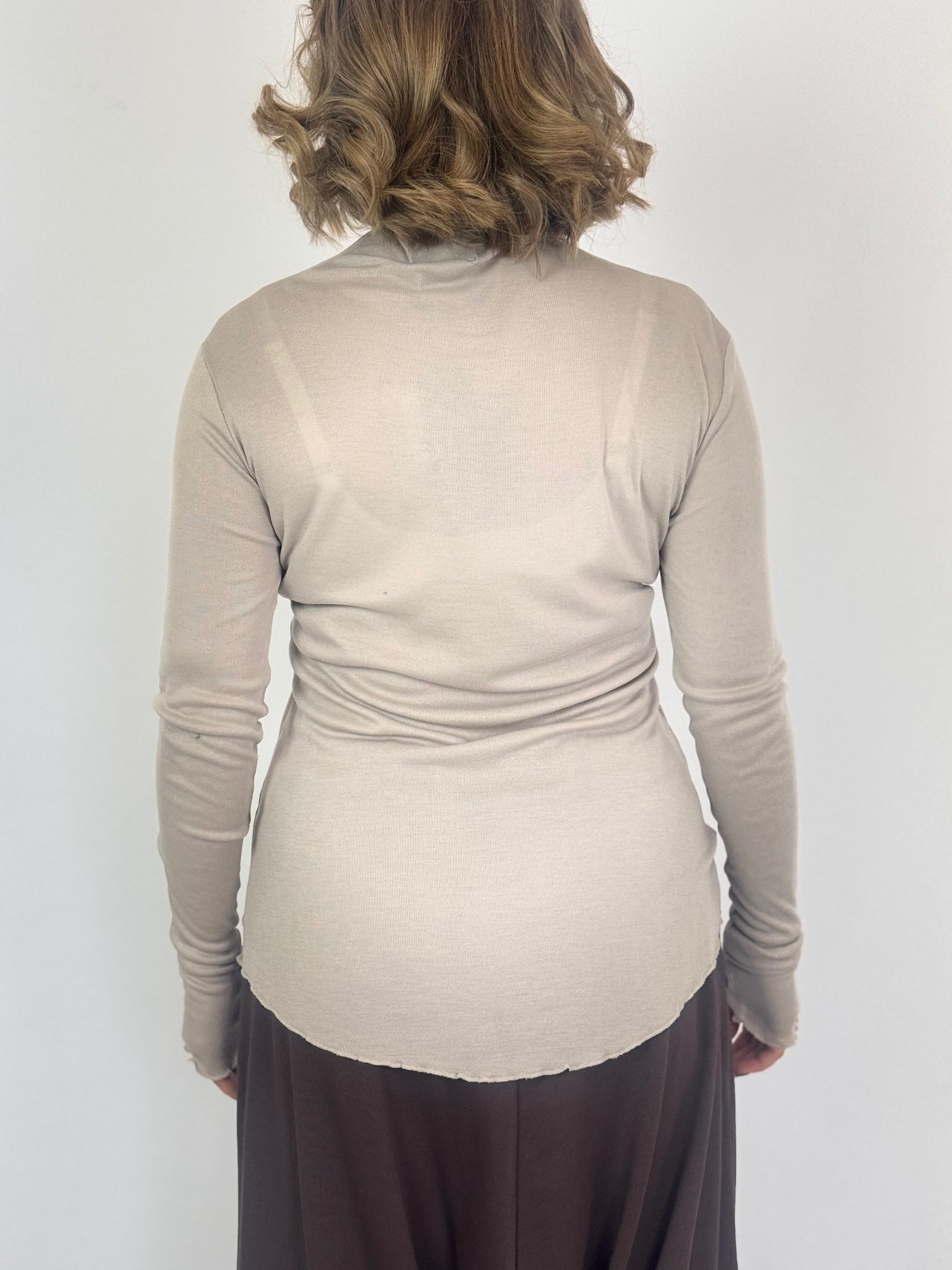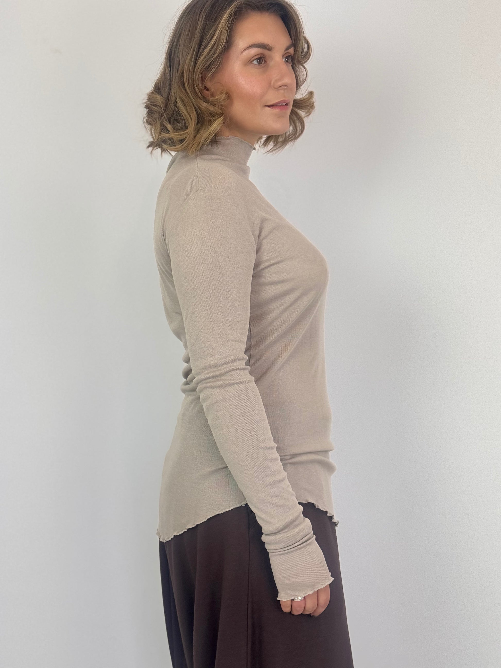 This long slim fitted top in Agilo features a high neckline with delicate scalloped edges and long sleeves with thumb holes for added comfort and style. Crafted from a luxurious blend of modal and silk, it offers a soft, breathable feel ideal for layering throughout the seasons. Its sleek silhouette makes it a versatile wardrobe staple that balances elegance with functionality.