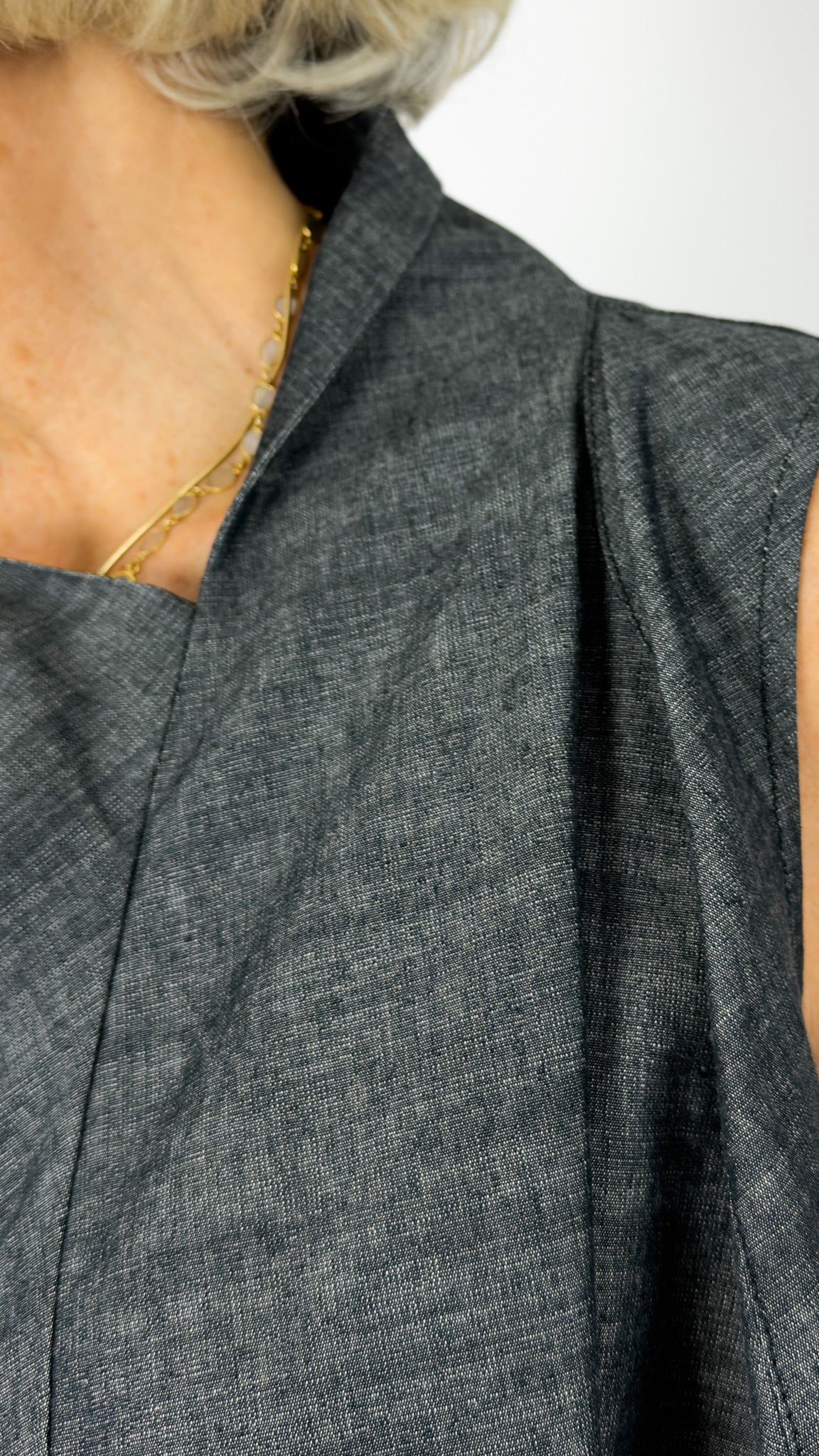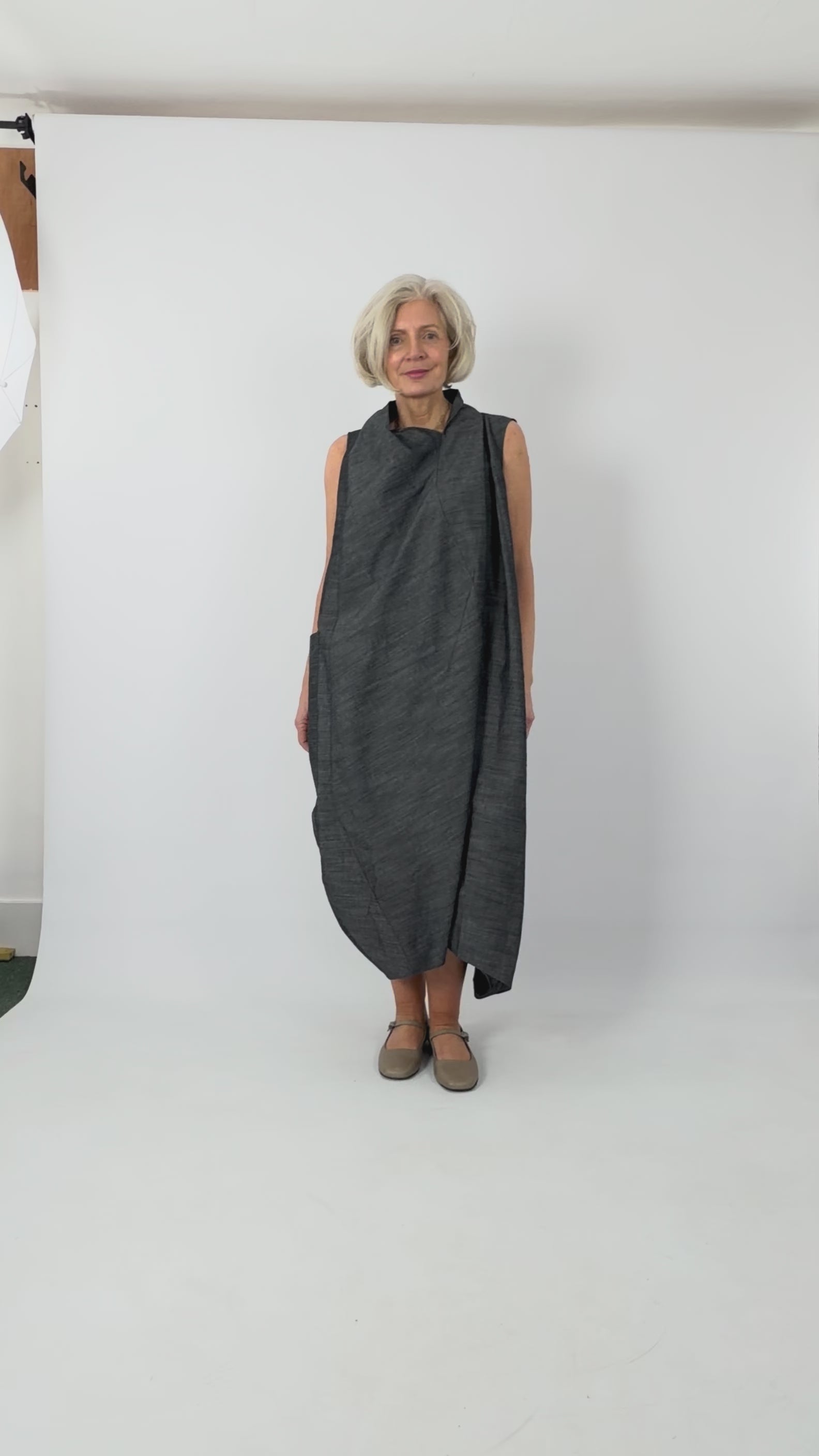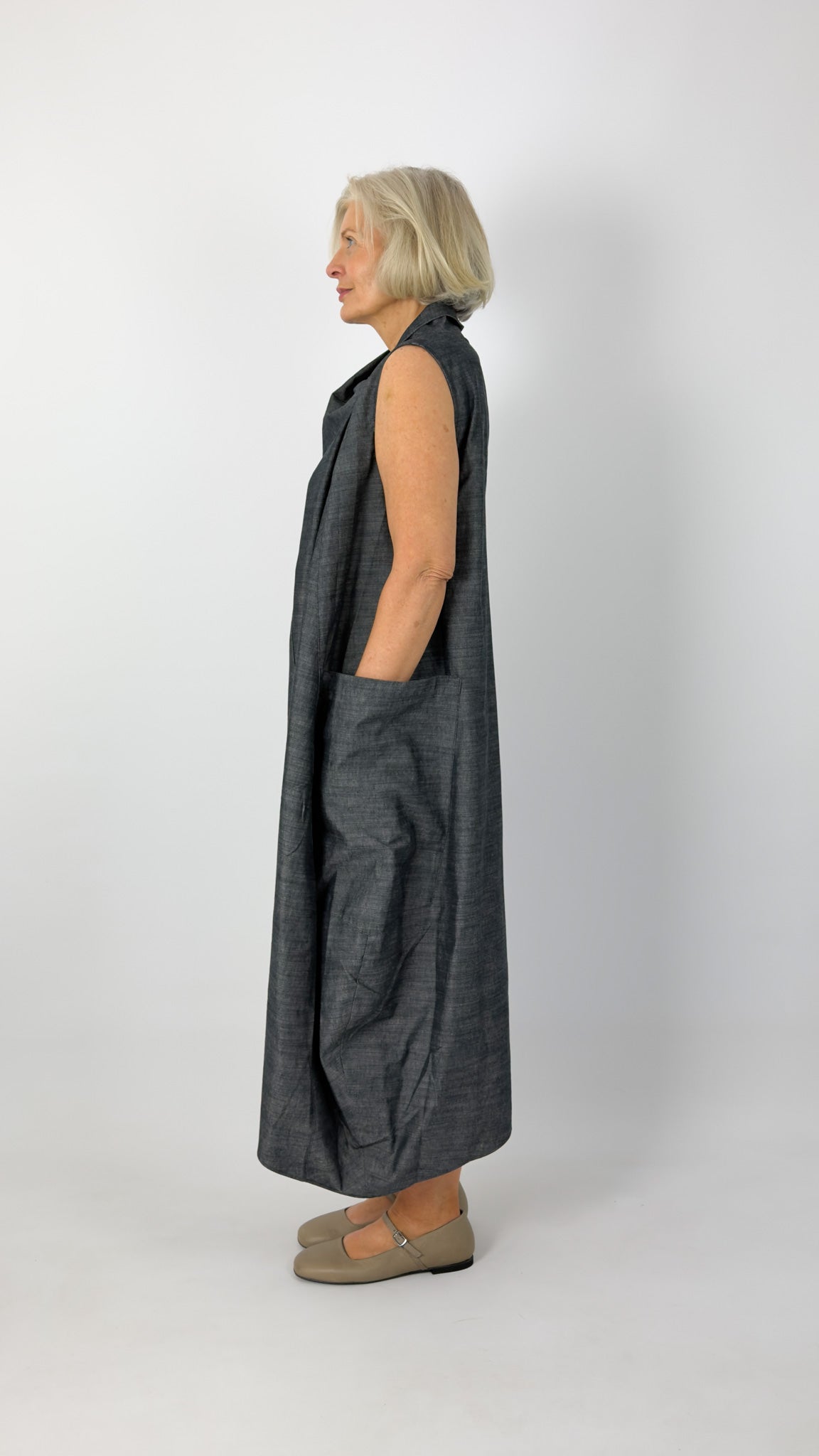 This sophisticated sleeveless dress combines refined tailoring with thoughtful design details. Crafted from a cotton-rich blend, it features an elegant silhouette with subtle balloon shaping through the body. The standout design element—carefully folded fabric at the neckline—creates striking texture and visual depth. Practical side seam pockets add functionality without compromising the polished aesthetic. The blue-grey colourway offers versatile styling for both professional and casual occasions. A timeless piece that balances contemporary design with wearable elegance.