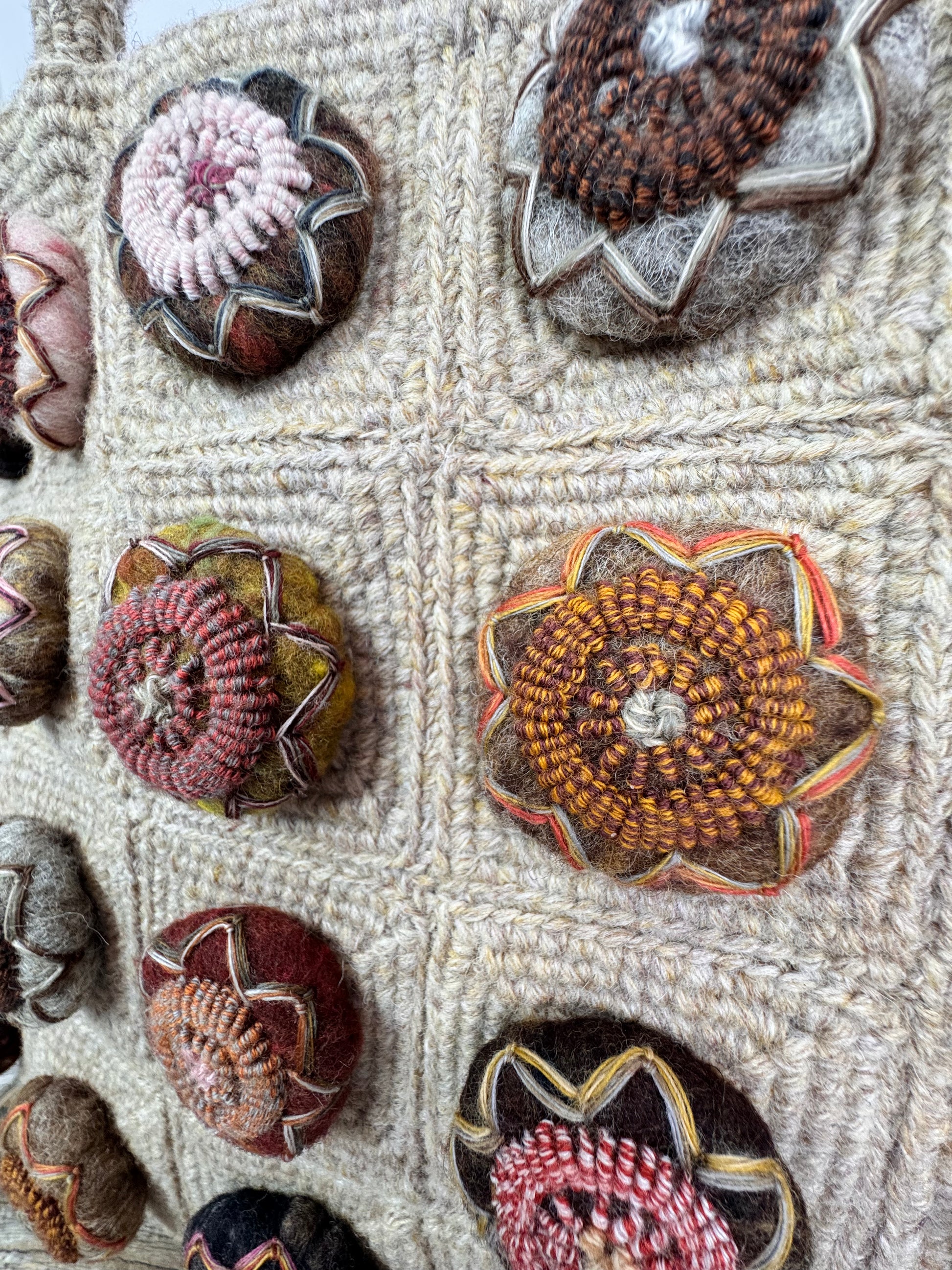This hand-embroidered French design bag showcases exceptional craftsmanship at every stage. Wool is custom-dyed to the designer's precise specifications, with each square individually woven before being meticulously sewn together. Every decorative ball is handmade, contributing to the bag's distinctive character. The open design features a single central tie closure and a woven wool handle, creating an understated yet striking silhouette. A truly unique piece that reflects the artistry of its creation.