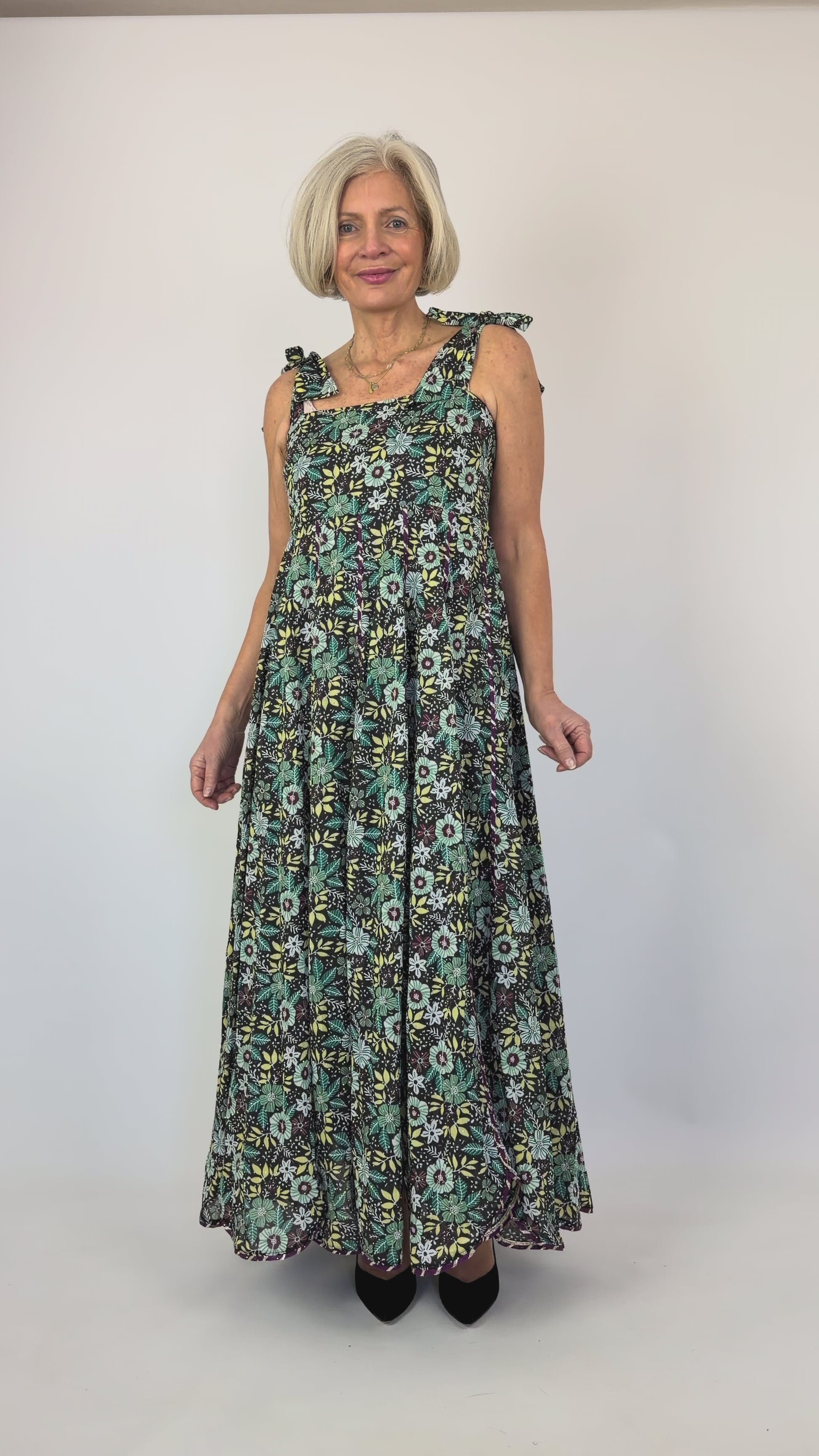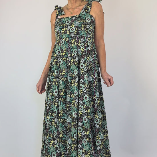 Elevate your evening with this stunning party dress, designed to captivate. Delicate shoulder ties frame the neckline while a fitted bodice flatters your silhouette before flowing into a graceful flared skirt. The dramatic black background showcases a striking floral print that commands attention, whilst scattered crystals catch the light with every movement, adding an enchanting shimmer. Perfect for celebrations where you want to make a memorable impression.