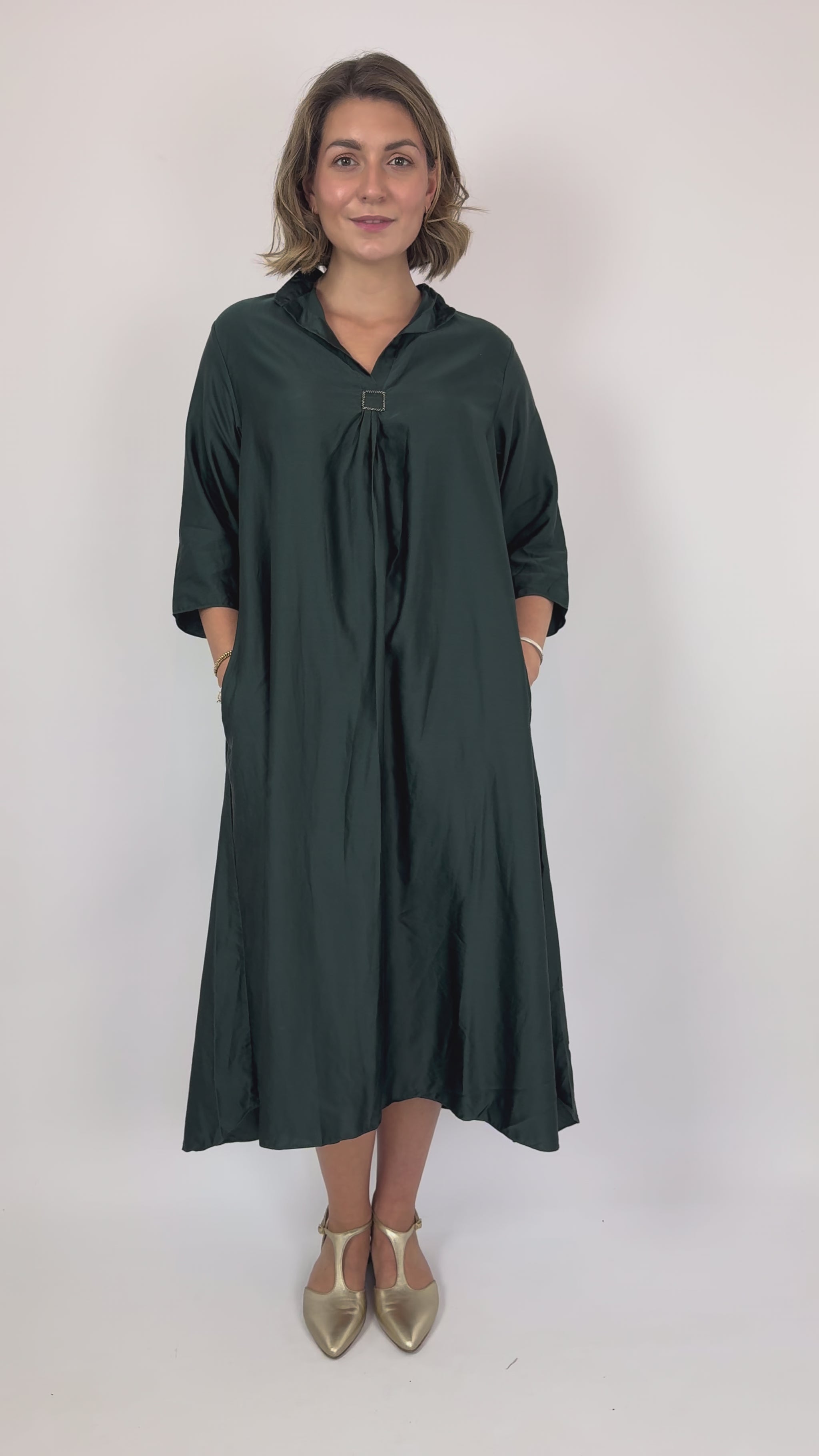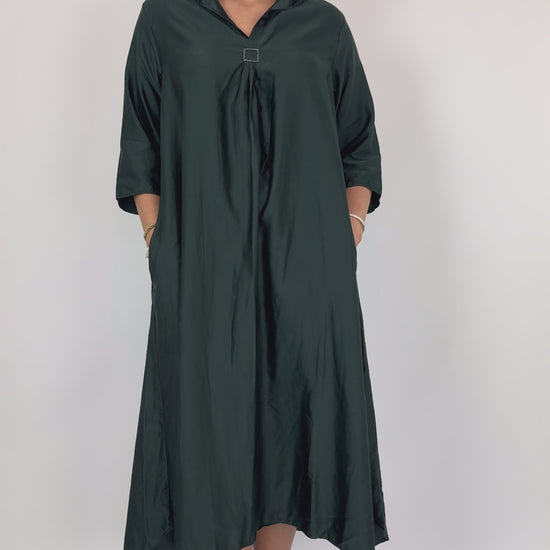 The Sula Dewey Dress in Dark Spruce is expertly crafted from durable silk cotton satin, offering a comfortable and washable fabric with a subtle sheen. This mid-calf A-line silhouette features three-quarter length sleeves, raw edges on the hem and cuffs, and a hand-stitched tab at the front opening, blending refined details with everyday practicality for an effortlessly elegant look.