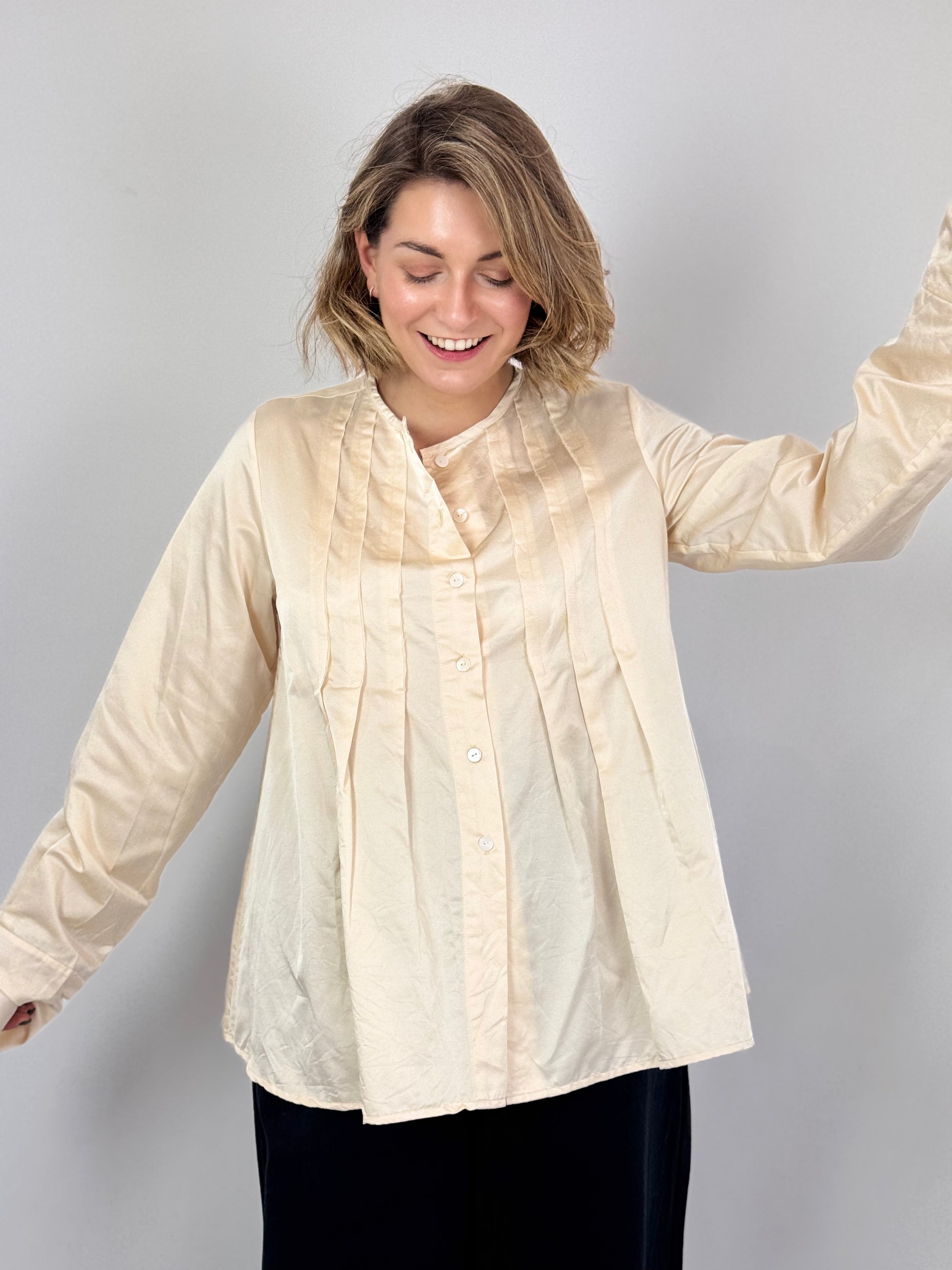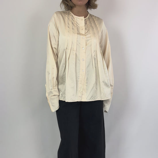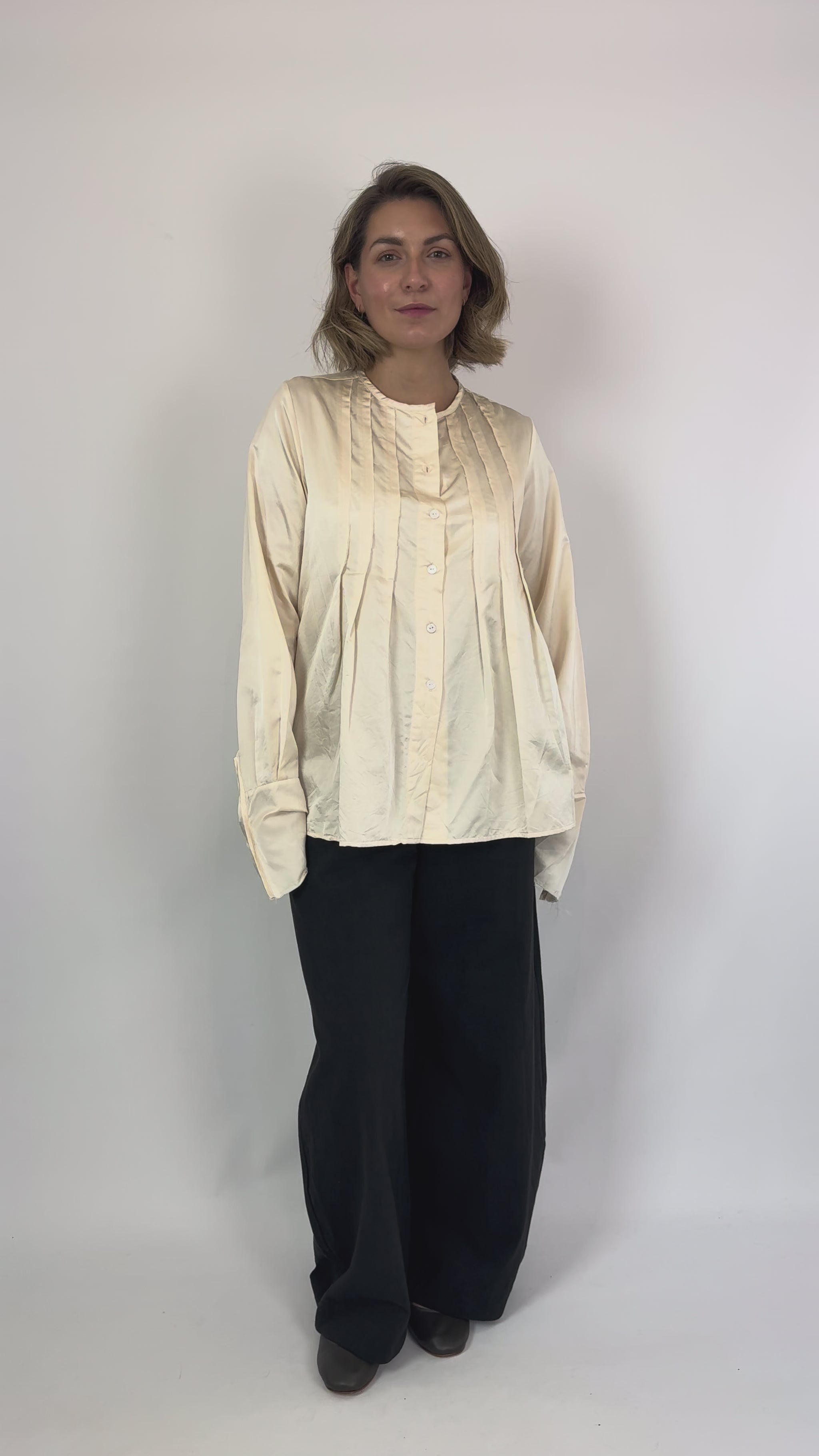The Sula Pleat Shirt Eggnog combines luxurious silk cotton satin with expert tailoring. Featuring raw cut pleats on the front bodice, this shirt offers a distinctive, refined texture. Its relaxed fit and long cuffs ensure comfort and versatility, while pearl buttons secure the centre front for a polished finish. Crafted from durable, washable silk cotton satin with a subtle matte sheen, it balances elegance with practicality for everyday wear.
