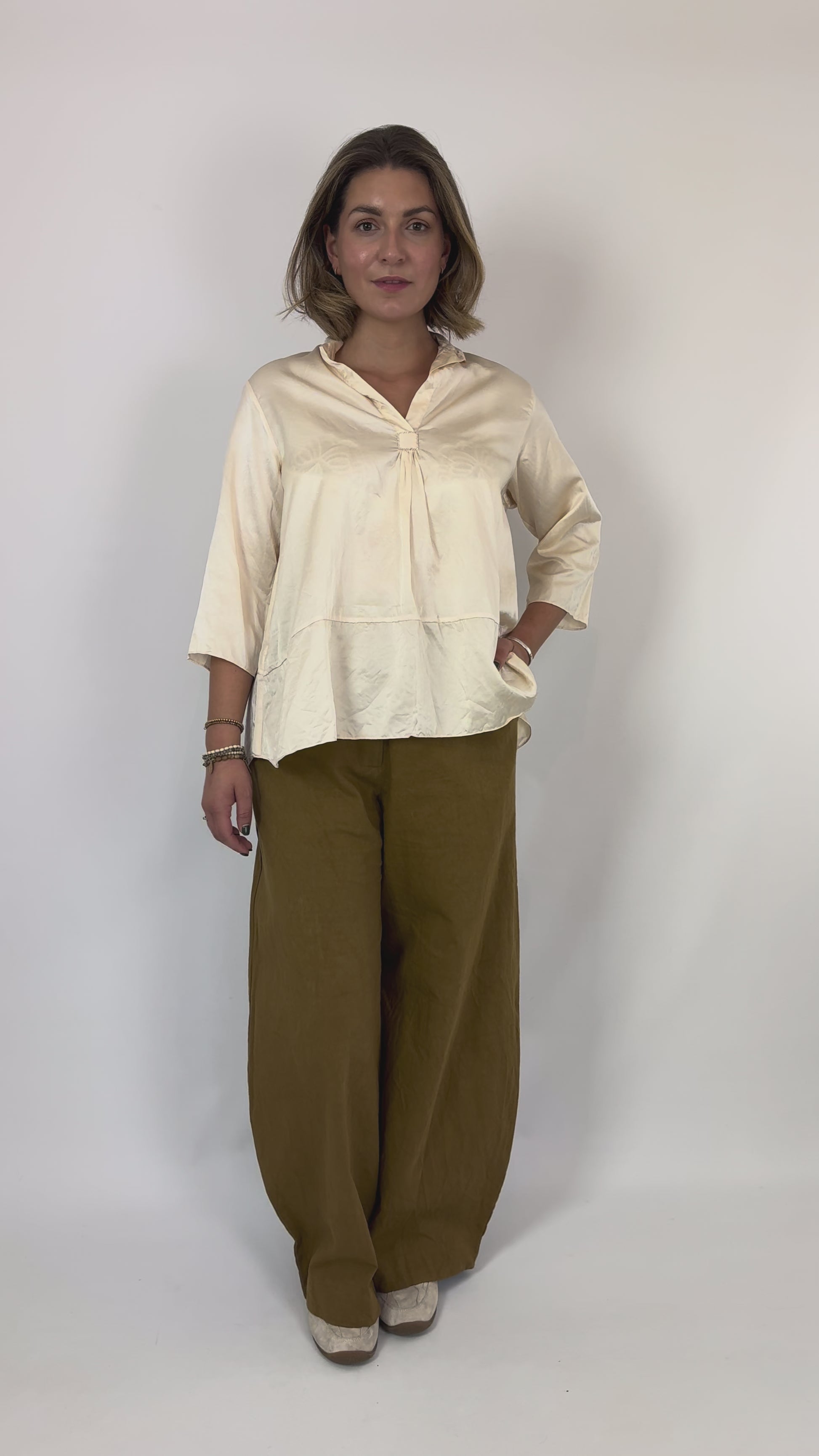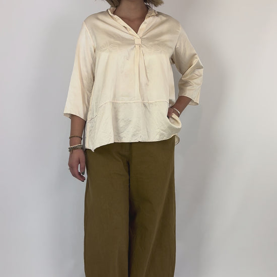 The Sula Sunny Shirt Eggnog is an expertly crafted satin blouse designed for effortless elegance. Featuring a relaxed, hip-length silhouette and three-quarter sleeves, it offers comfort without compromising style. A distinctive panel runs along the front and back, adding subtle structure, while a hand-stitched tab on the front opening highlights meticulous attention to detail. Ideal for those seeking a refined yet easy-to-wear garment that combines classic design with artisanal touches.