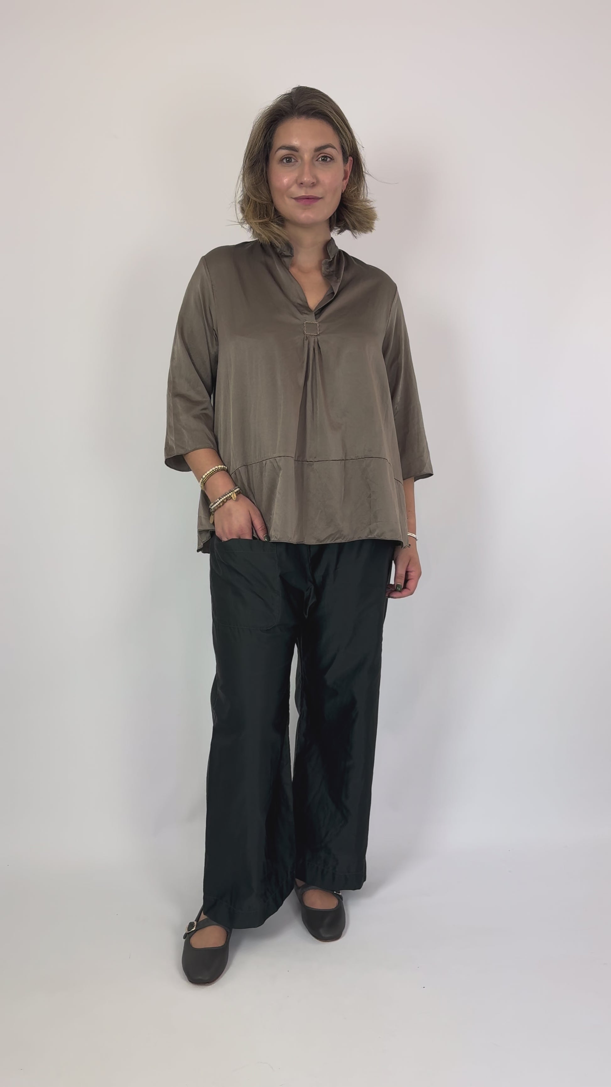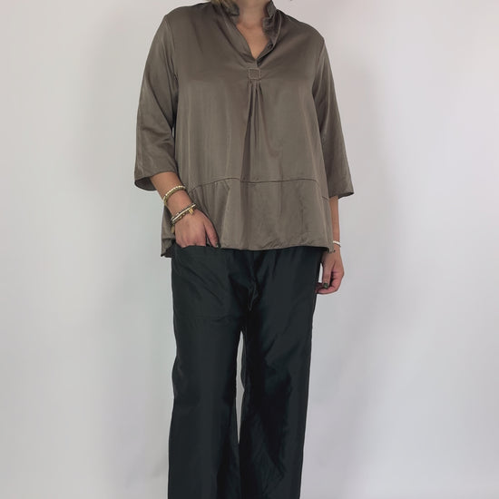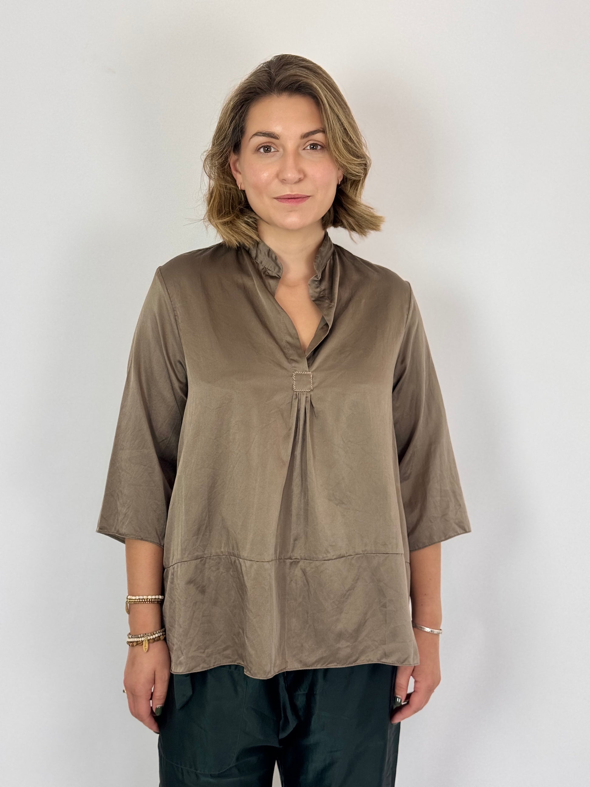 The Sula Sunny Shirt Fossil is an expertly crafted satin blouse designed for effortless elegance. Featuring a relaxed, hip-length silhouette and three-quarter sleeves, it offers comfort without compromising style. A distinctive panel runs along the front and back, adding subtle structure, while a hand-stitched tab on the front opening highlights meticulous attention to detail. Ideal for those seeking a refined yet easy-to-wear garment that combines classic design with artisanal touches.