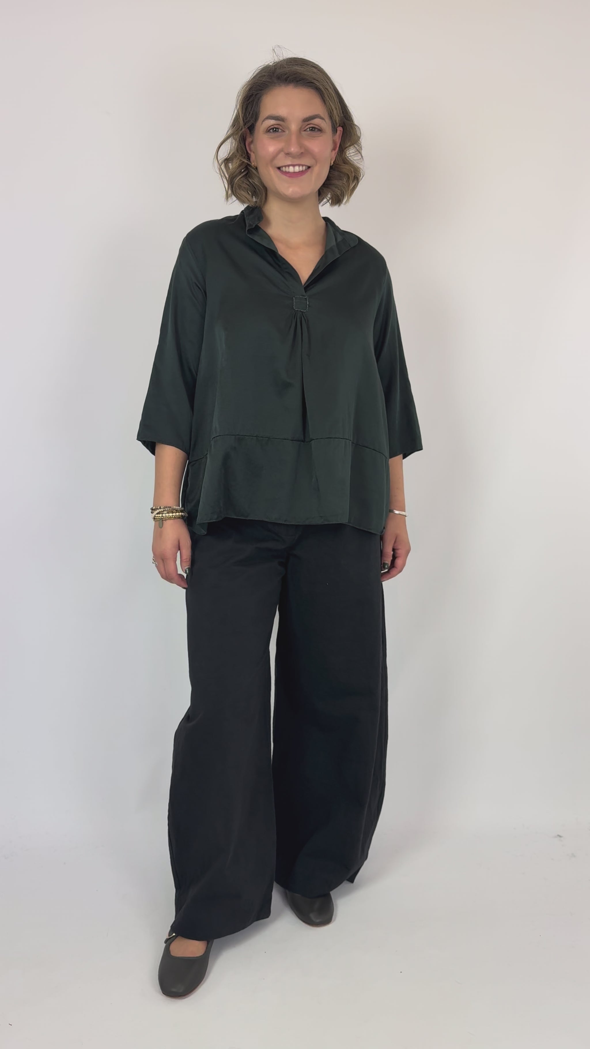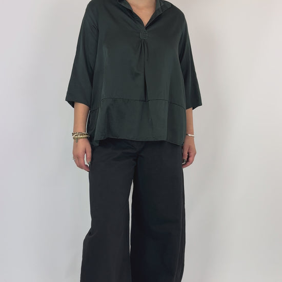 The Sula Sunny Shirt Jet Set is an expertly crafted satin blouse designed for effortless elegance. Featuring a relaxed, hip-length silhouette and three-quarter sleeves, it offers comfort without compromising style. A distinctive panel runs along the front and back, adding subtle structure, while a hand-stitched tab on the front opening highlights meticulous attention to detail. Ideal for those seeking a refined yet easy-to-wear garment that combines classic design with artisanal touches.