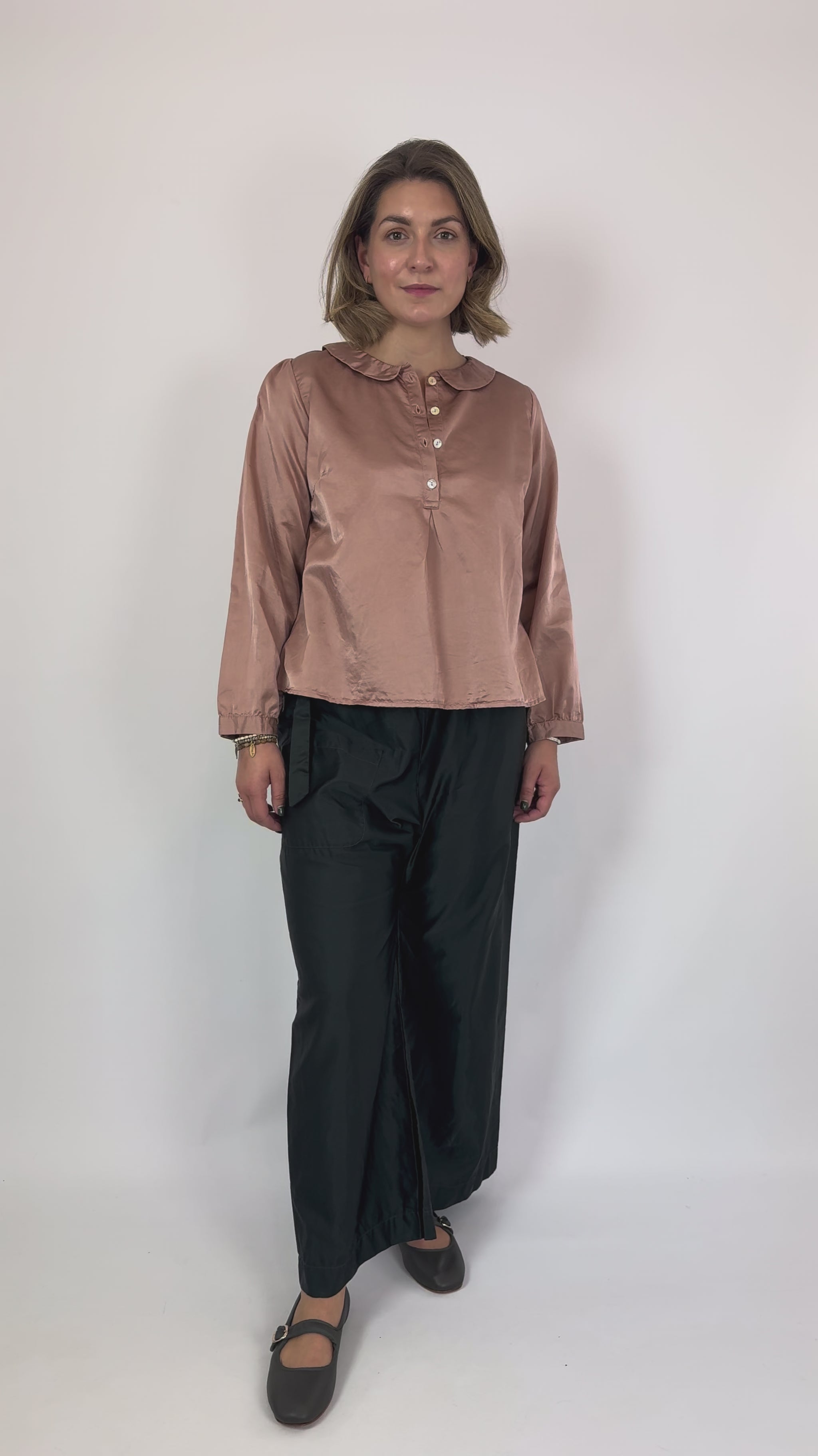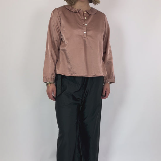 The Sula Sweet Blouse Tuscany features a delicate blend of silk and cotton, crafted to offer a soft, luxurious texture. It showcases a sweet round collar and a button front that extends halfway down, balancing classic style with modern ease. The wrist-length sleeves are expertly gathered at the shoulder and cuff, creating gentle volume and refined structure. This blouse is ideal for those seeking an elegant, versatile piece that enhances both everyday and special occasion looks.
