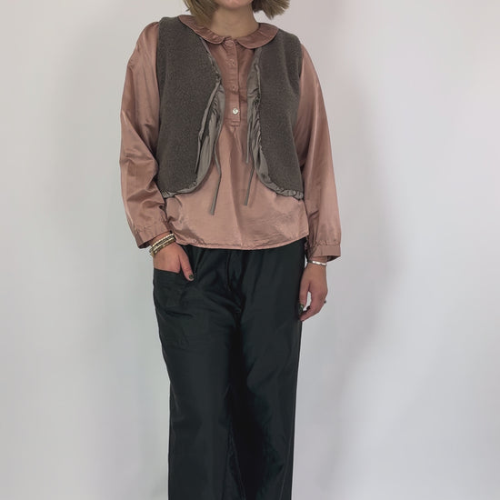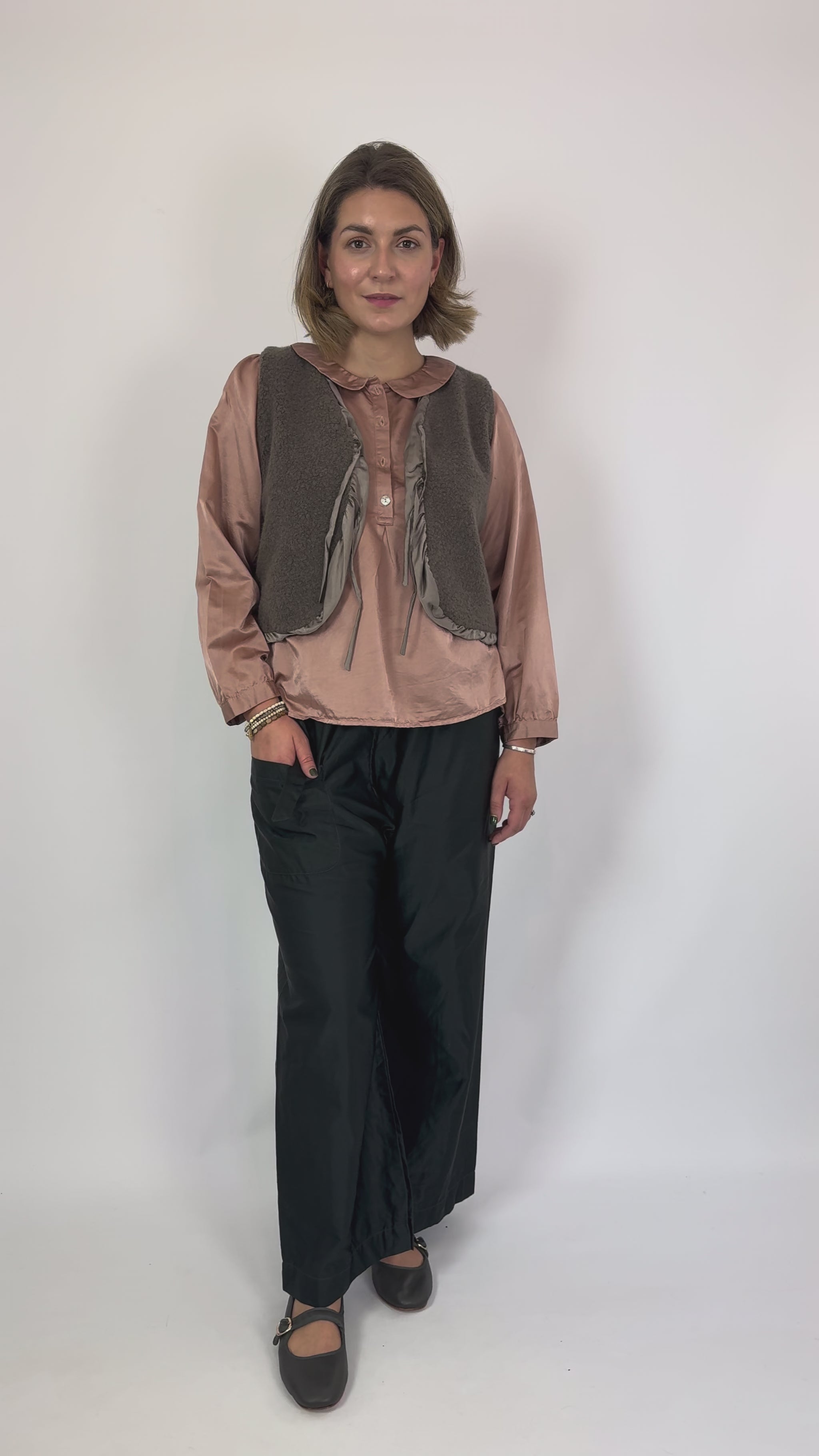 The Sula Tie Vest Funghi features a sleeveless crossover design crafted from a warm, fluffy wool mix fleece, offering cosy comfort and refined texture. Its silk cotton satin lining is intentionally cut slightly larger to create a subtly shrunken silhouette, blending luxury with a relaxed, expert-tailored fit ideal for layering throughout the cooler seasons.