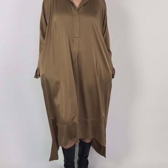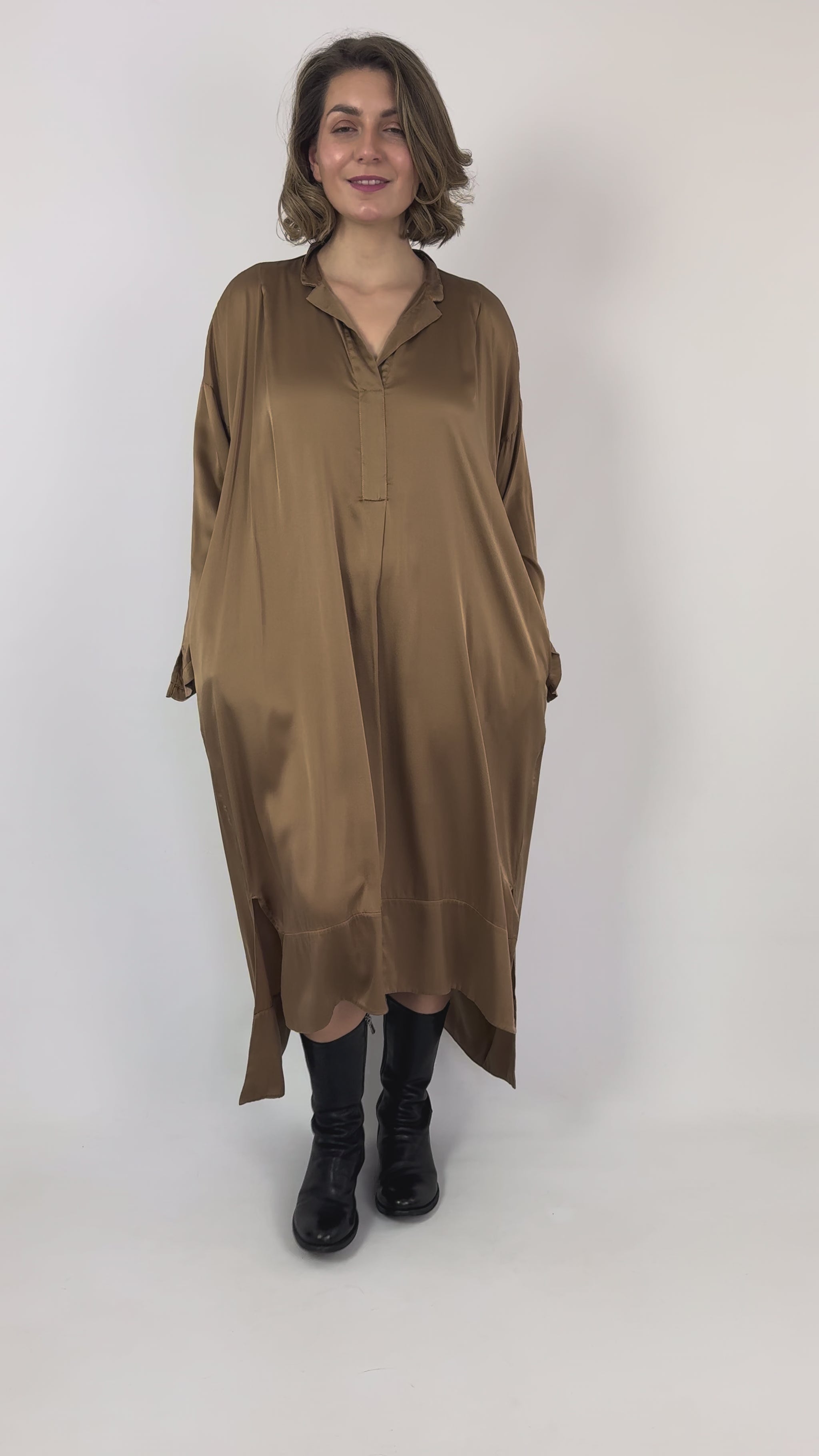 The Tandem 5104 Dress in camel features an oversized, loose silhouette crafted from silky fabric that drapes effortlessly for a flowy, elegant effect. Its longer hem at the back adds a contemporary touch, while the V-neckline enhances its refined, flattering profile—ideal for those seeking comfort and sophistication in one piece.