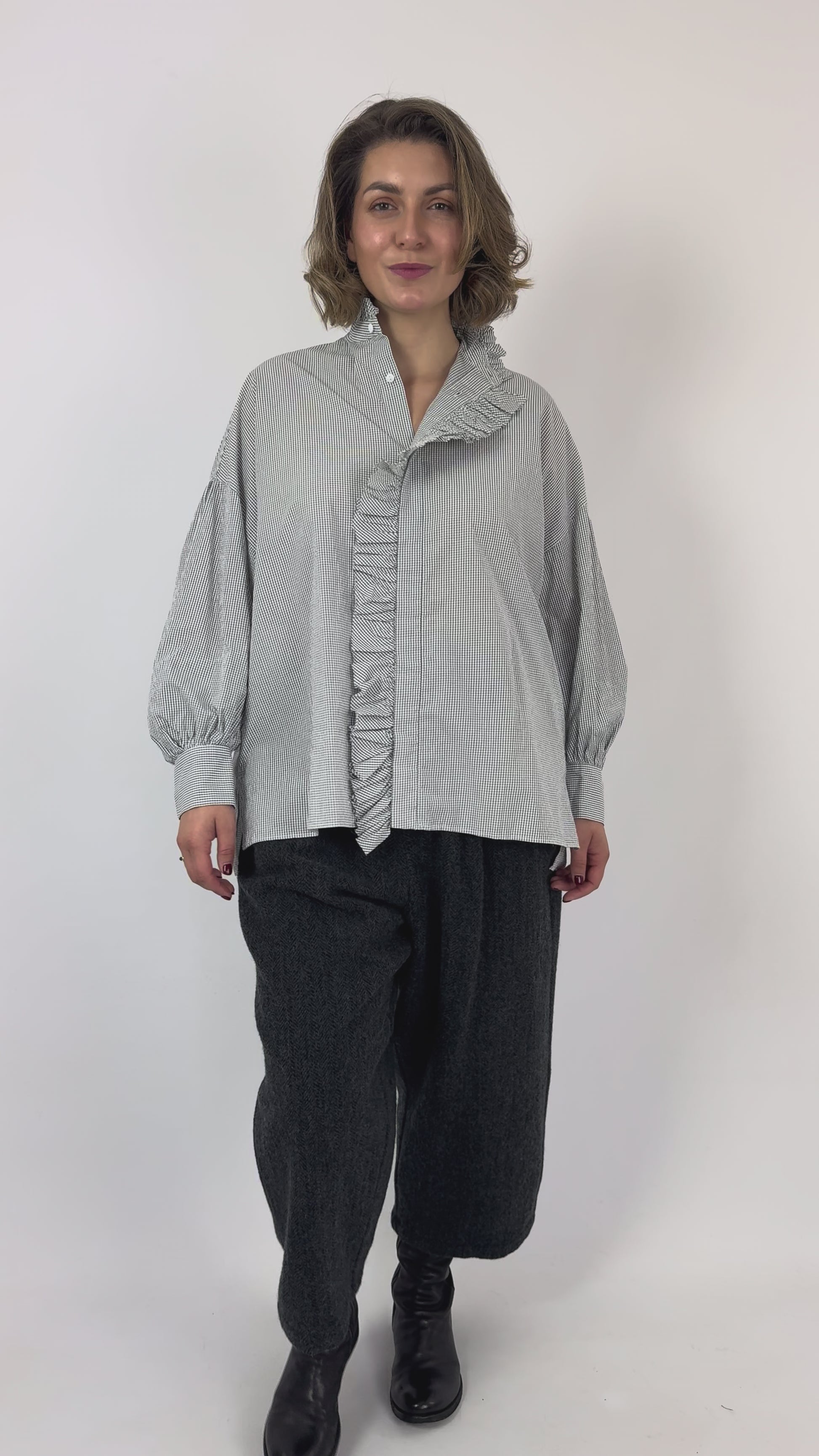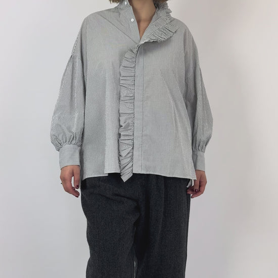 This elegant shirt features a relaxed fit with a ruffled neckline that extends gracefully down the button placket, adding refined detail to the design. Its dropped shoulders and wide balloon sleeves with buttoned cuffs create a sophisticated silhouette while allowing comfortable movement. The crisp white fabric showcases a subtle charcoal check pattern, balancing classic charm with modern style. Ideal for elevating both casual and professional wardrobes.