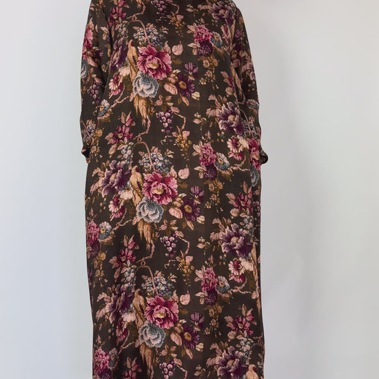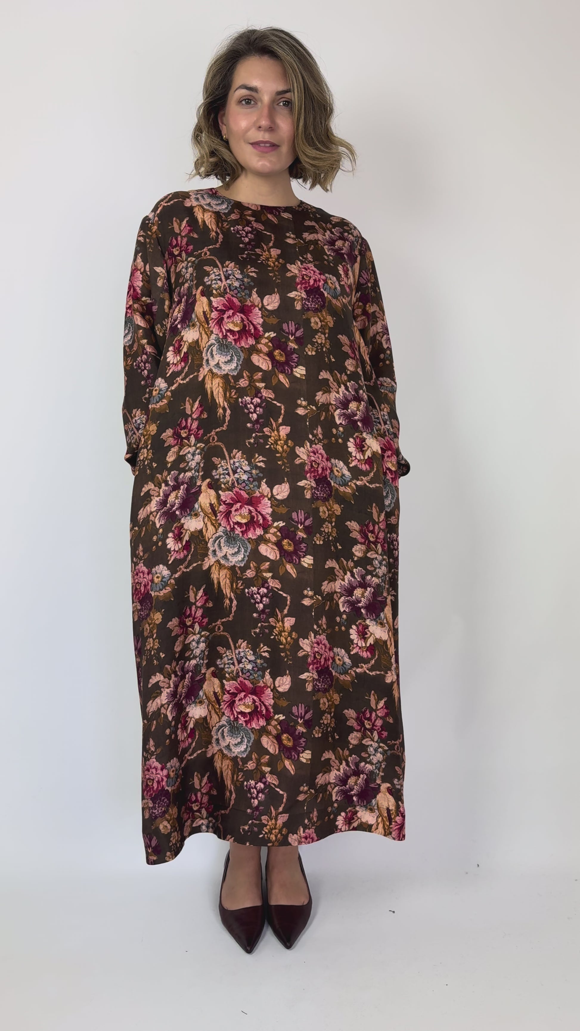 The Tapis Noir Deidre Dress Olive is crafted from a soft, flowing blend of silk and viscose, echoing the fluidity of liquid fabric. Its oversized silhouette gently tapers into a flattering A-shape, providing ease and elegance. The distinctive olive green and brown print is sourced from an exclusive archive of mid-19th century textiles, offering a unique historical touch. Thoughtful details include discreet side seam pockets and a delicate bioresin button at the back neckline, combining refined craftsmanship with subtle functionality.