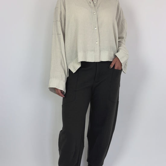 Crafted from a premium blend of linen and cotton, the Transit Par-Such E140 Shirt in Chalk features a natural color with subtle stripes for a refined look. Designed with expert tailoring, it includes a classic collar, button-front closure, and detailed seams that enhance its structure and fit. This shirt offers breathable comfort while maintaining a sophisticated edge, making it a versatile addition to any wardrobe.