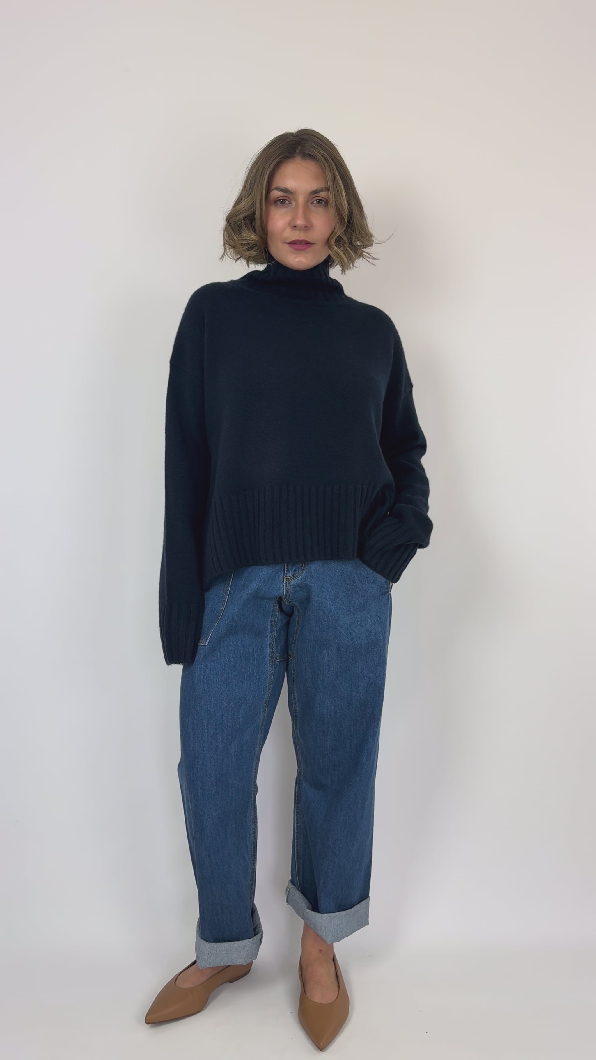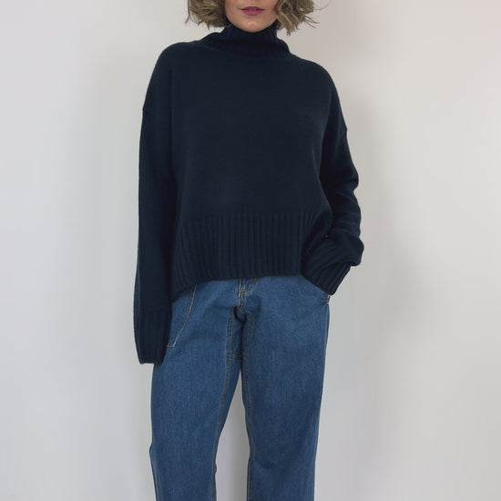 Expertly crafted with cashmere, the Vic & Bert Fred Jumper in navy offers a luxurious chunky knit and an oversized fit for ultimate comfort. Complete with a chic roll neckline and small side splits, this jumper is the perfect addition to your winter wardrobe.
